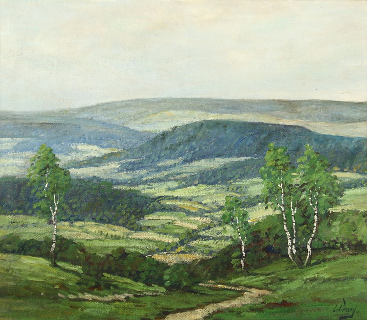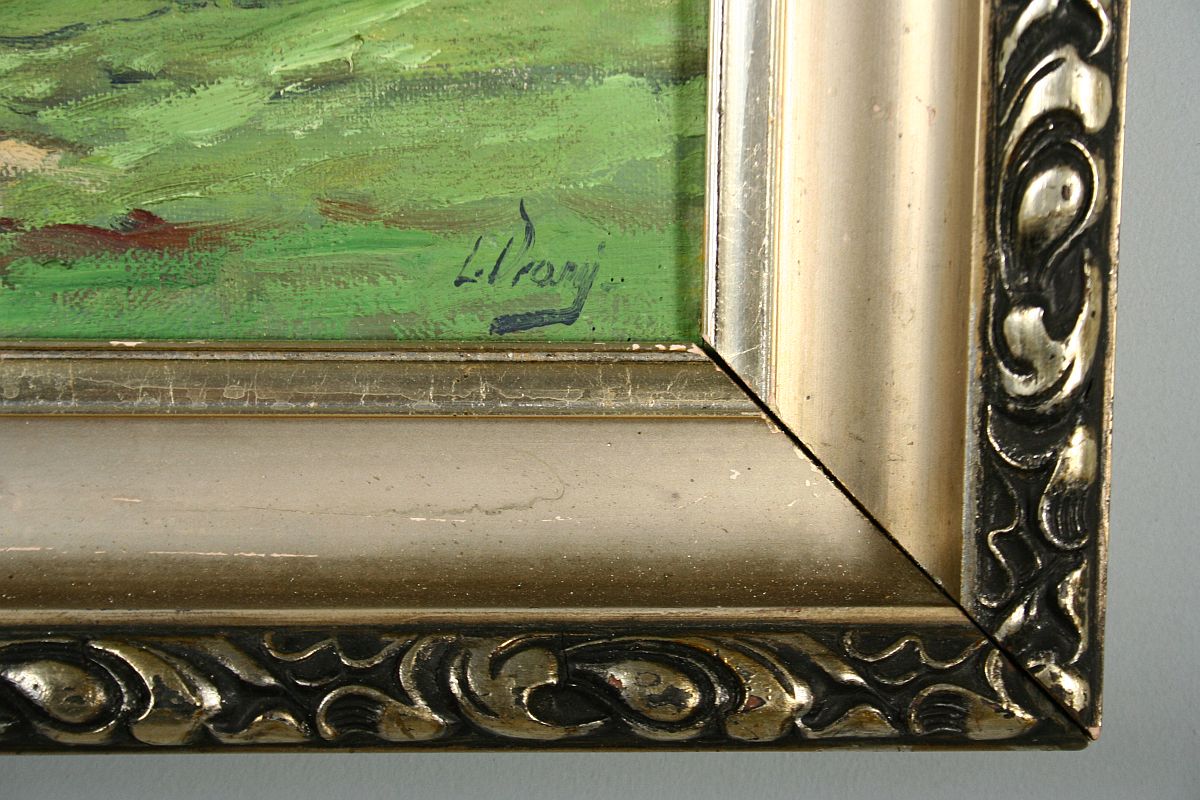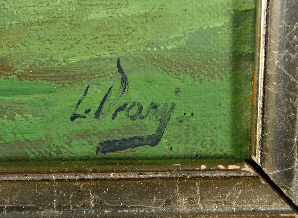 rozhled do krajiny, olej na plátně, ve výřezu 33 x 38,5 cm s rámem 45 x 50,5 cm, autor L. Vraný, podepsáno vpravo dole, rámováno ve zdobeném rámu