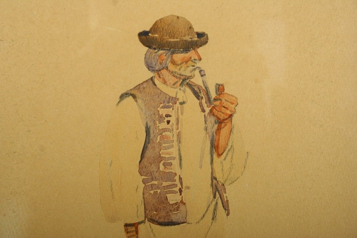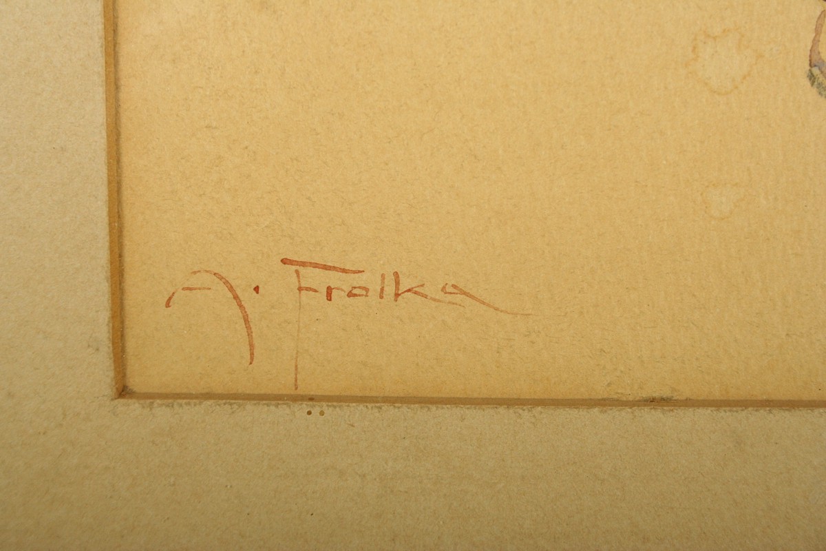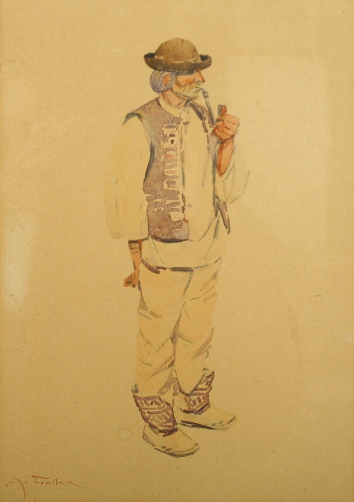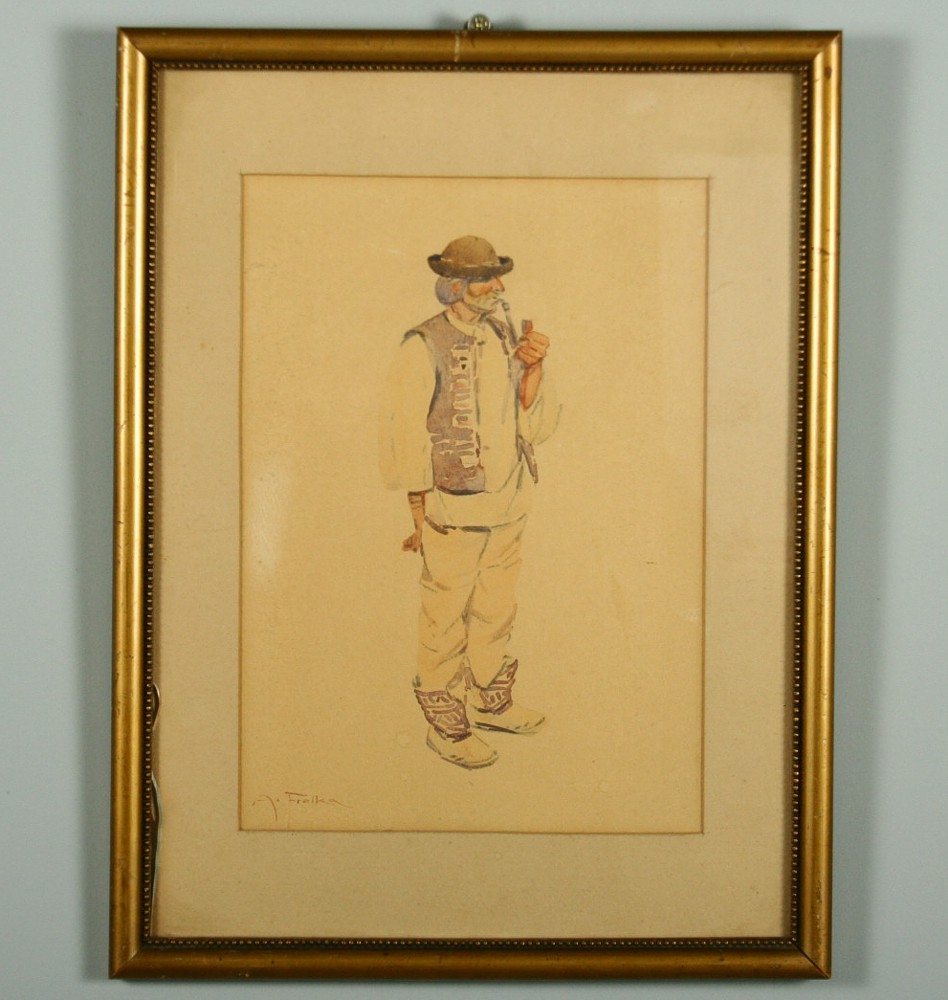 muž s dýmkou, akvarel na papíře, ve výřezu 28 x 20 cm s rámem 41 x 31 cm, autor AntošFrolka podepsáno vlevo dole akvarelem A. Frolka, rámováno v původní paspartě a rámu pod sklem