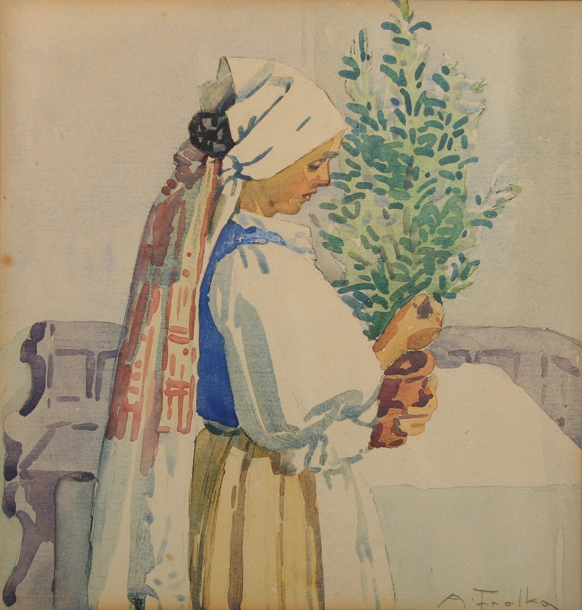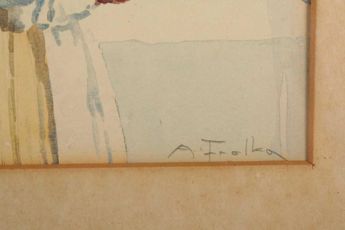 dívka s květinou, akvarel na papíře, ve výřezu 18 x 17 cm s rámem 38 x 33 cm, autor Antoš Frolka podepsáno vpravo dole akvarelem A. Frolka, rámováno v původní paspartě a rámu pod sklem