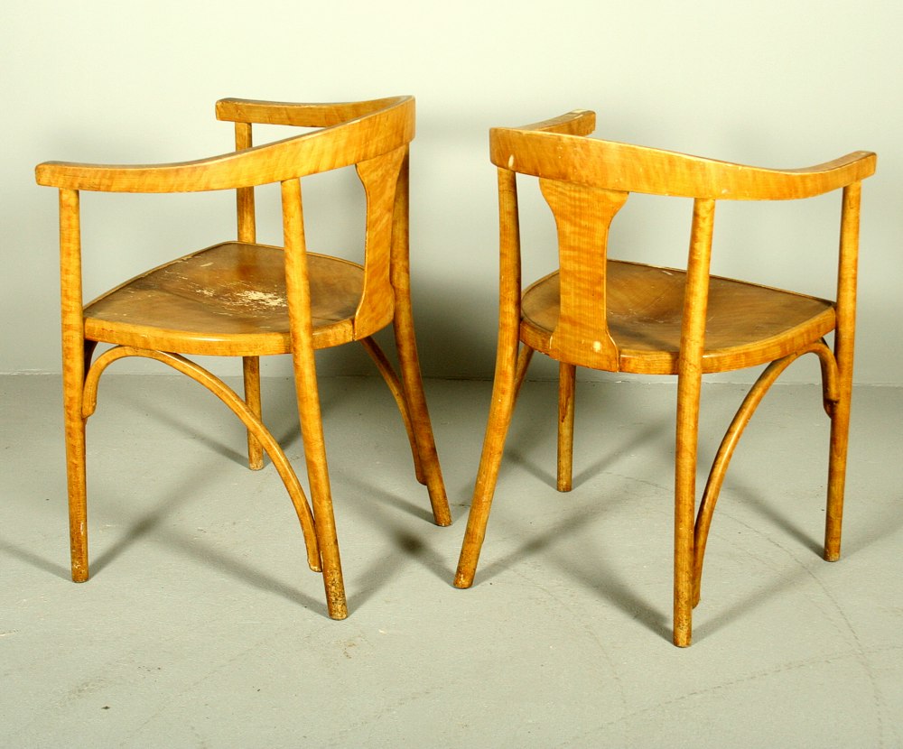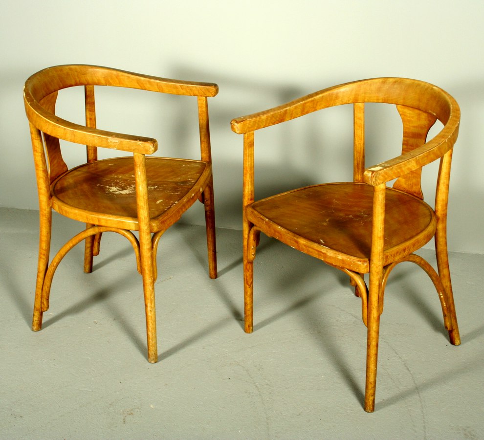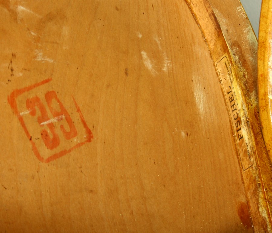 dřevěná křesílka z ohýbaného masivního bukového dřeva značky Fischel, značené na spodí straně firemním štítkem