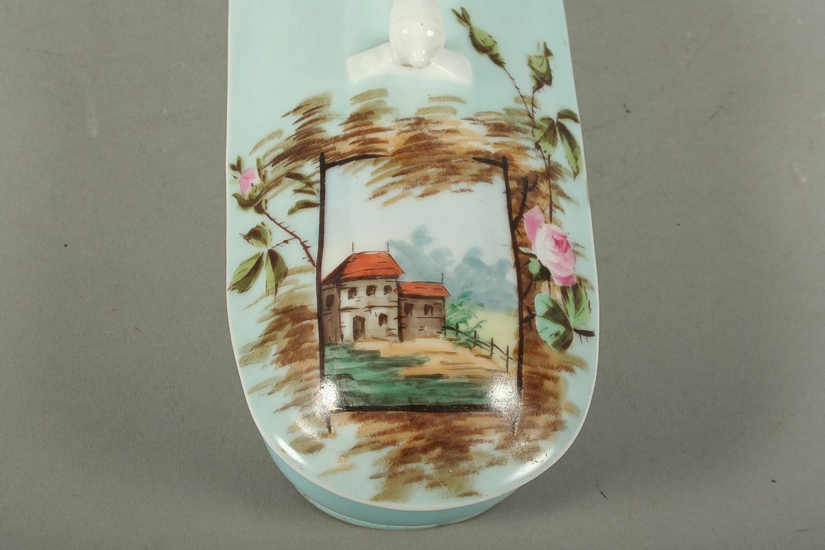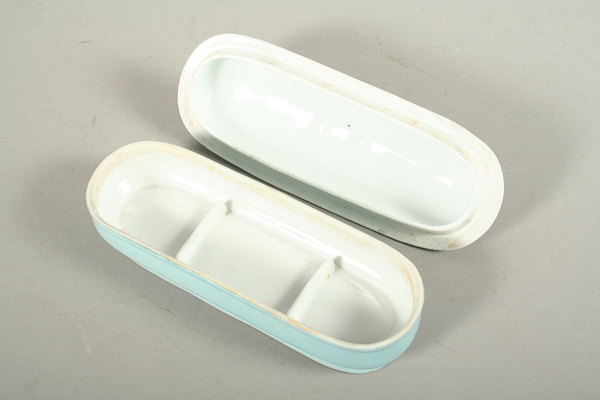 dóza na mýdlo s malovaným víkem, býlý porcelán značený na dně tlačenou značkou Loket, 19. století, 8 x 24 cm