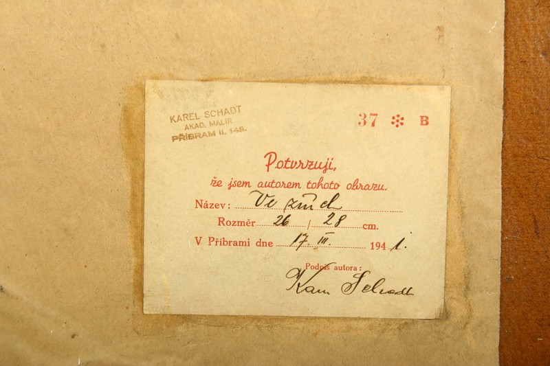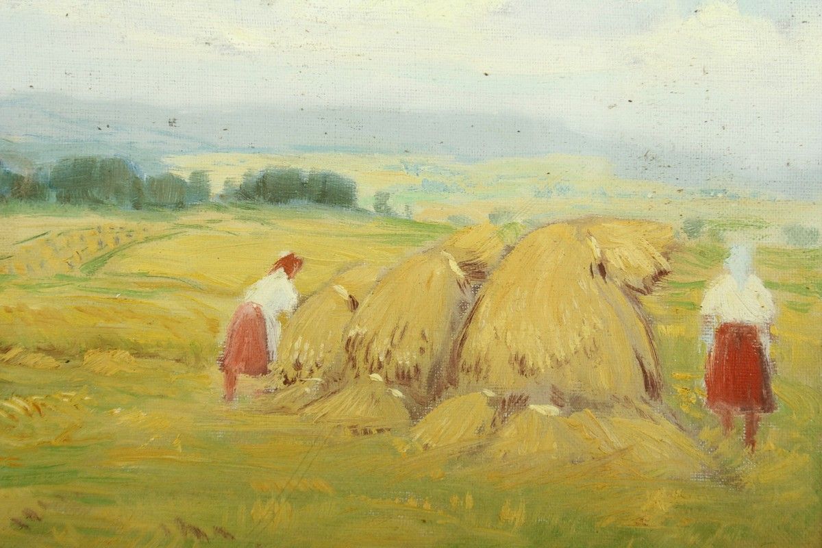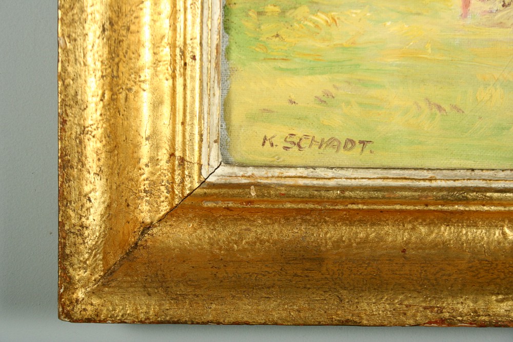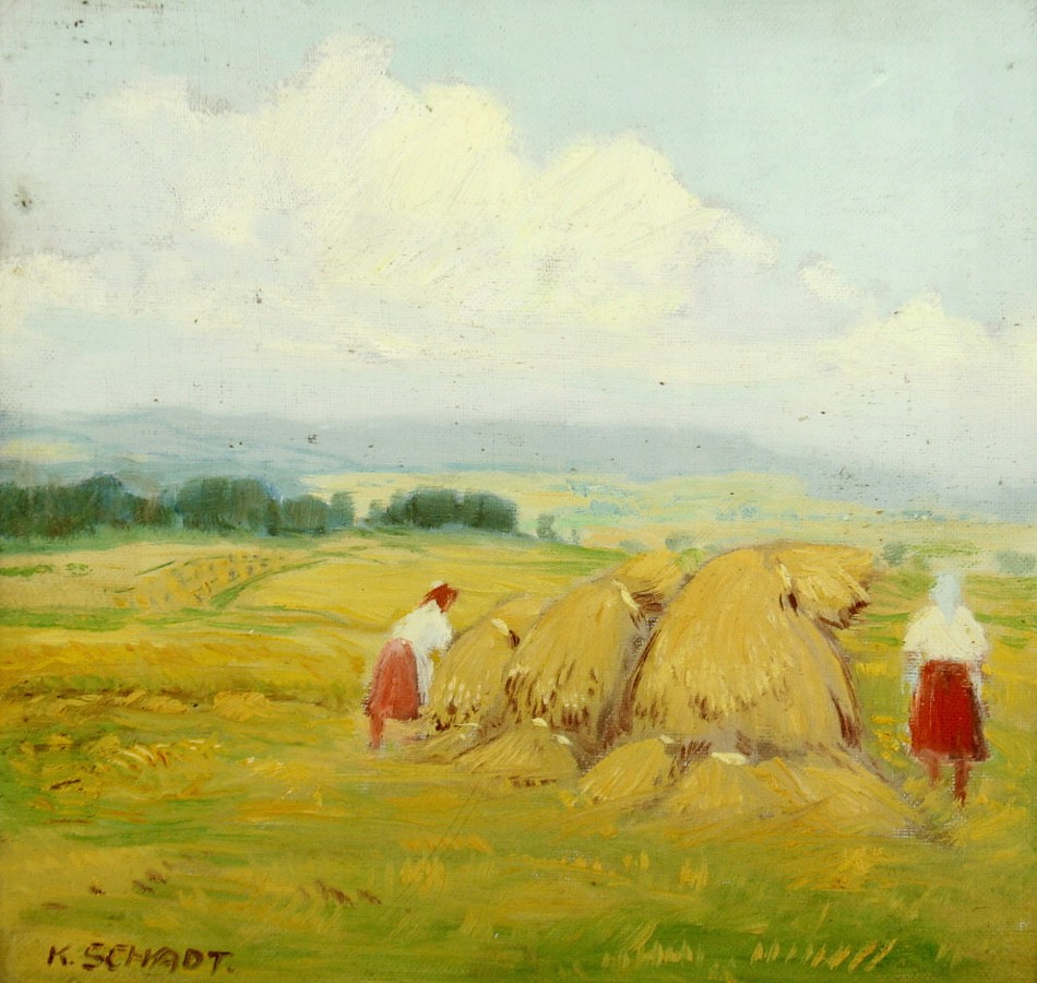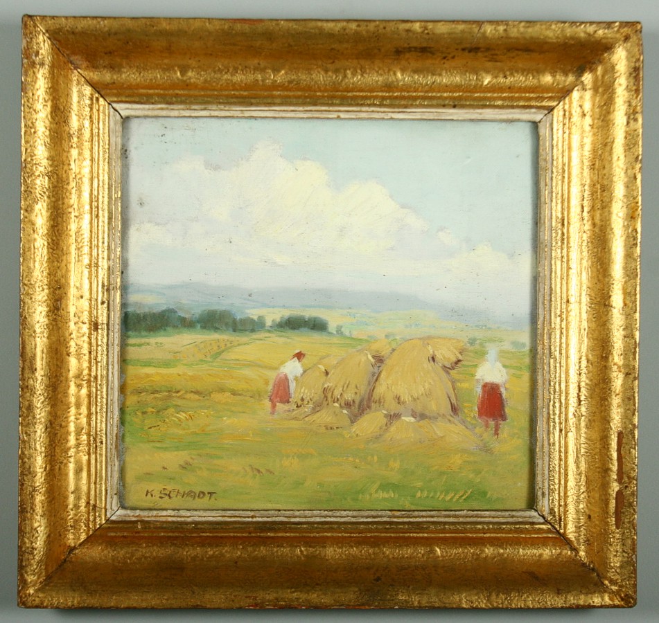 obraz hrabání slámy o žních, olej na plátně lepené na kartonu 26 x 28 cm s rámem 37 x 39 cm, autor Karel Schadt, pěkná svěží malba českého krajináře a žáka A. Kalvody na zadní straně autorský štítek s razítkem a vlastnoruční přípis, rámováno v původním rámu pod sklem