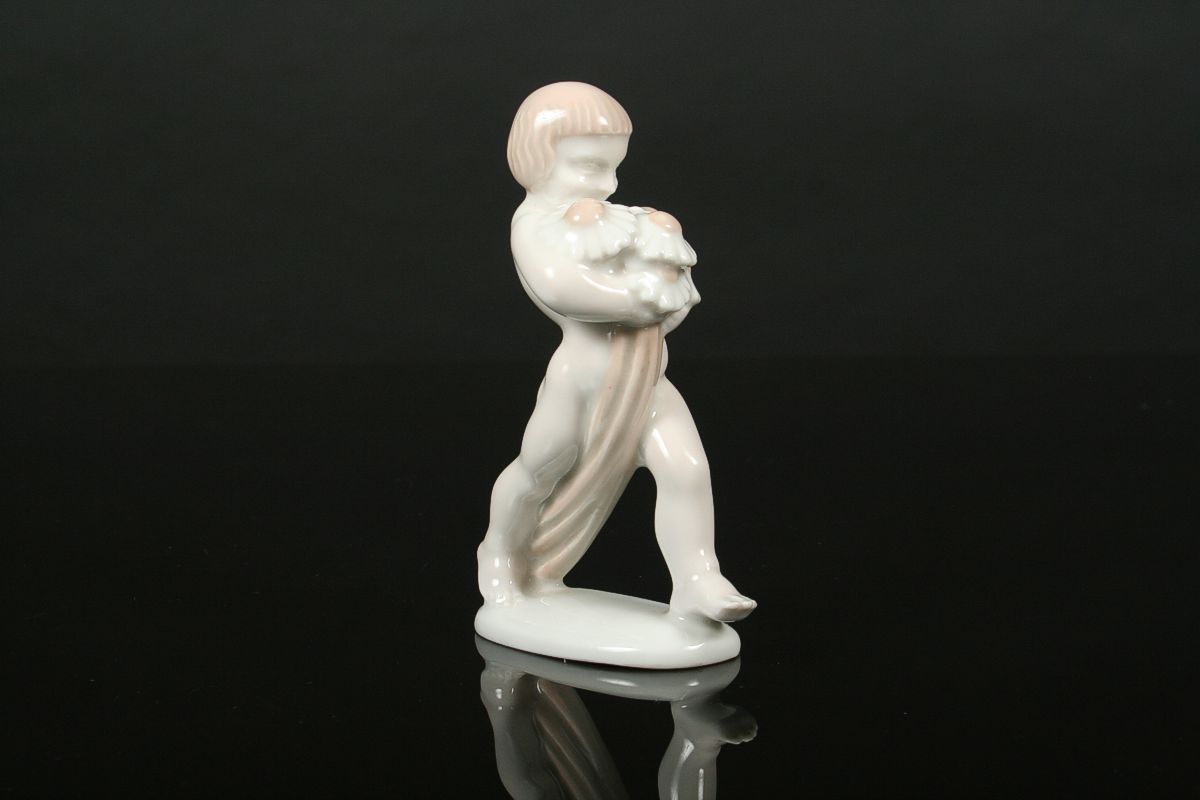 porcelánová figurka děvčátka nesoucí náruč květin, stylizovaně malovaný porcelán na dně značený tištěnou značkou Rosenthal a tlačenými čísly, návrh číslo K. 057, autor Albert Caasmann kolem roku 1915 ve stylu art deco, 1. polovina 20. století, značeno na podstavci tlačené A. Caasmann, 11,5 cm, bez poškození v perfektním stavu