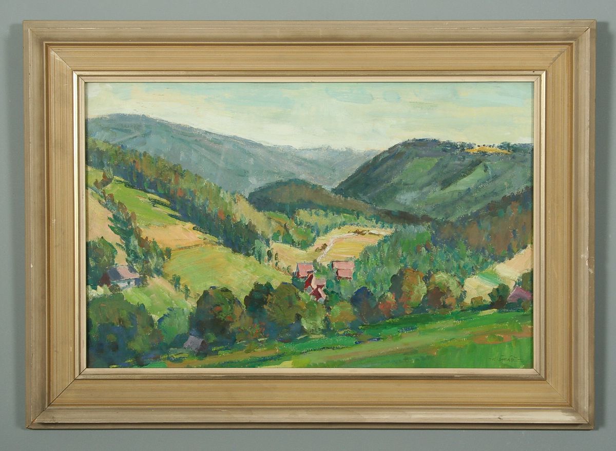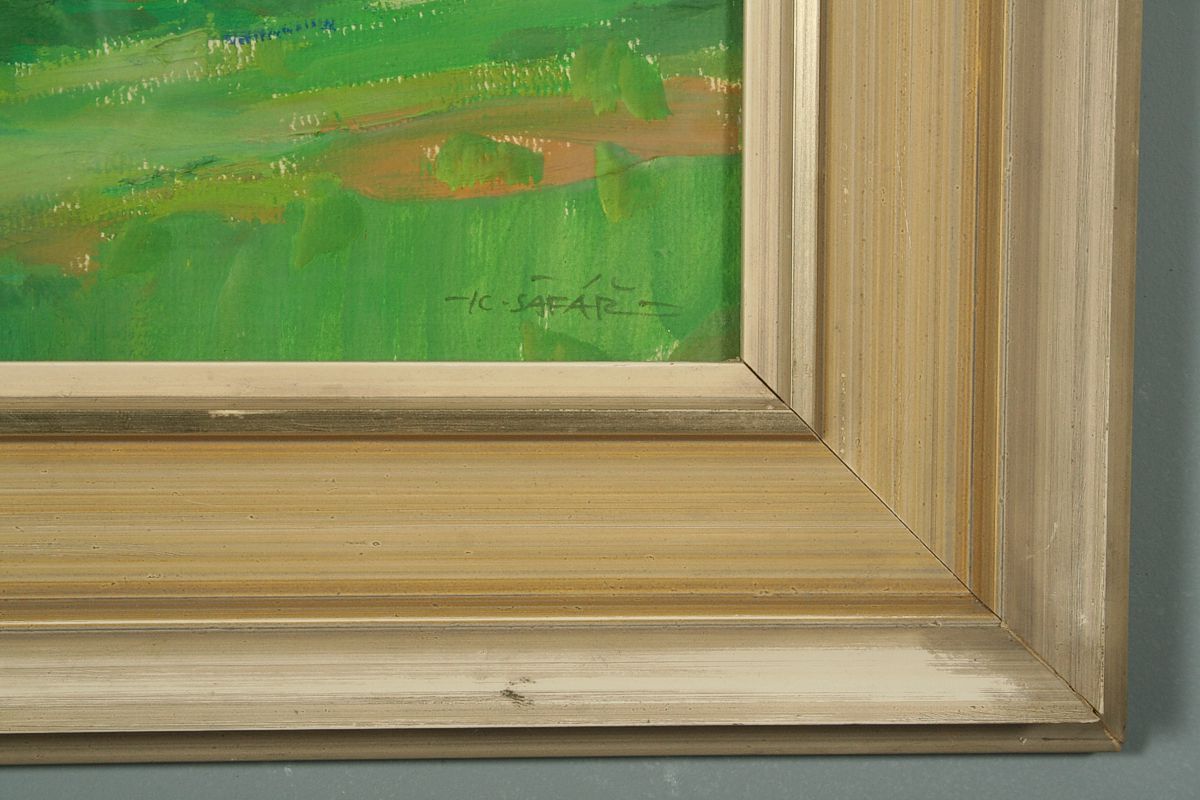 obraz letní krajiny s názvem "Pekelské stráně 1979" pohled od Lipí na údolí Metuje v Pekle, olej na kartonu, 37 x 57 cm s rámem 53 x 73 cm, autor Karel Šafář, podepsáno vpravo dole K. Šafář 1979, na zadní strně autorský přípis s podpisem, rámováno v původním rámu pod sklem