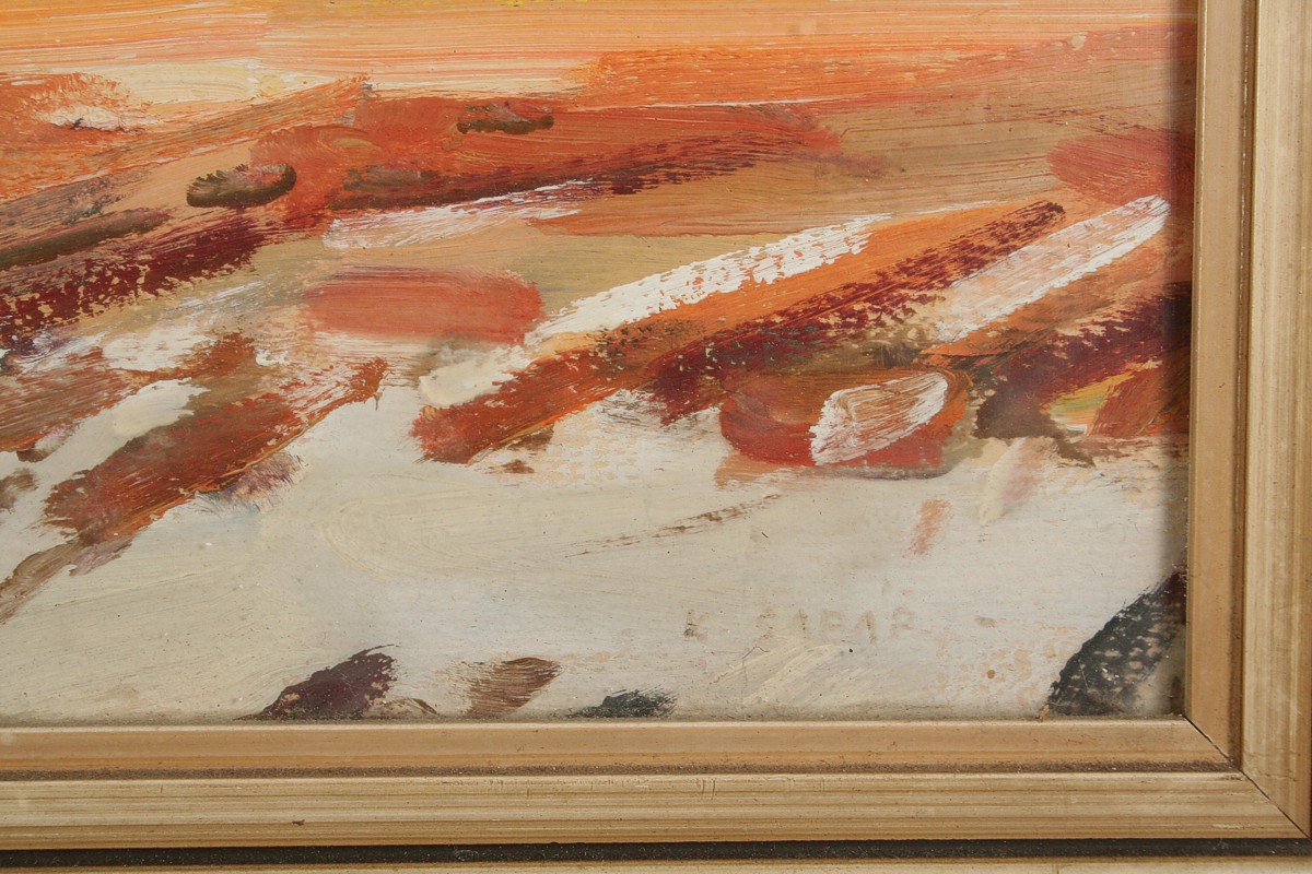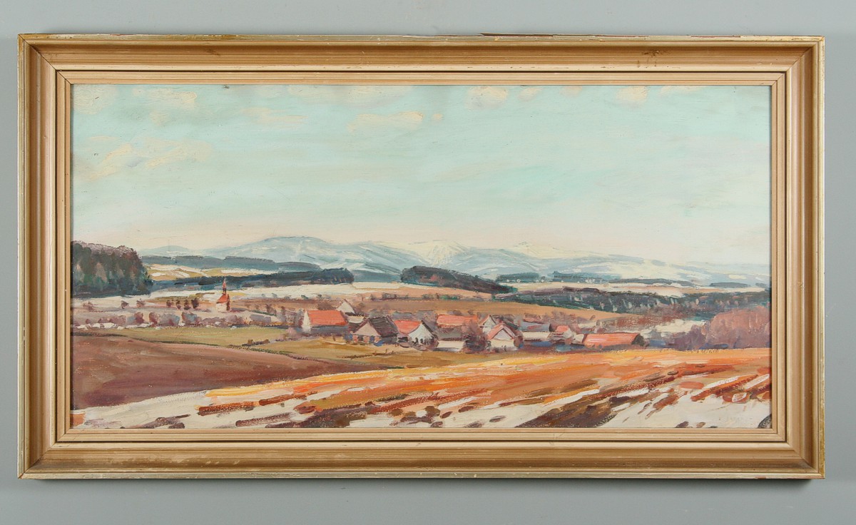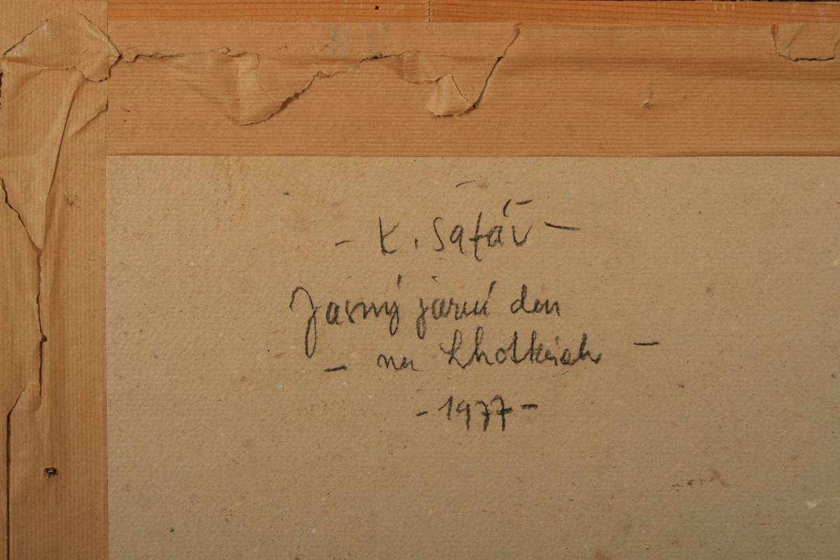 obraz podhorské jarní krajiny, rozsáhlý pohled na Lhotky u Náchoda s Krkonošemi v pozadí, olej nakartonu 40 x 80 cm s rámem 50 x 89 cm, autor Karel Šafář, podepsáno vpravo dole K. Šafář na zadní straně autodedikace Jasný jarní den na Lhotkách 1977, rámováno