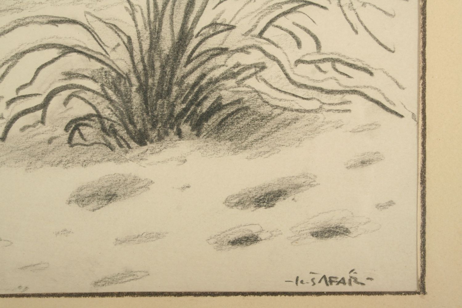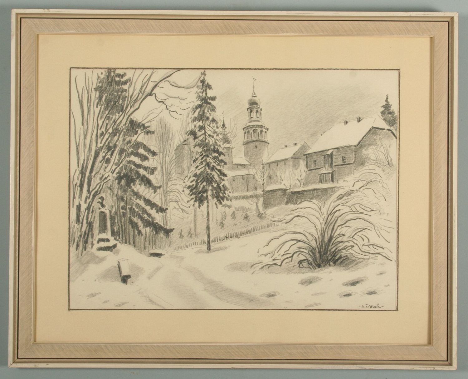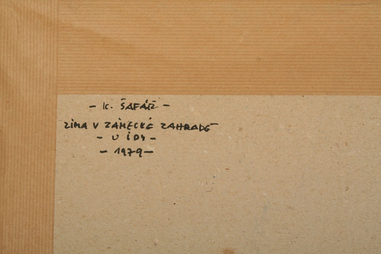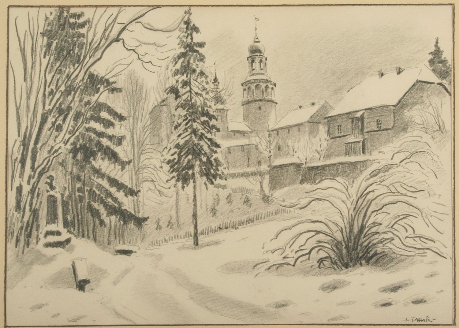 zimní pohled na náchodský zámek od Idy, kresba na papíře, ve výřezu 32 x 44 cm s rámem 47 x 59 cm, autor Karel Šafář, podepsáno vpravo dole K.Šafář ze zadu autorský přípis s datací 1979 a určením, rámováno v paspartě a rámu pod sklem