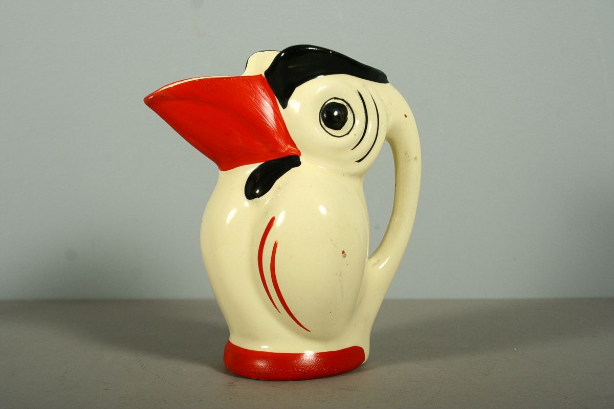 džbánek tvaru tukana, malovaná keramika ve stylu art deco, značený tištěnou značkou Ditmar Urbach, 15 x 14 cm