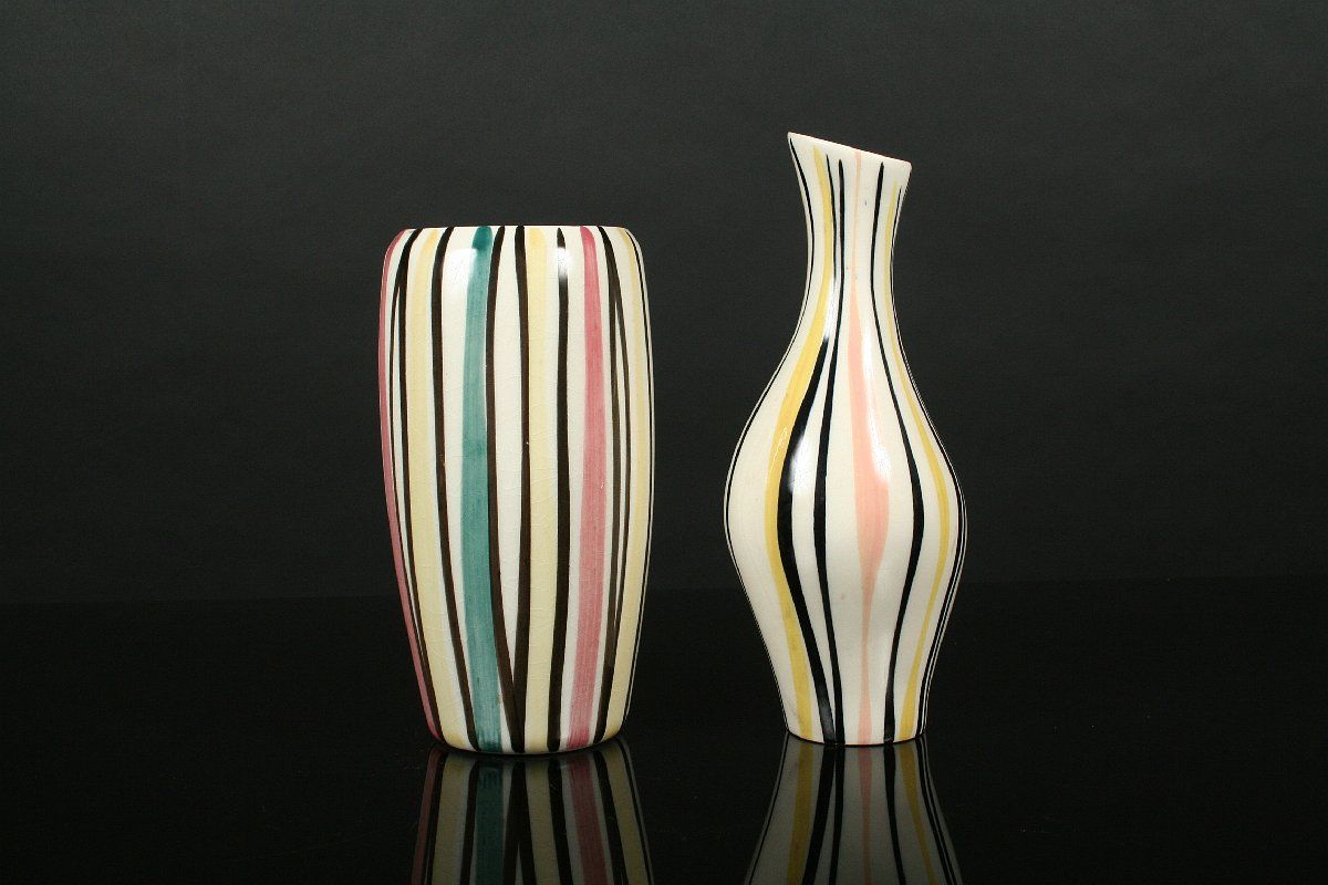 vázy ve stylu Brusel, malovaná keramika, jedna značená Ditmar Urbach tištěnou značkou, 60. léta 20. století, 24 a 20 cm, cena za jeden kus 950,-Kč za oba 1490,-Kč