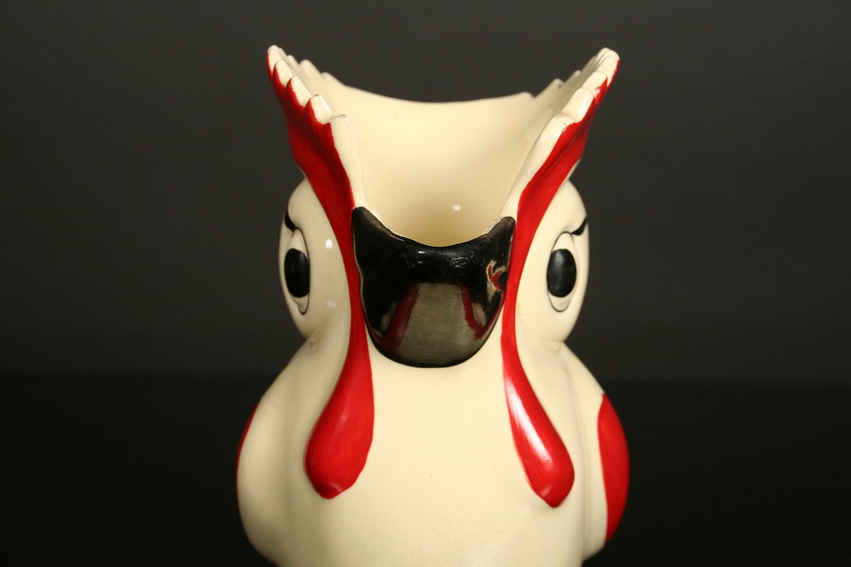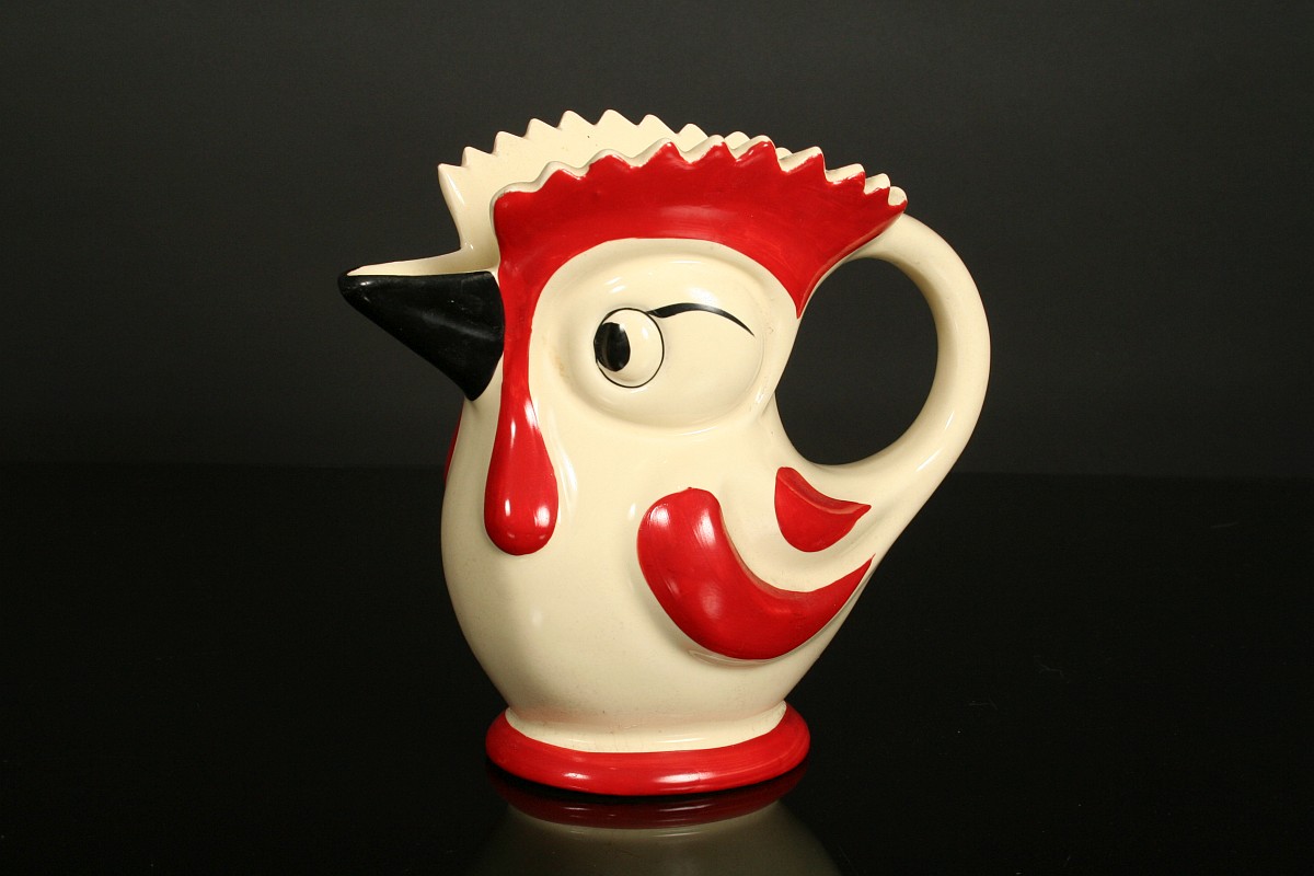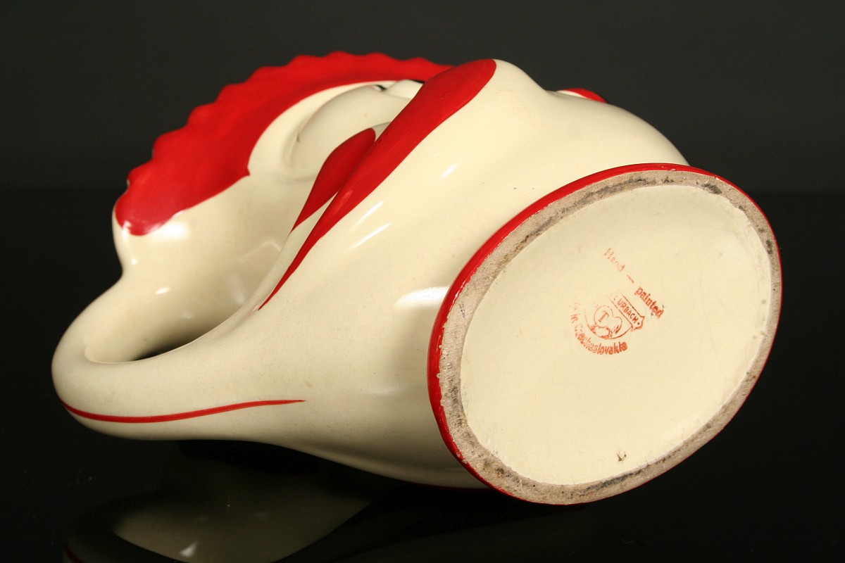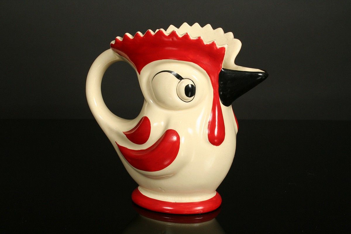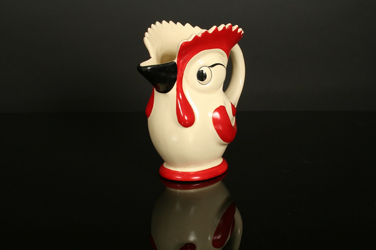 velká konvička nebo džbánek tvaru kohouta, malovaná keramika ve stylu art deco, značený na dně tištěnou značkou Ditmar Urbach, 19 x 20 cm