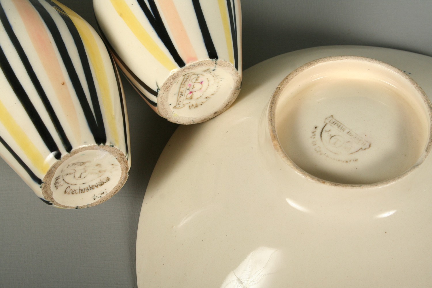 keramická miska a dvě vázičky na kvítka, dekorované barevnými linkami ve stylu 60. let, na dně značeno Ditmar Urbach, vázy 16 cm, miska 17 x 14 x 6 cm