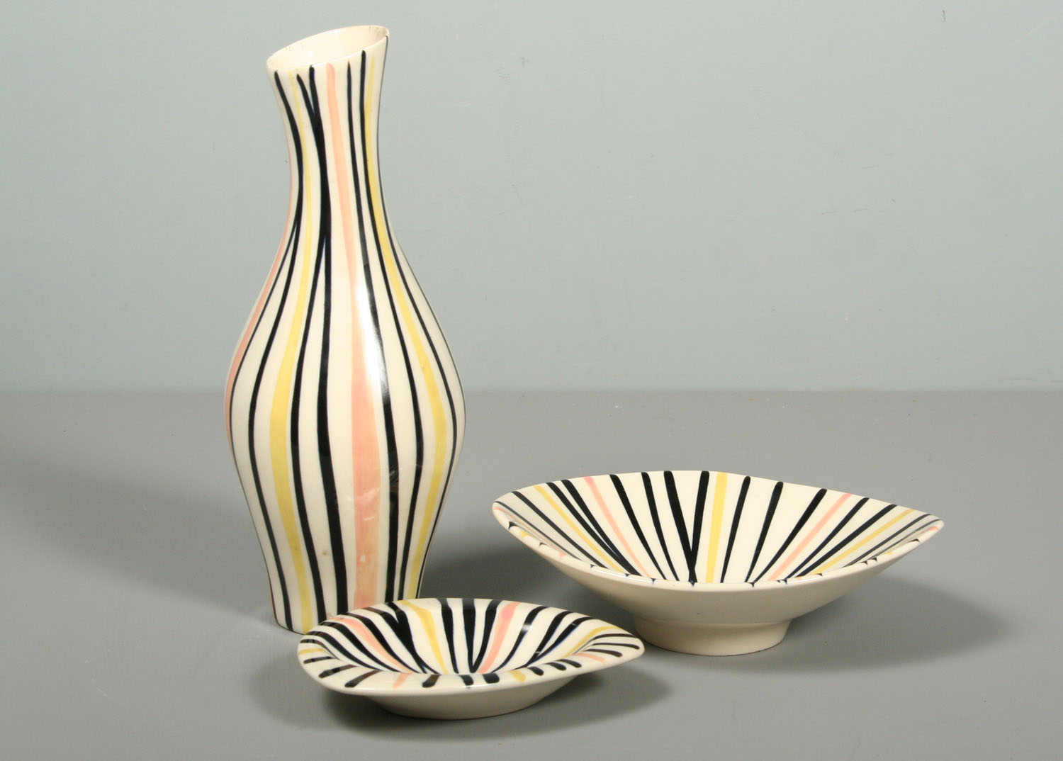 keramická váza a dvě misky, dekorované barevnými linkami ve stylu 60. let, na dně značeno Ditmar Urbach, váza 24 cm, miska 18 x 14,5 x 6 cm a menší 13 x 11 x 2,5 cm