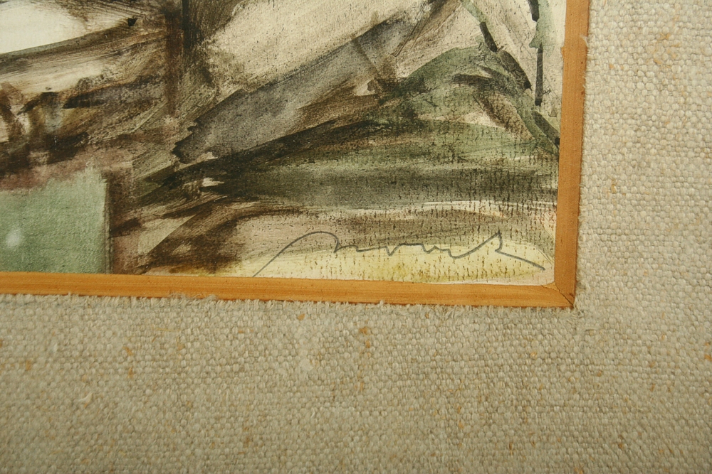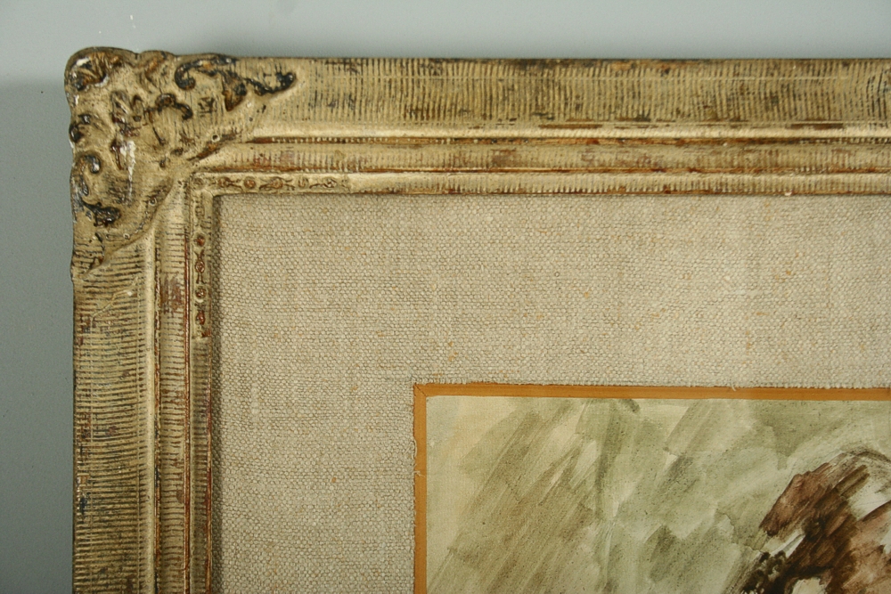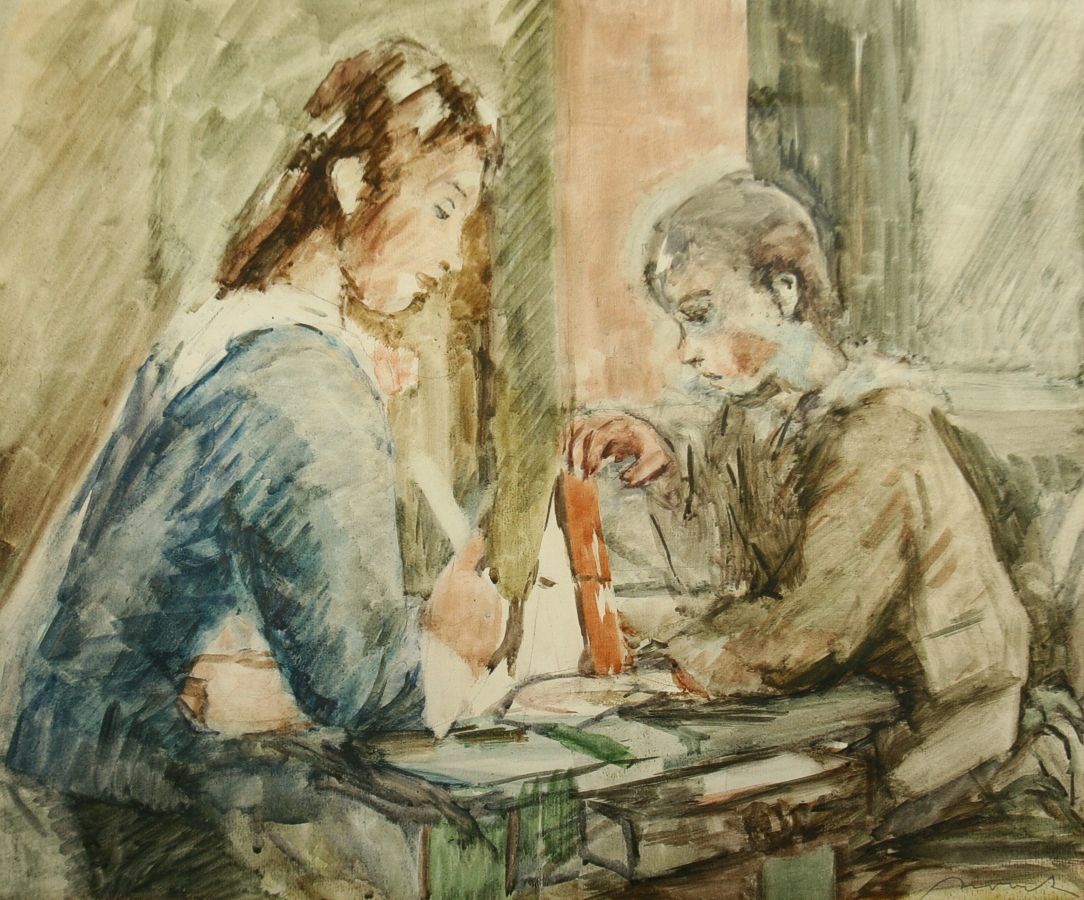 obraz mladé matky a syna, nebo sourozenců u stolu, akvarel na papíře, ve výřezu 38 x 46 cm s rámem 66 x 73 cm, autor Willy Nowak, podepsáno vpravo dole tužkou Nowak, na zadní straně přípis Dr. Borovička původní majitel zakoupil přímo ze sbírky Dr. Borovičky v 50. letech, rámováno v paspartě a půvdním zdobeném rámu pod sklem