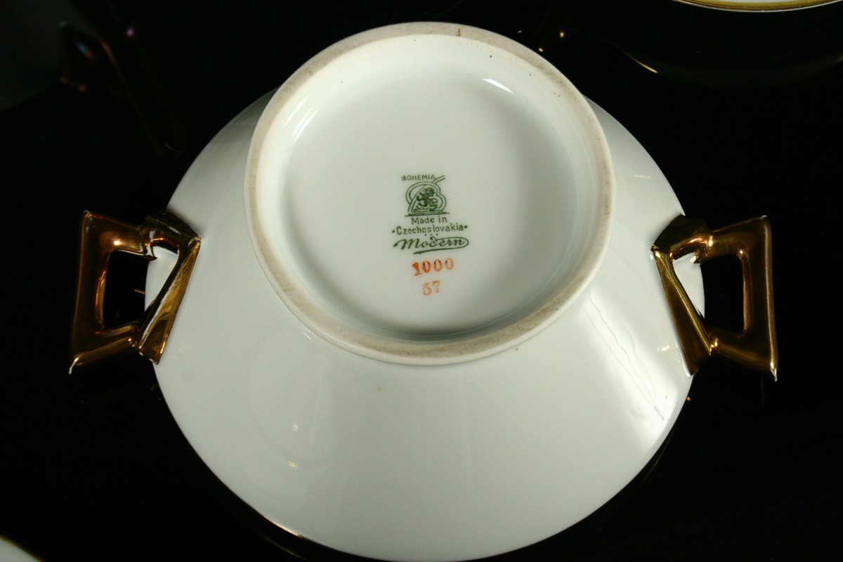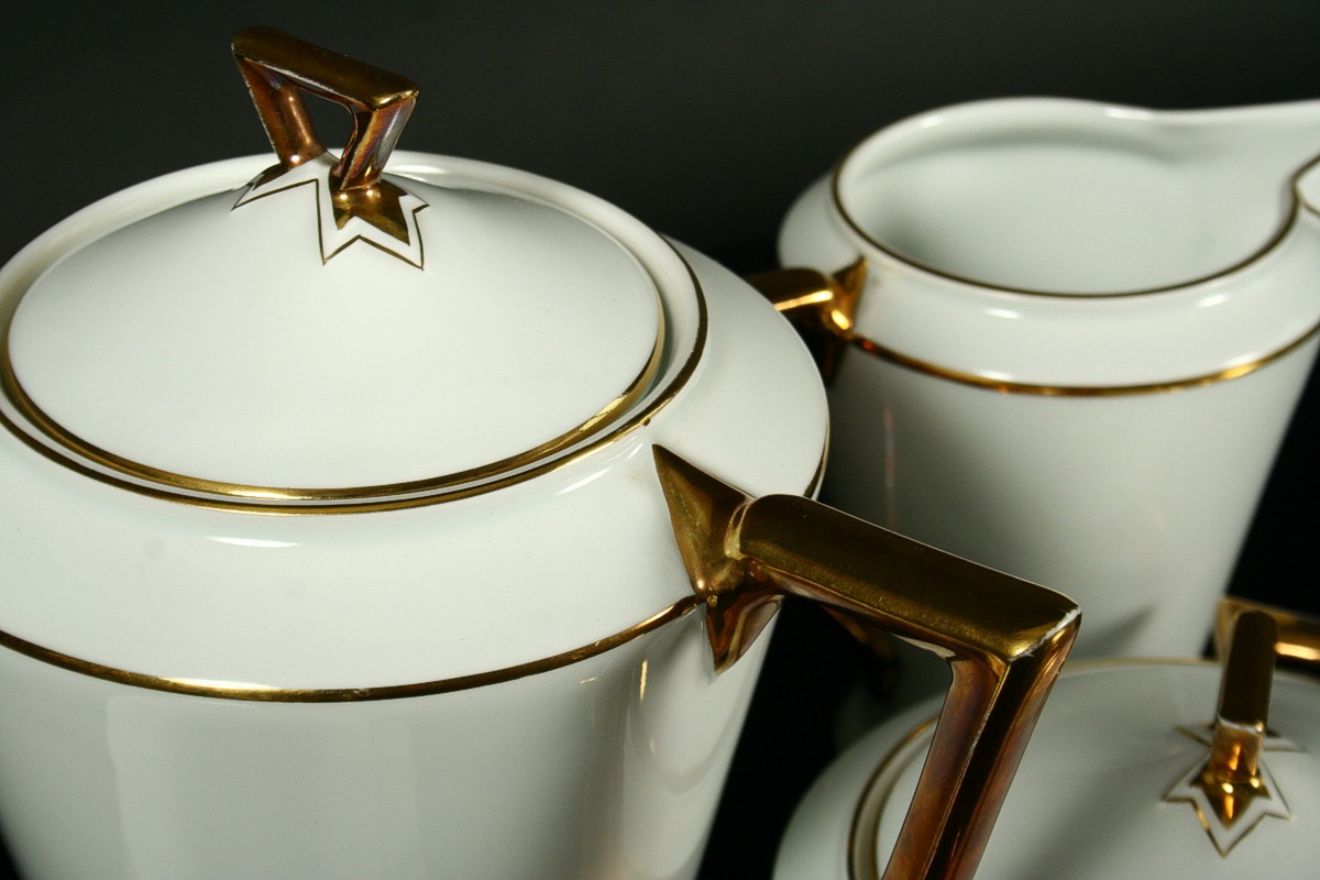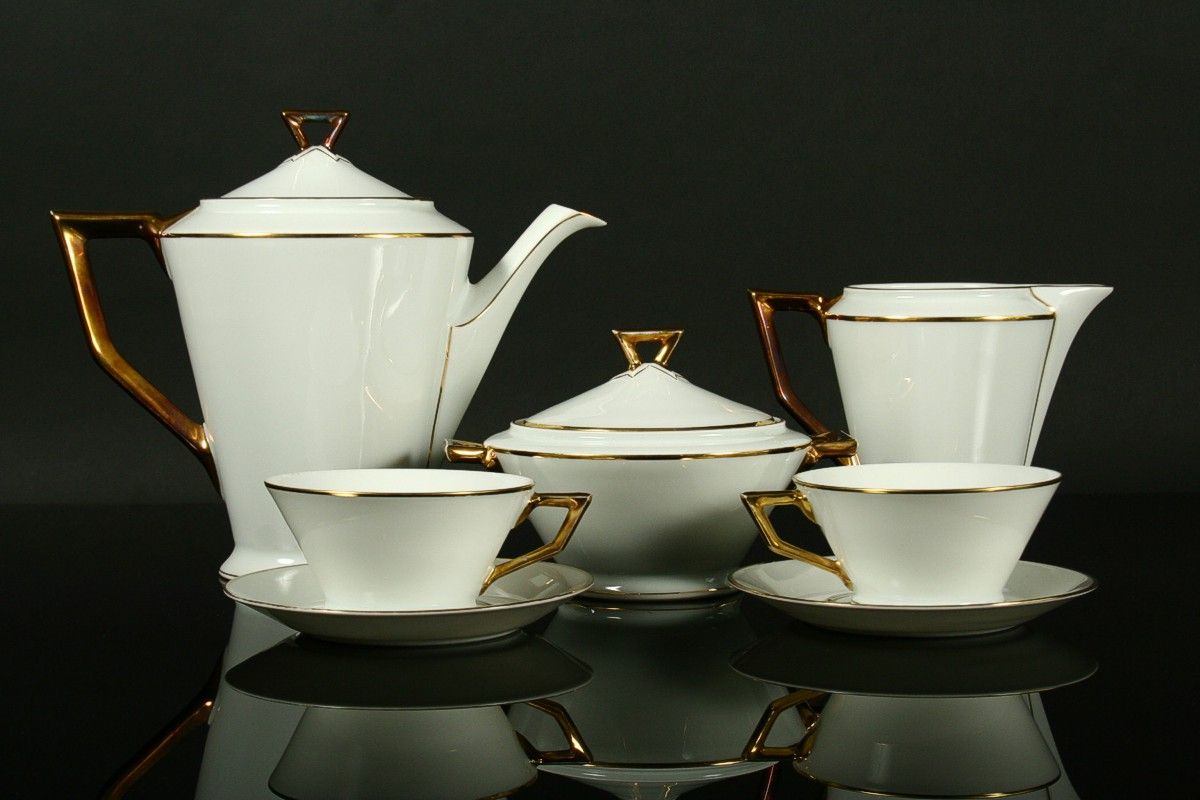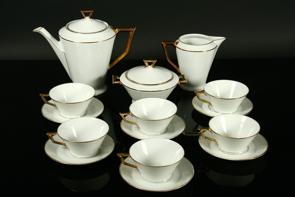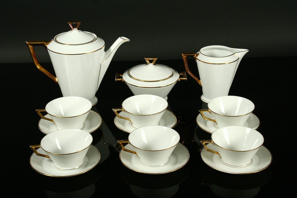 kompletní 6ti osobní servis z bílého porcelánu čistých geometrických tvarů zdobený zlatem v moderním stylu 30. let art deco, konvice s mléčenkou, cukřenkou, 6 x šálek s podšálky, značený tištěnou značkou Nová Role Bohemia