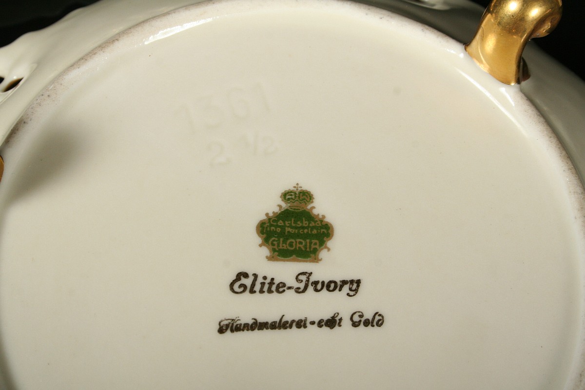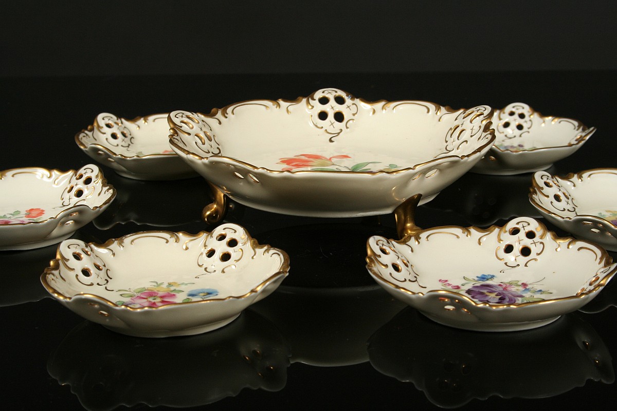porcelánová ručně malovaná desertní souprava, misky na drobné pochutiny, cukrovinky, nebo oříšky, fajnový porcelán v barvě slonové kosti, rokajovité tvary v rokokovém stylu, rokajovité okraje po obvodu perforované, jedna větší miska na třech nožkách, 5 x 16,5 cm, a šest menších misek, všechny s centrálním, ručně malovaným motivem pestrých květin, všechny kusy značeny na dně Carlsbad Gloria Elite-Ivory (Nová Role)