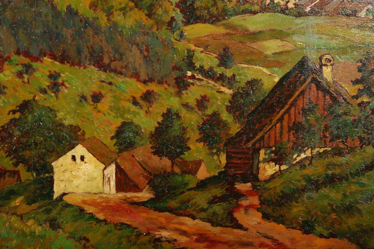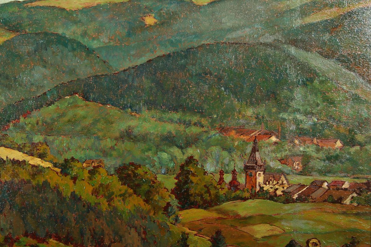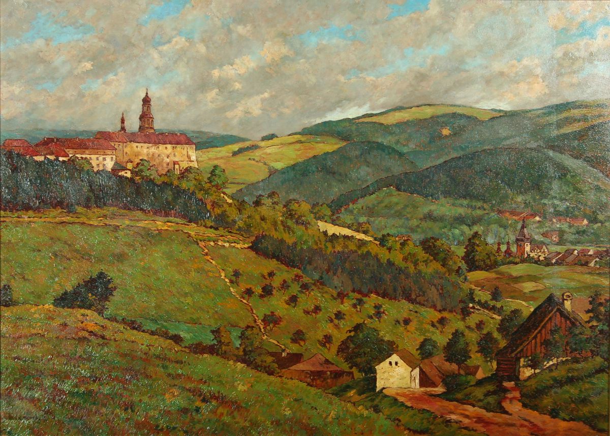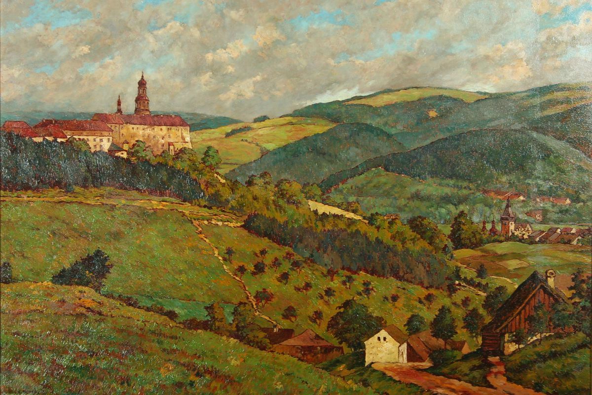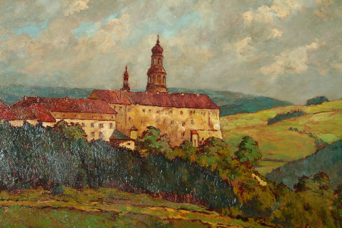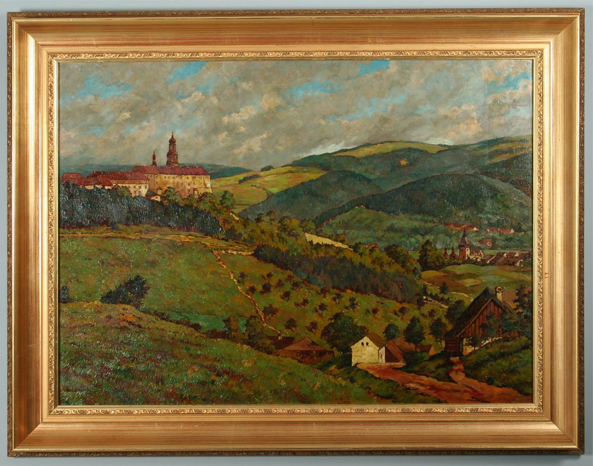 velký obraz, působivý pohled na náchodský zámek s kotlinou, olej na desce ze silného kartonu 68 x 95 cm s rámem 88 x 114 cm, autor Karel Beneš, podepsáno vlevo dole K. Beneš na zadní straně přípis s věnováním z roku 1925, rámváno