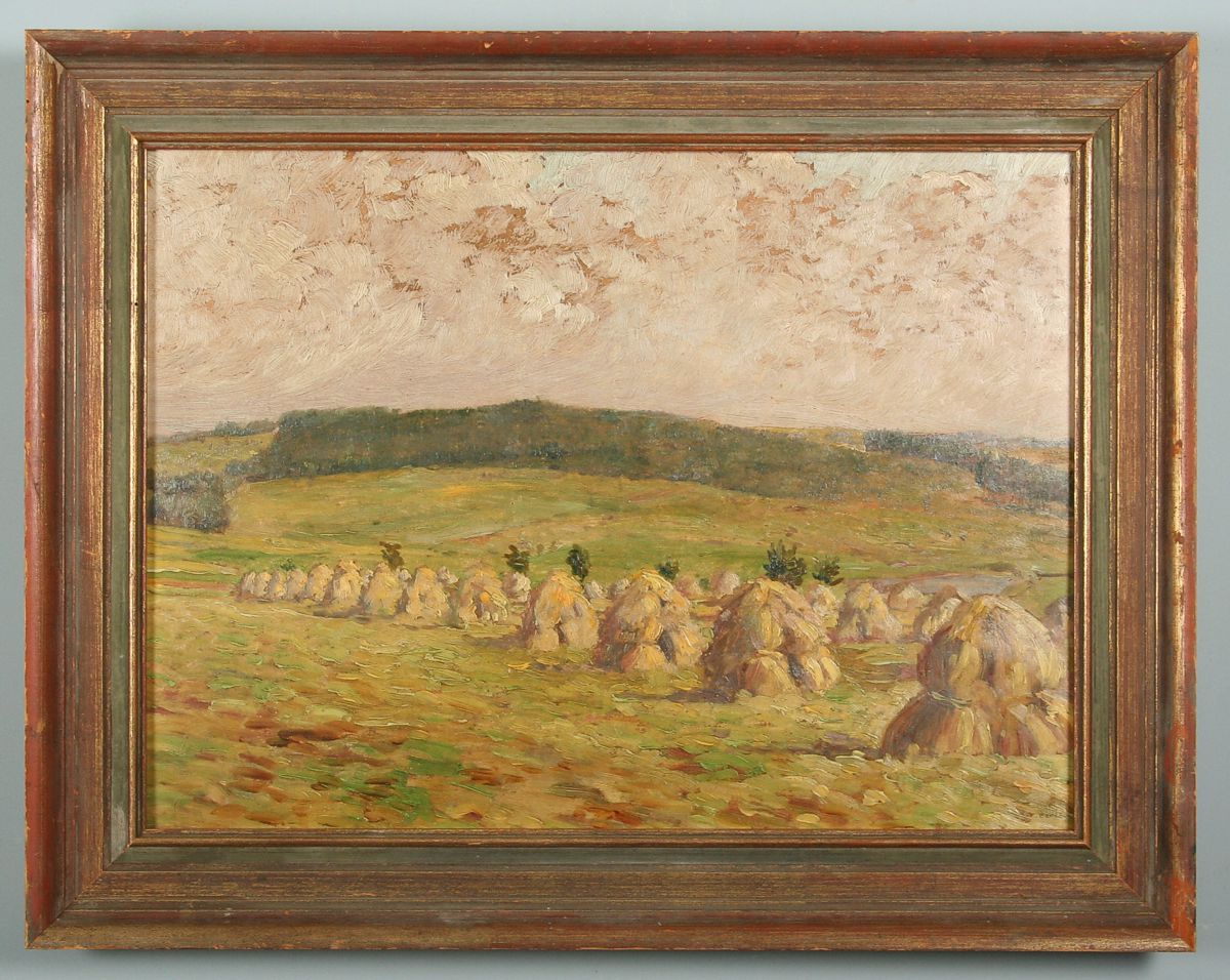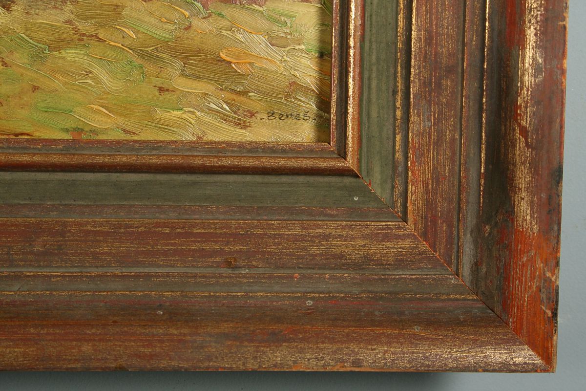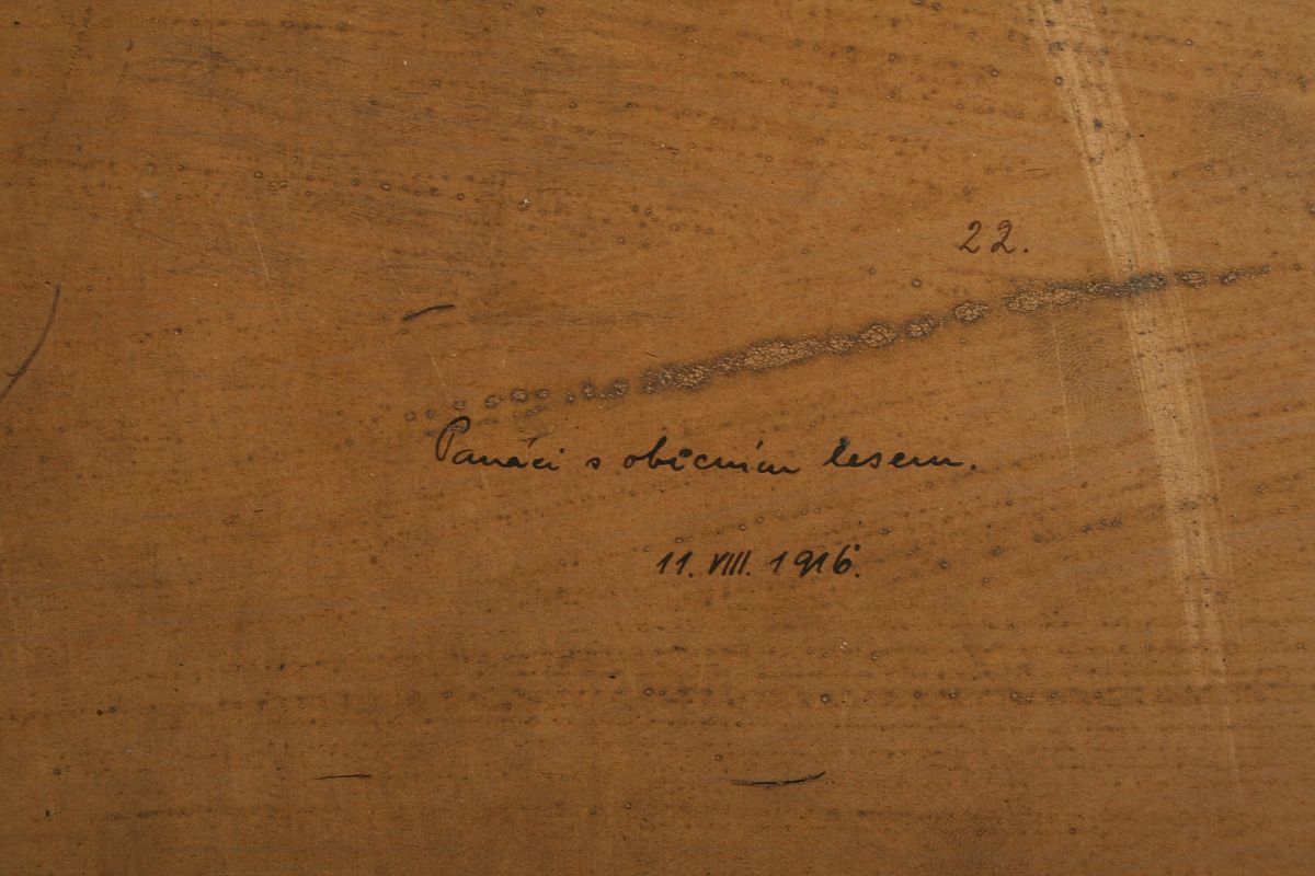 obraz letní krajiny s panáky a lesem, olej na kartonu 32 x 43 cm s rámem 42 x 54 cm, autor Karel Beneš, podepsáno vpravo dole K. Beneš a na zadní straně autorský přípis 1916, rámováno