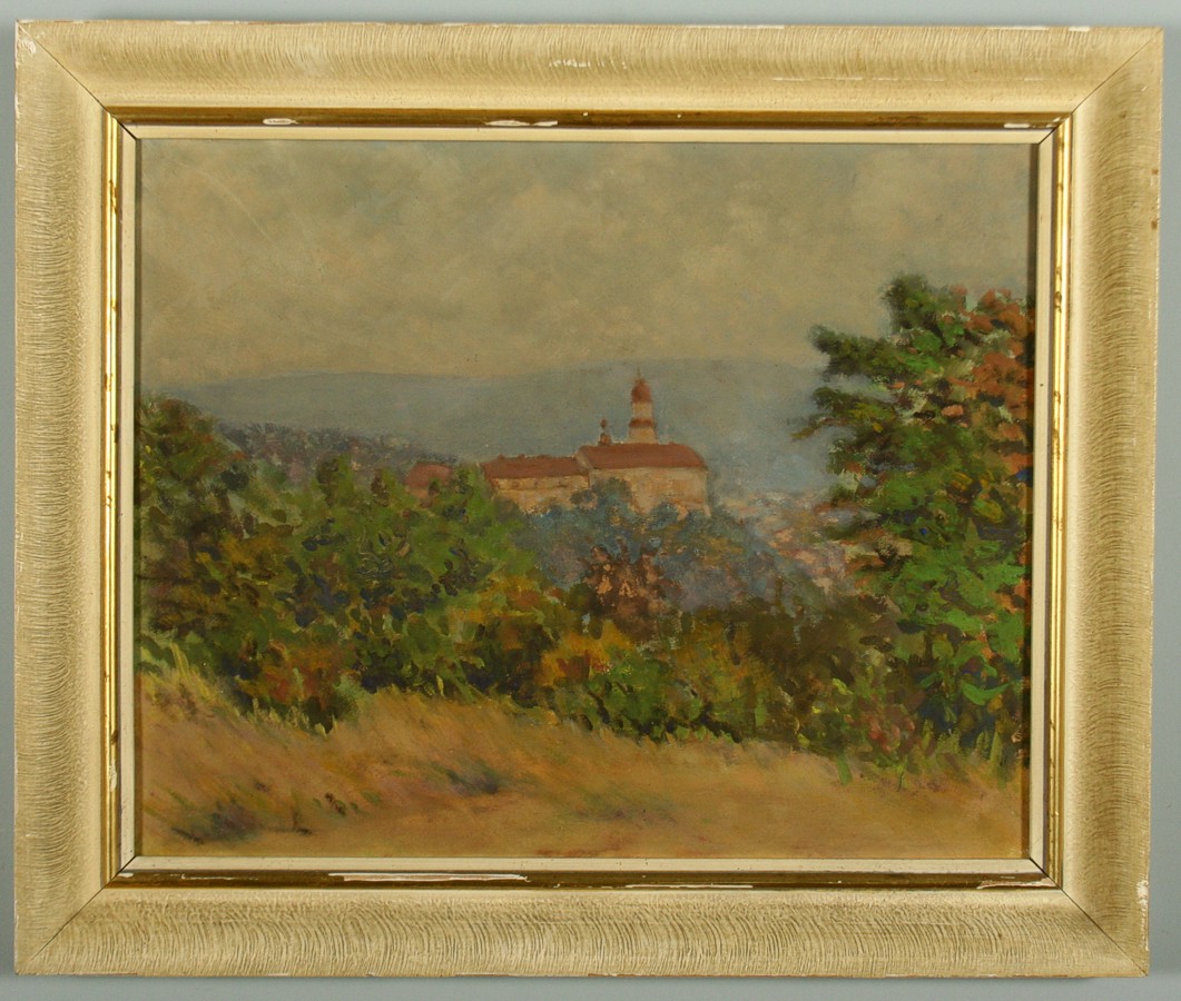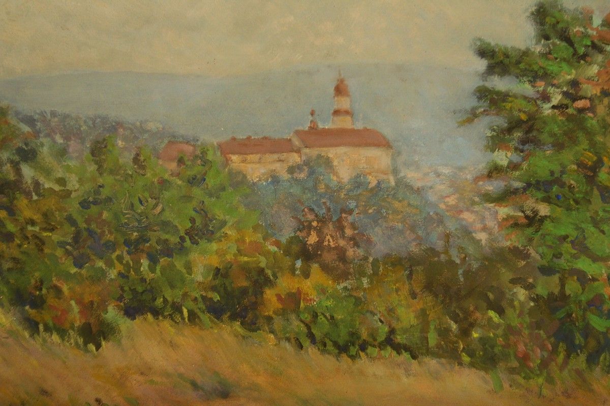 impresionistické ztvárnění náchodského zámku, olej na sololitové desce 40 x 49 cm s rámem 50 x 60 cm, autor neznámý, rámováno v částečně poškozeném rámu