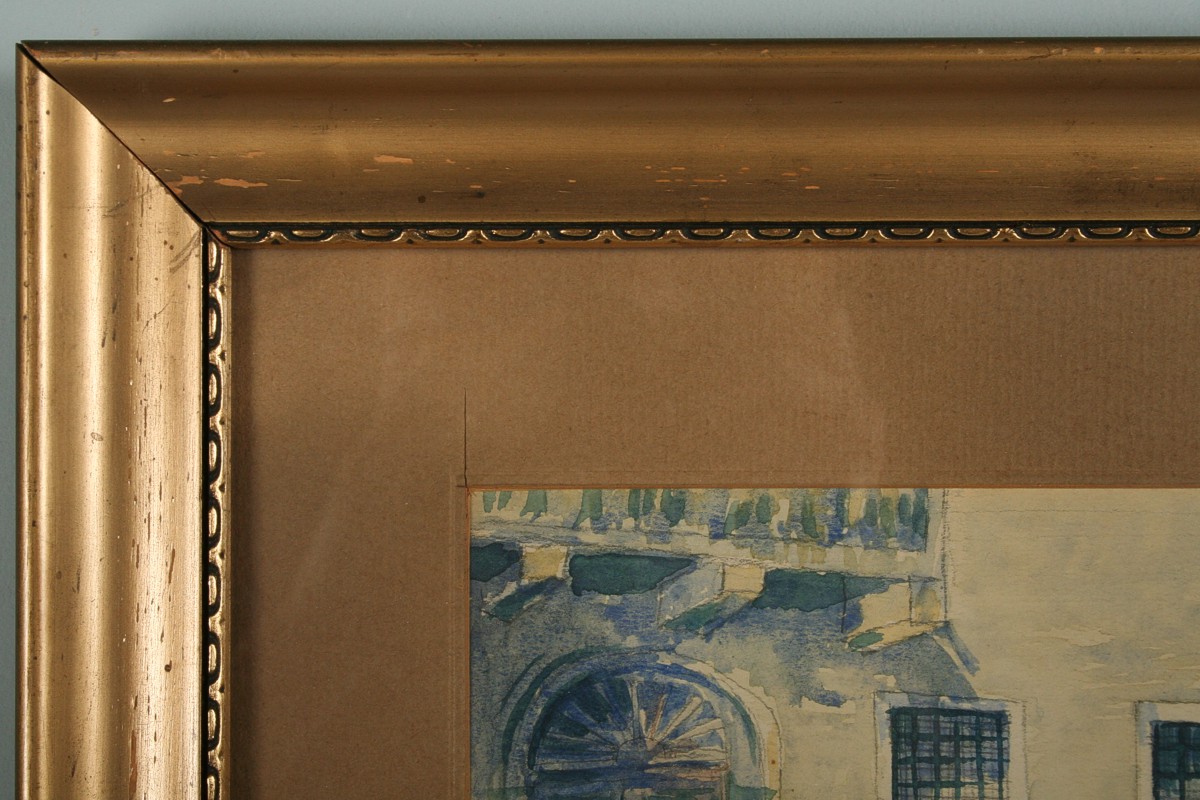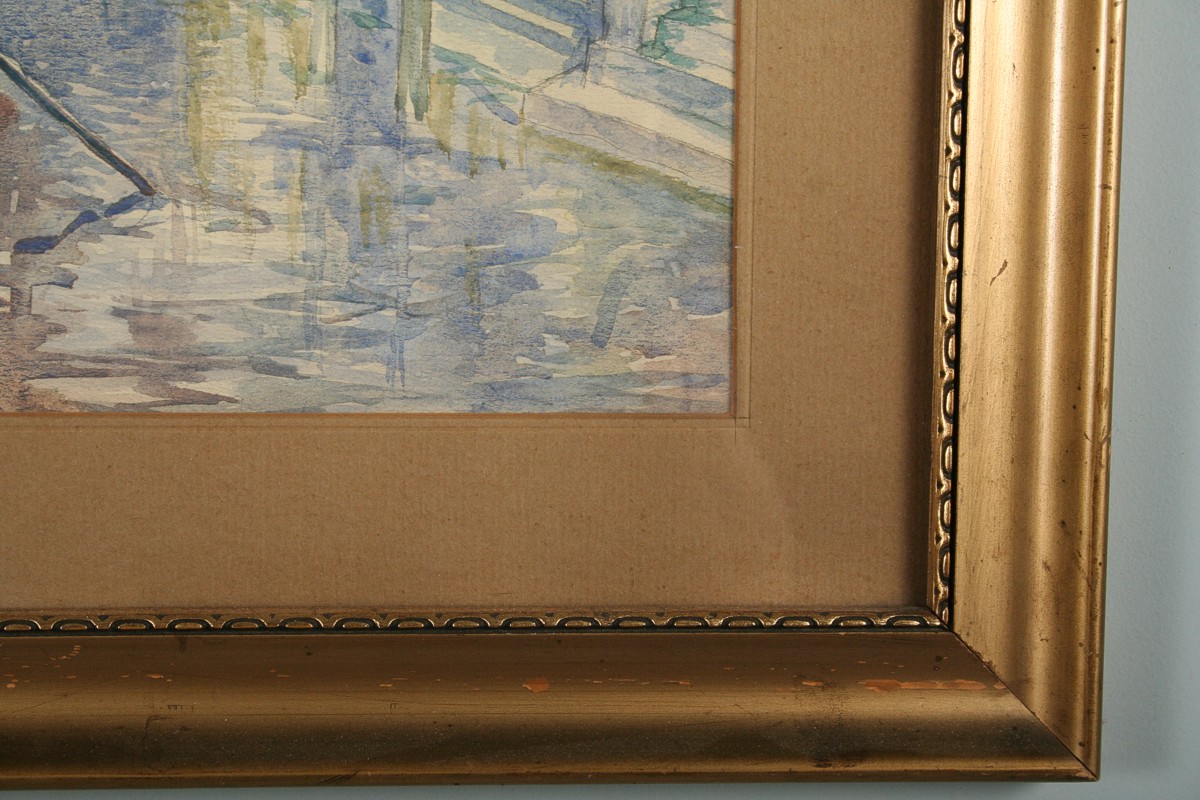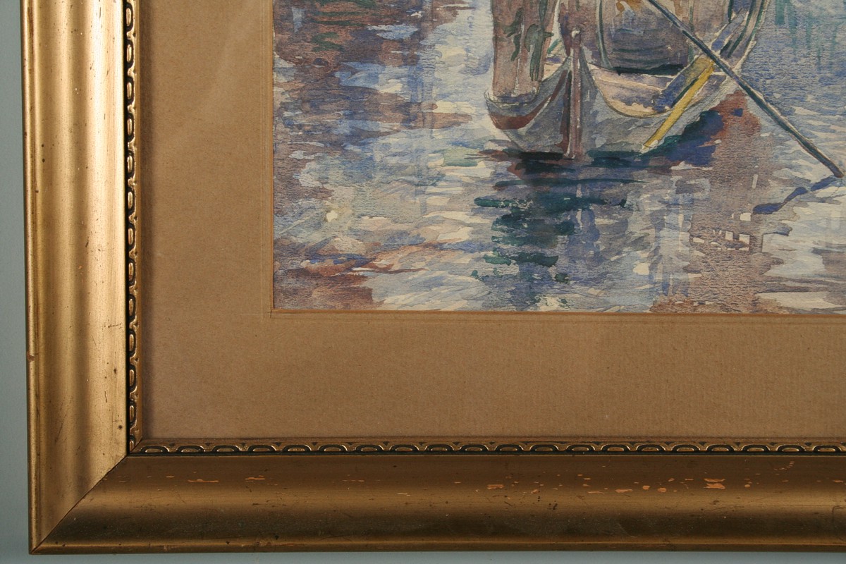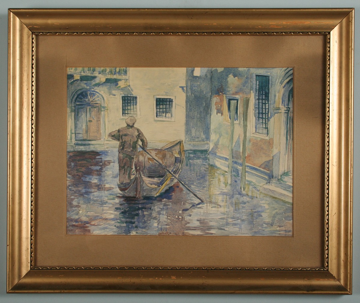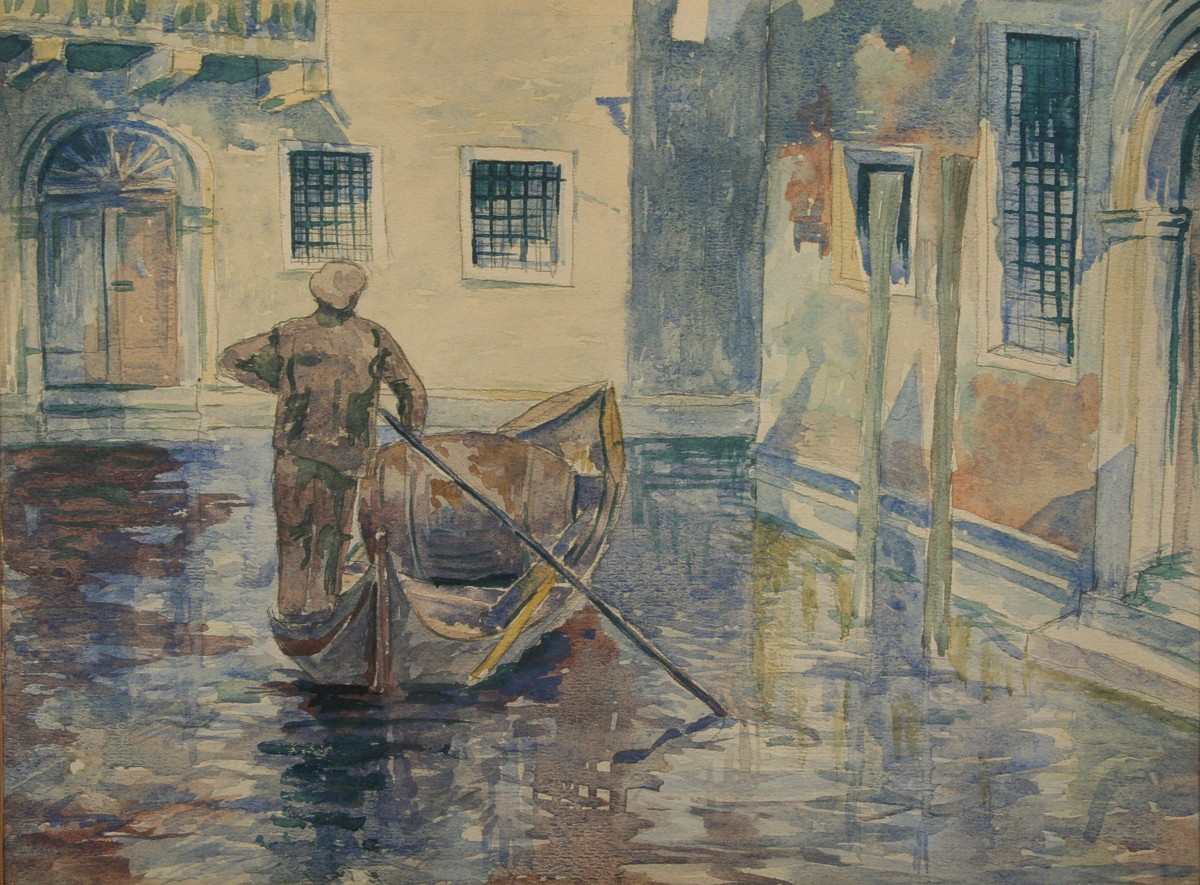 obraz gondoliéra v Benátkách akvarel na papíře ve výřezu 25 x 33 cm, s rámem 42 x 51 cm, autor neznámý nepodepsáno, obdobné akvarely z Benátek maloval Jaro Procházka, rámováno v původní paspartě a rámu pod sklem