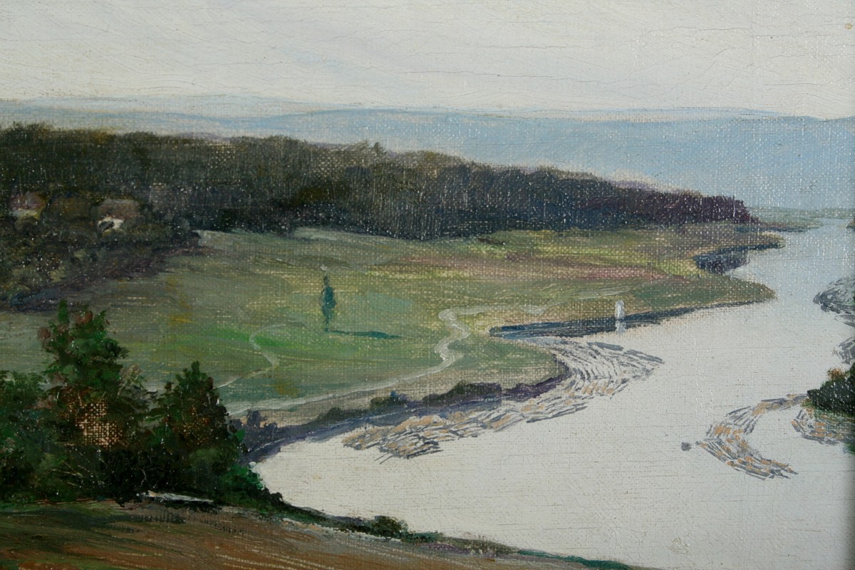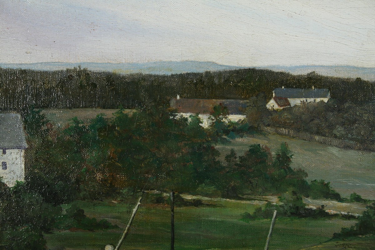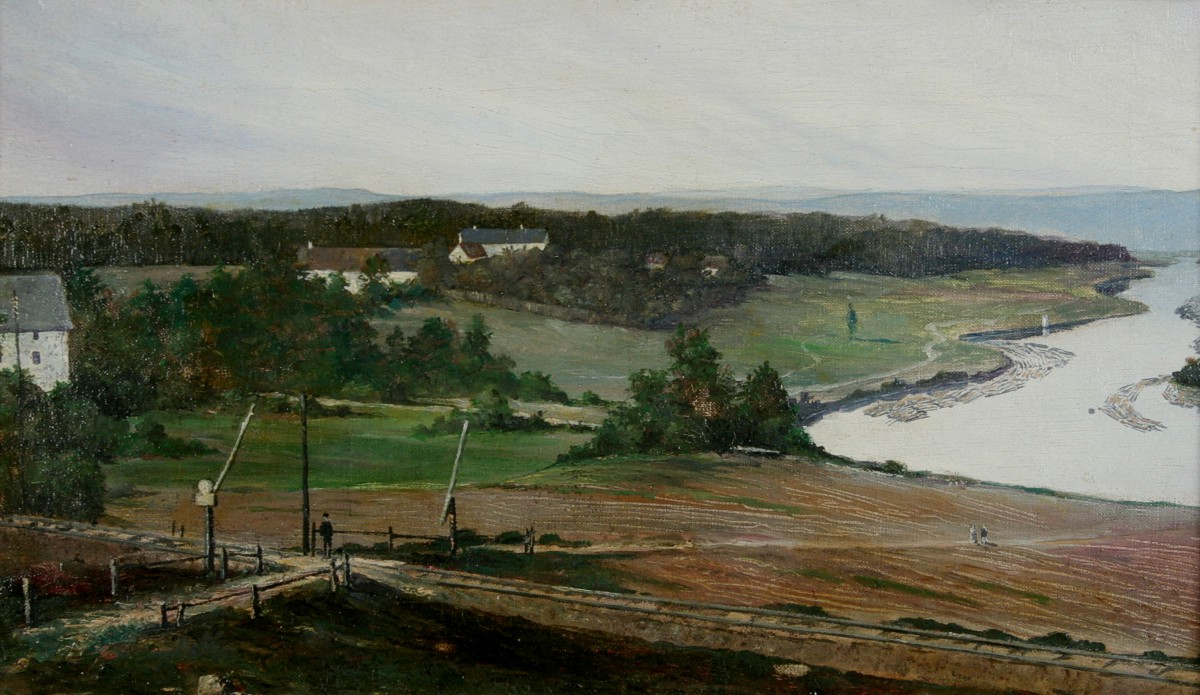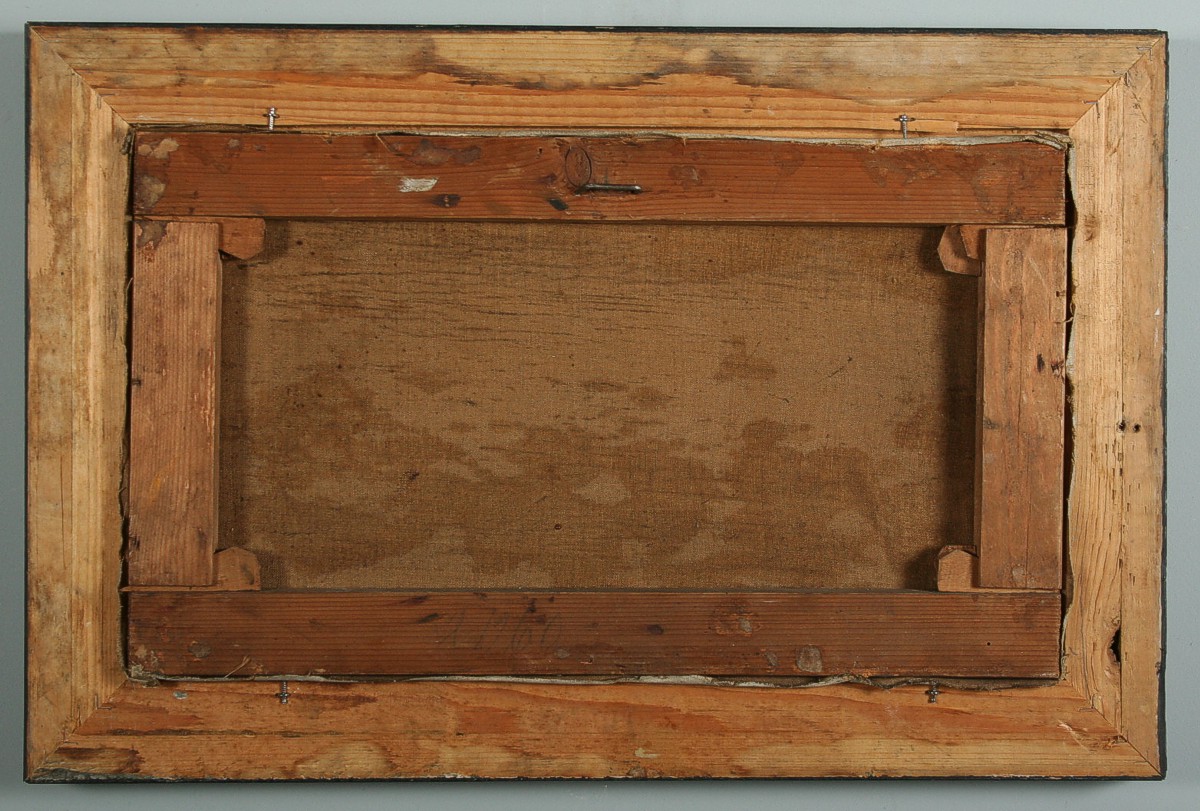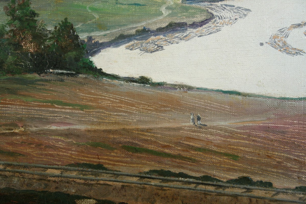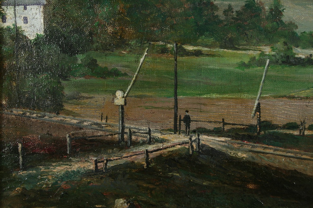 obraz široké krajiny s železničním přejezdem, závorami, architektůrou i figurální stafáží, olej na plátně napnutém na dřevěném rámu 25 x 43 cm s rámem 36 x 54 cm, neznámý autor z přelomu 19. a 20. století, rámováno v původním rámu