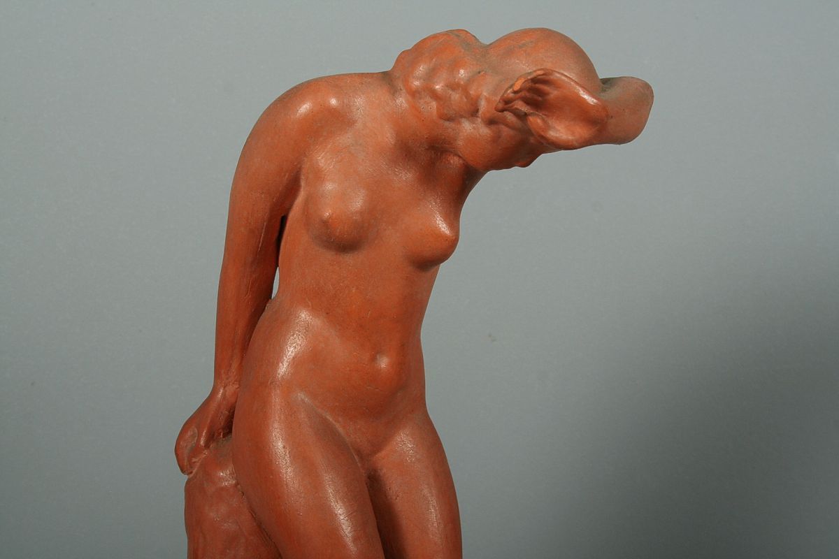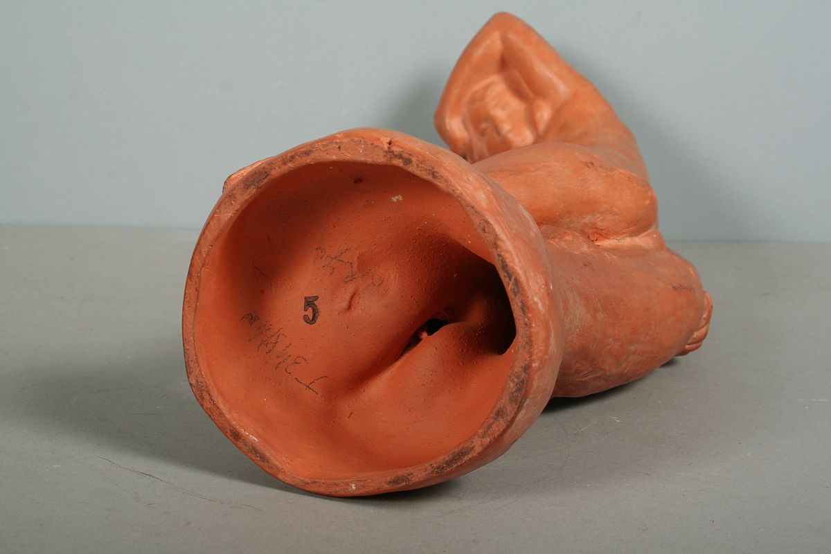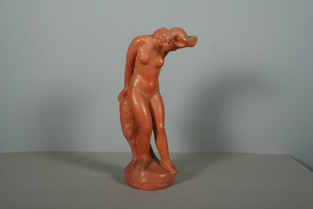 socha dívčího aktu, pálená keramika terakota 33 cm, autor neznámý, značeno naspodu čísly, 1. polovina 20. století