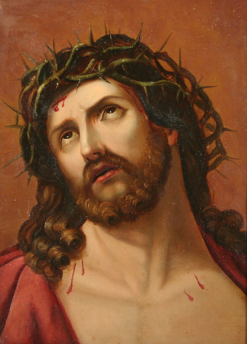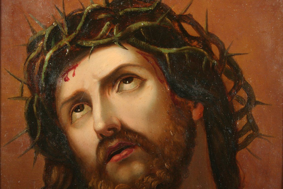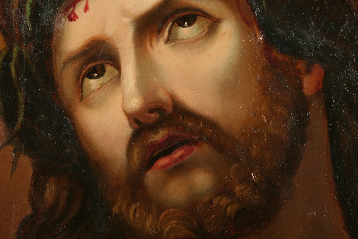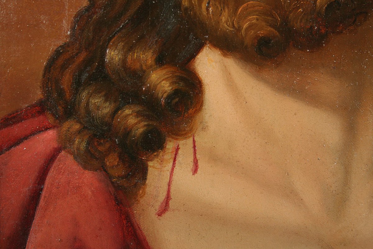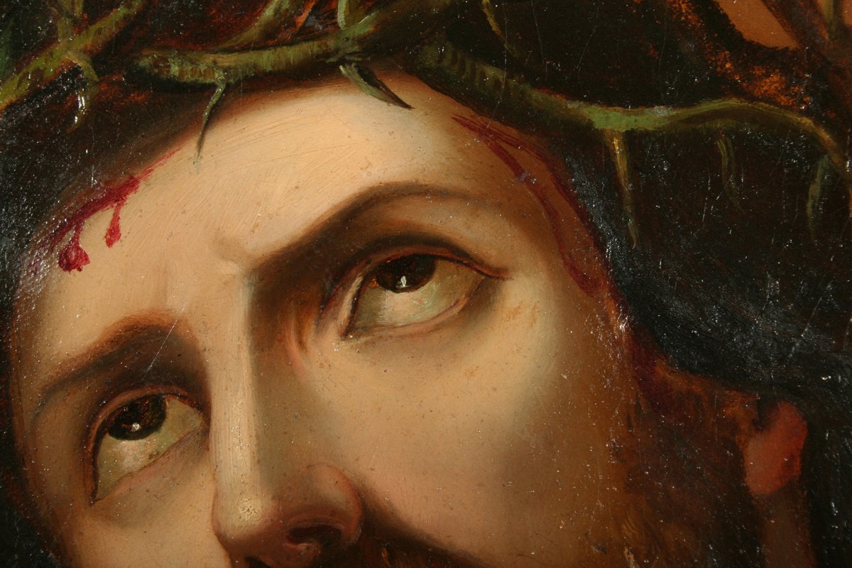 obraz Ježíše Krista s trnovou korunou, olej na plátně, 34 x 25 cm s rámem 42 x 33 cm, autor neznámý 19. století, rámováno v původním zlaceném rámu