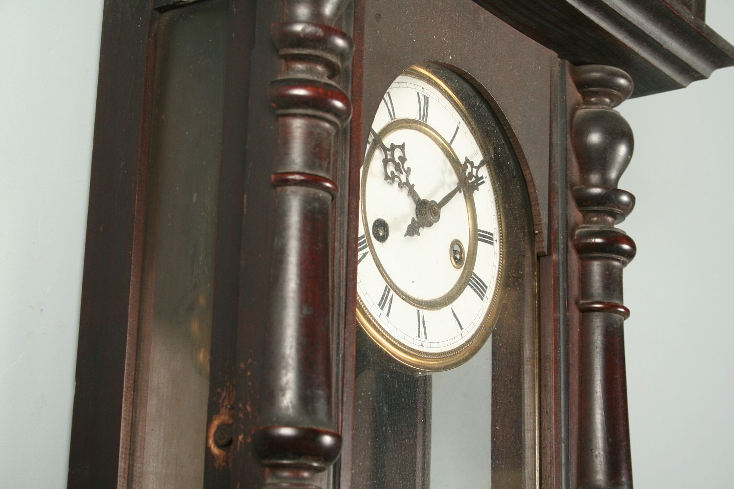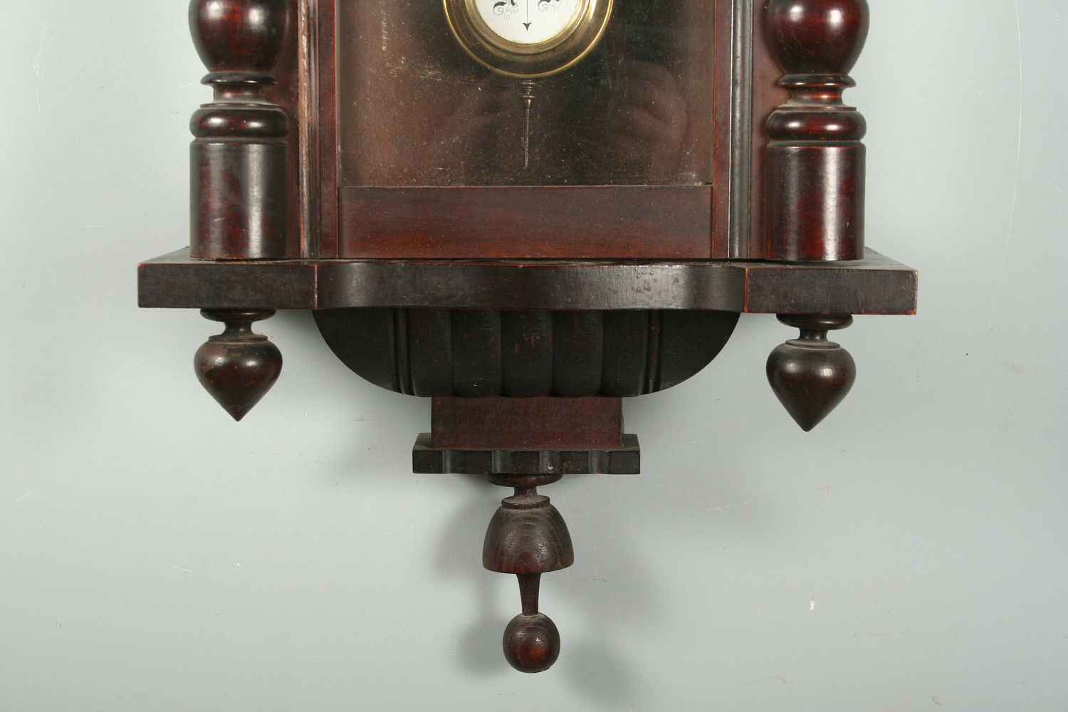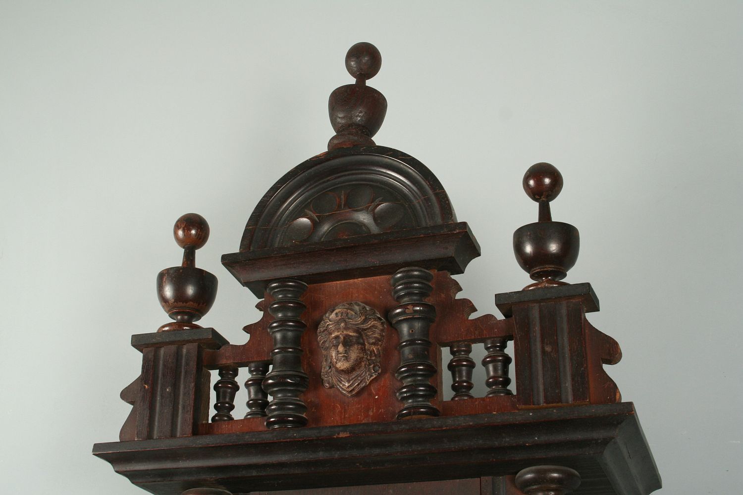 závěsné hodiny v dřevěné skříni v pseudorenesančním stylu se soustruženými půlsloupky a původní korunou, v pěkném stavu z počátku 20. století, ciferník smaltovaný s římskými číslicemi, stroj pérový, značený GB Gustav Becker, bití do spirály, funkční s klíčkem, 99 x 37 cm