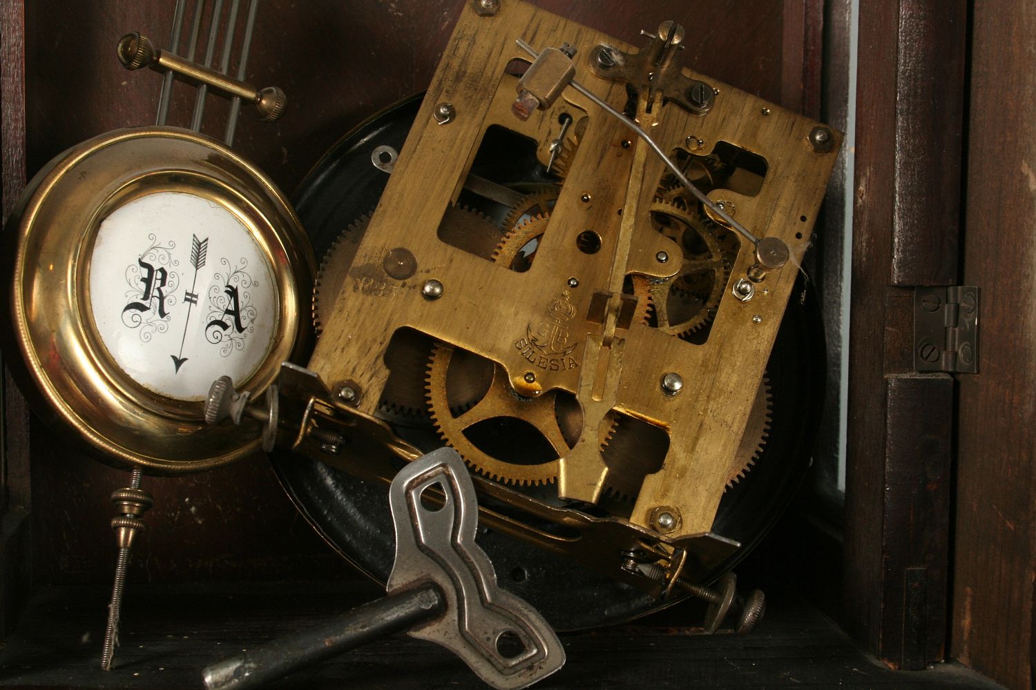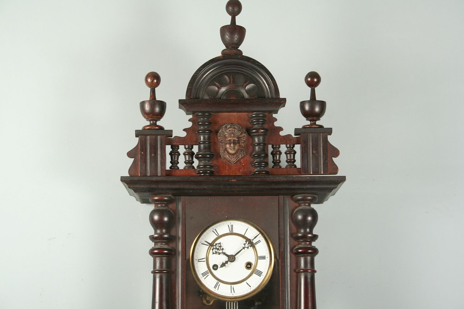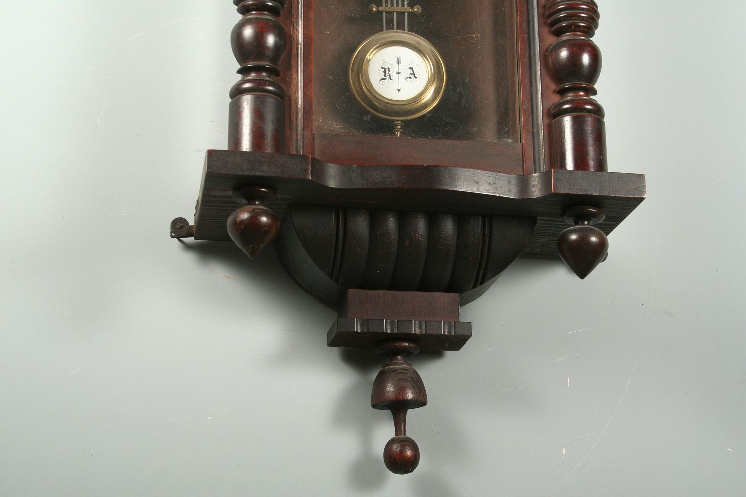 závěsné hodiny v dřevěné skříni v pseudorenesančním stylu se soustruženými půlsloupky a původní korunou, v pěkném stavu z počátku 20. století, ciferník smaltovaný s římskými číslicemi, stroj pérový, značený GB Gustav Becker, bití do spirály, funkční s klíčkem, 99 x 37 cm