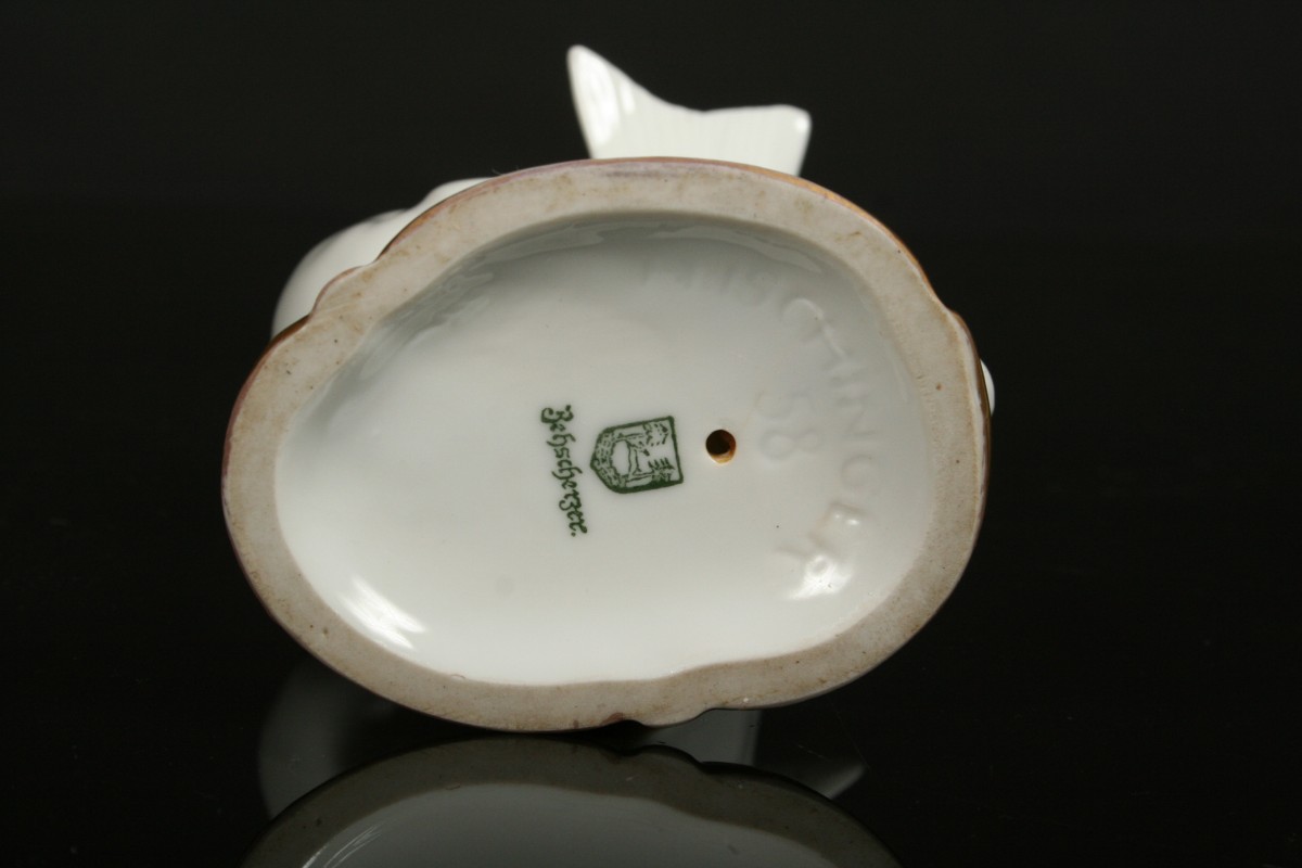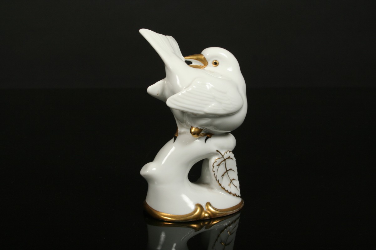 porcelánová figurka ptáčka na větvi, bílý porcelán se zlacenými detaily, autor H. Ischinger výroba Německo Zeh & Scherzer, 12,5 cm