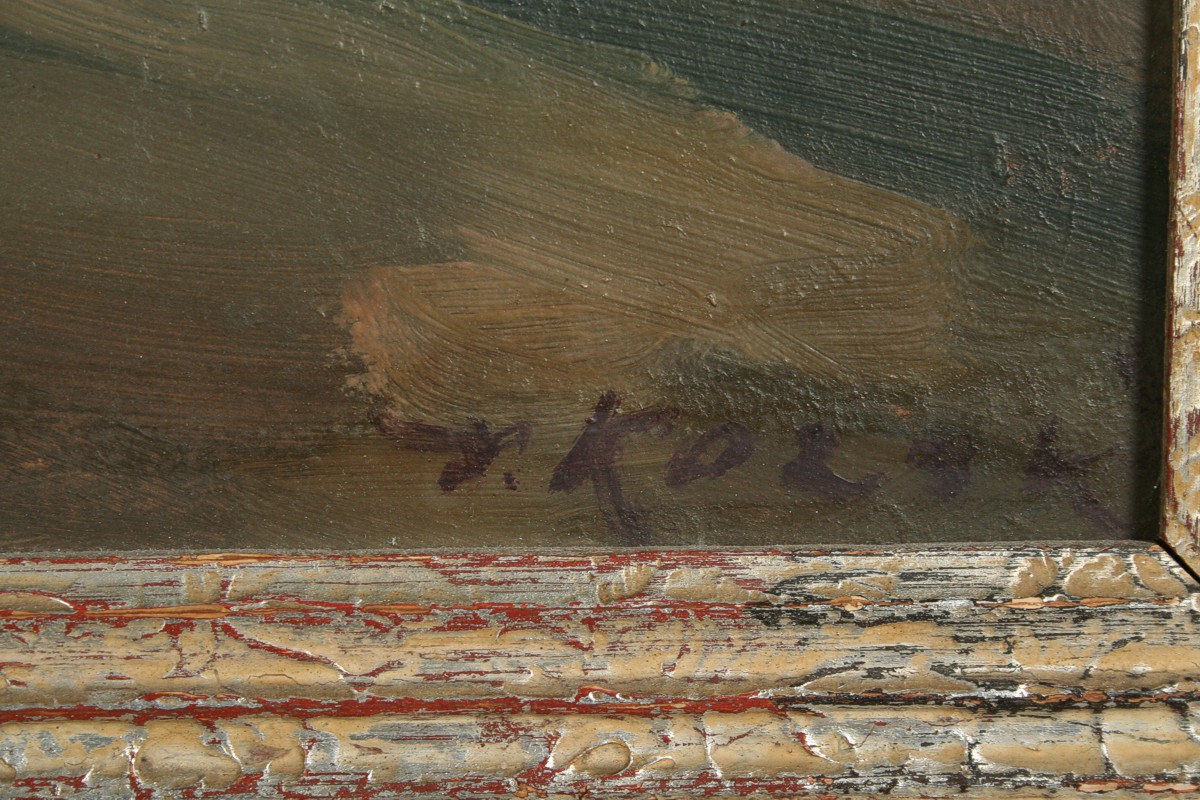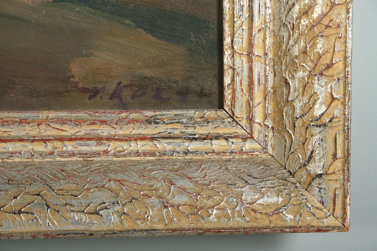 obraz Prahy z Karlova mostu ve večerní náladě při pouličním osvětlení, olej na lepence 48 x 68 cm s rámem 62 x 82 cm, autor Václav Kozák, podepsáno vpravo dole V. Kozák, rámováno v původním rámu