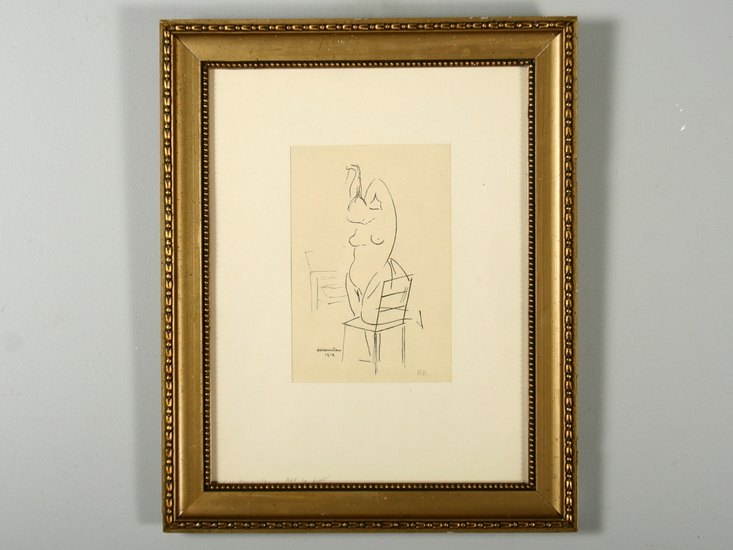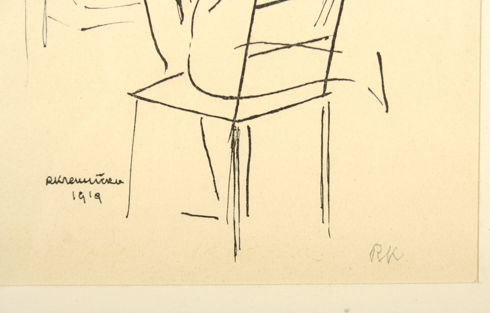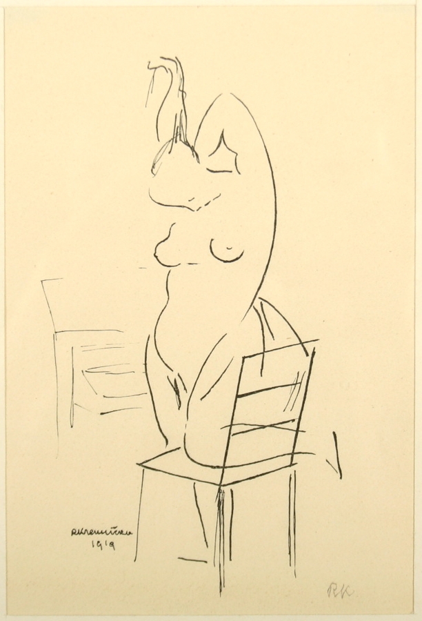 dívčí akt s židlí litografie na papíře, autor Rudolf Kremlička, podepsáno v tisku R.Kremlička 1919 a tužkou v pravo dole monogramem R K rámováno v paspartě pod sklem