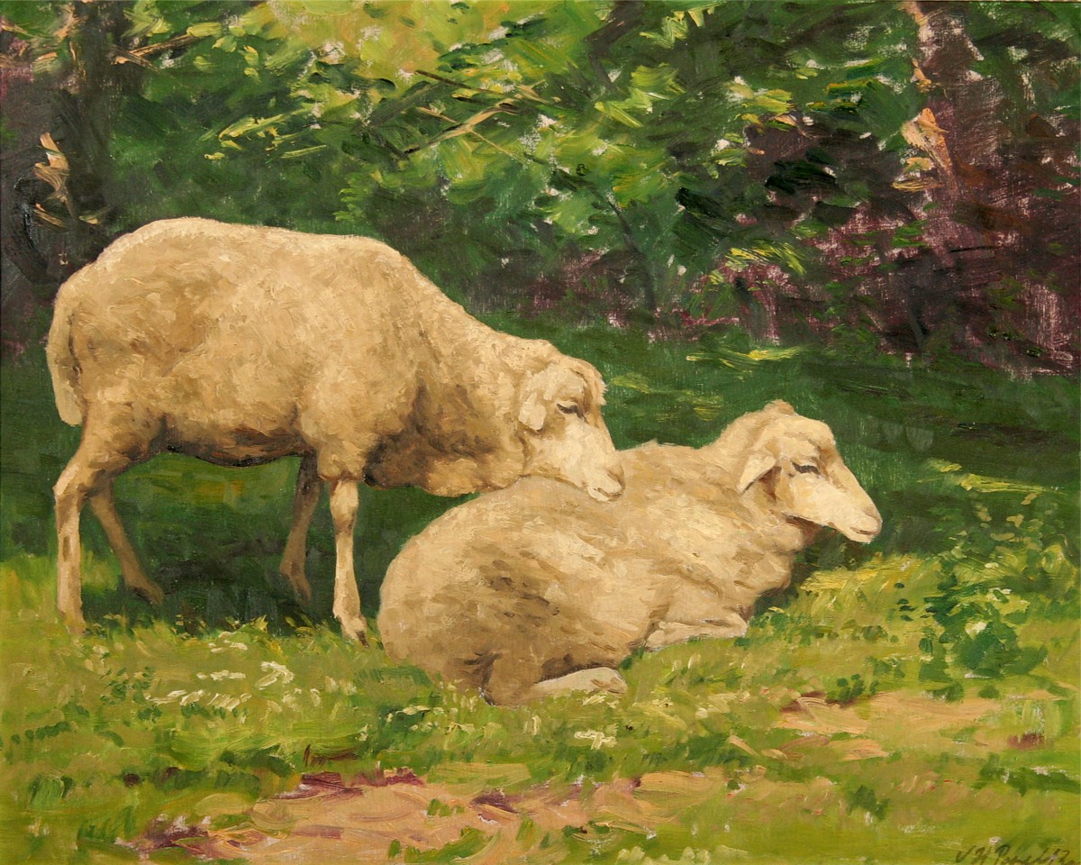 obraz oveček při odpočinku na slunci, olej na lepence 50 x 63 cm s rámem 71 x 83 cm, autor Vojtěch Popelka, podepsáno vpravo dole V.H. Popelka, rámováno v původním zdobeném rámu