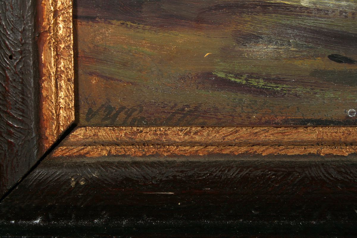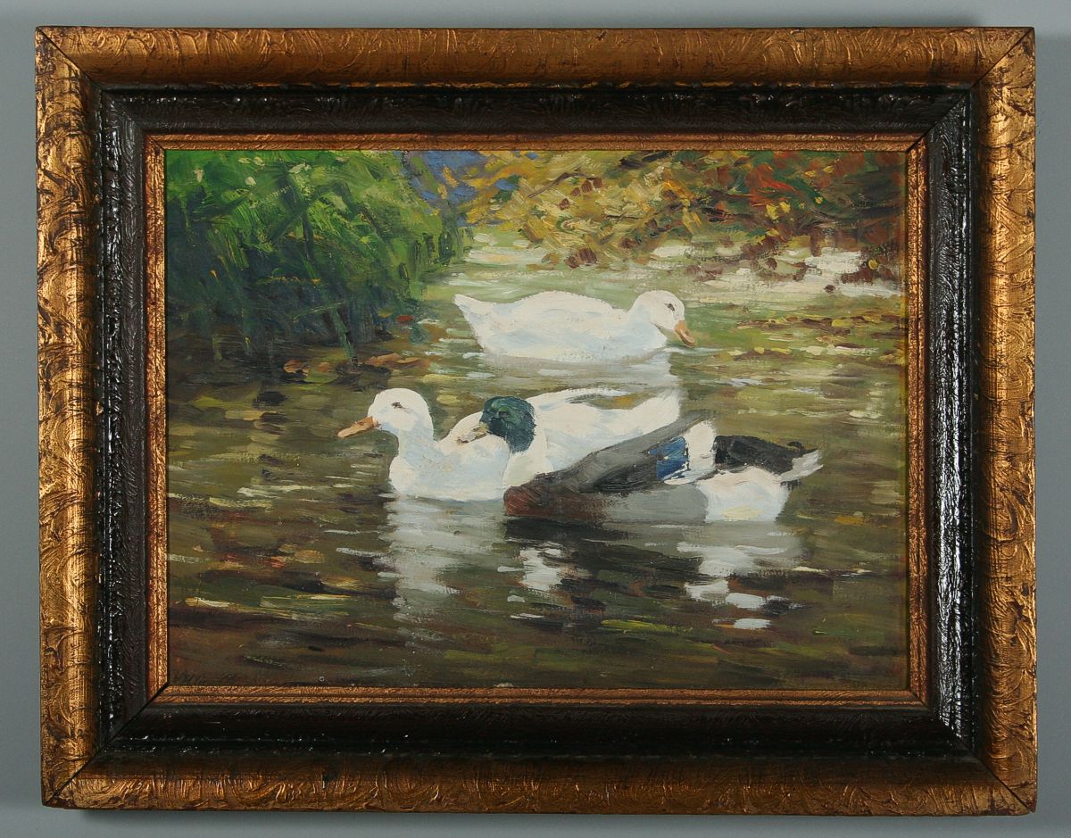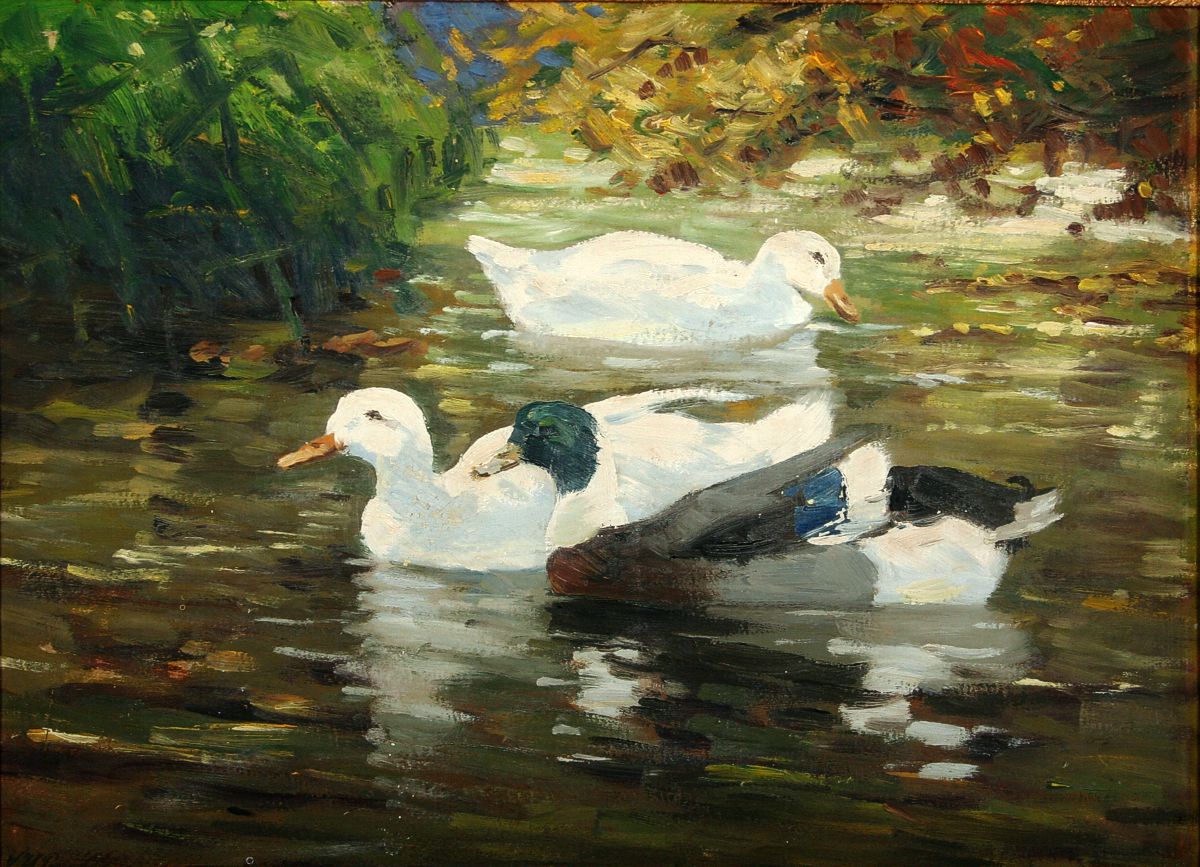 obraz plovoucích kačen na rybníce, olej na kartonu, 37 x 51 cm s rámem 53 x 67 cm, autor Vojtěch Hynek Popelka, podepsáno vlevo dole V. H. Popelka, rámováno v původním rámu