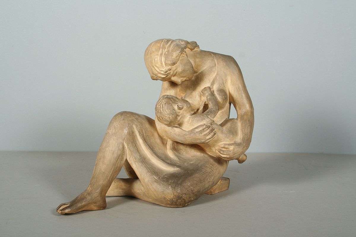socha kojící matky s dítkem, patinovaná sádra, 21 x 25 cm, autor Břetislav Benda, podepsáno na soklu vrypem B. Benda a tužkou na dně