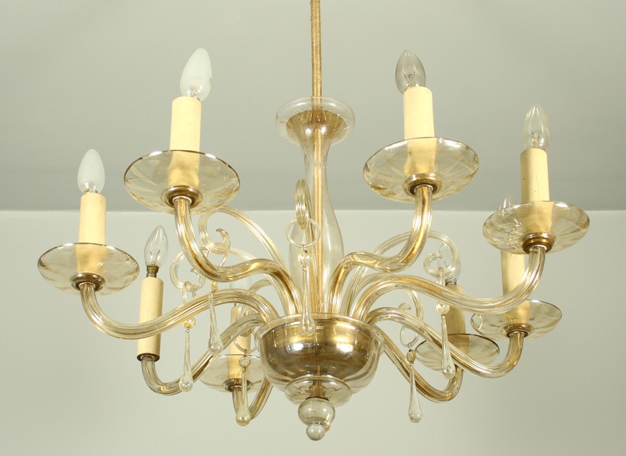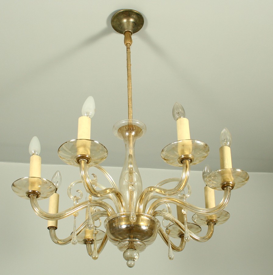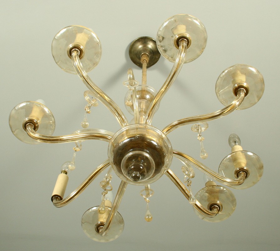 stropní skleněný lustr, osmi ramenný na svíčkové žárovky, skleněné ověsky, původní el. instalace, chybí jedno ozdobné ramínko a jeden talířek pod svící na první pohled není vidět, 98 x 70 cm