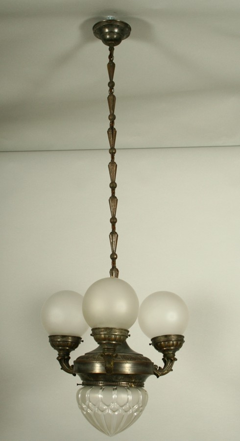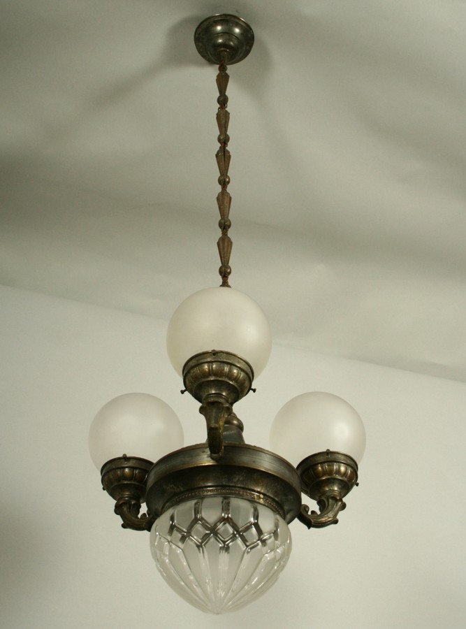 stropní lustr tří ramenný s centrálním svítidlem na řetězu z tlačené mosazi, skleněná stínidla, původní el. instalace, 112 x 43 cm