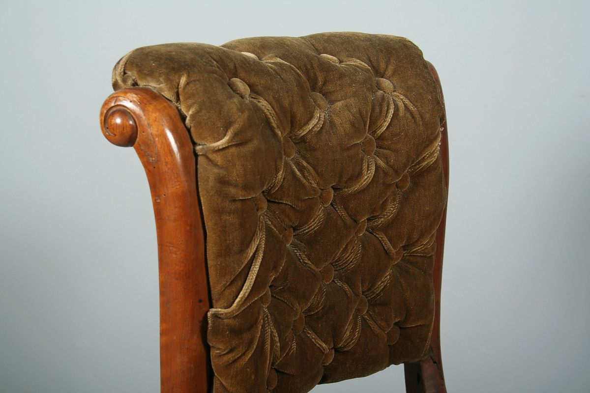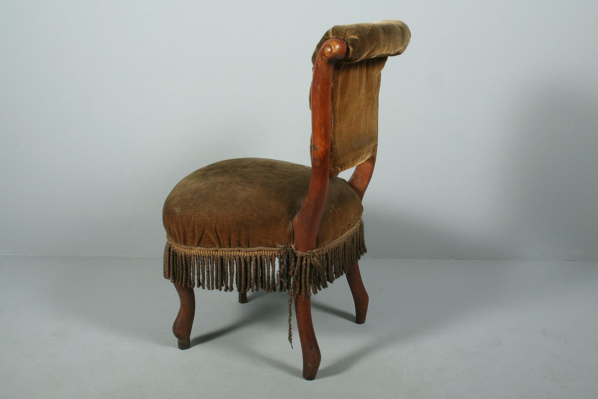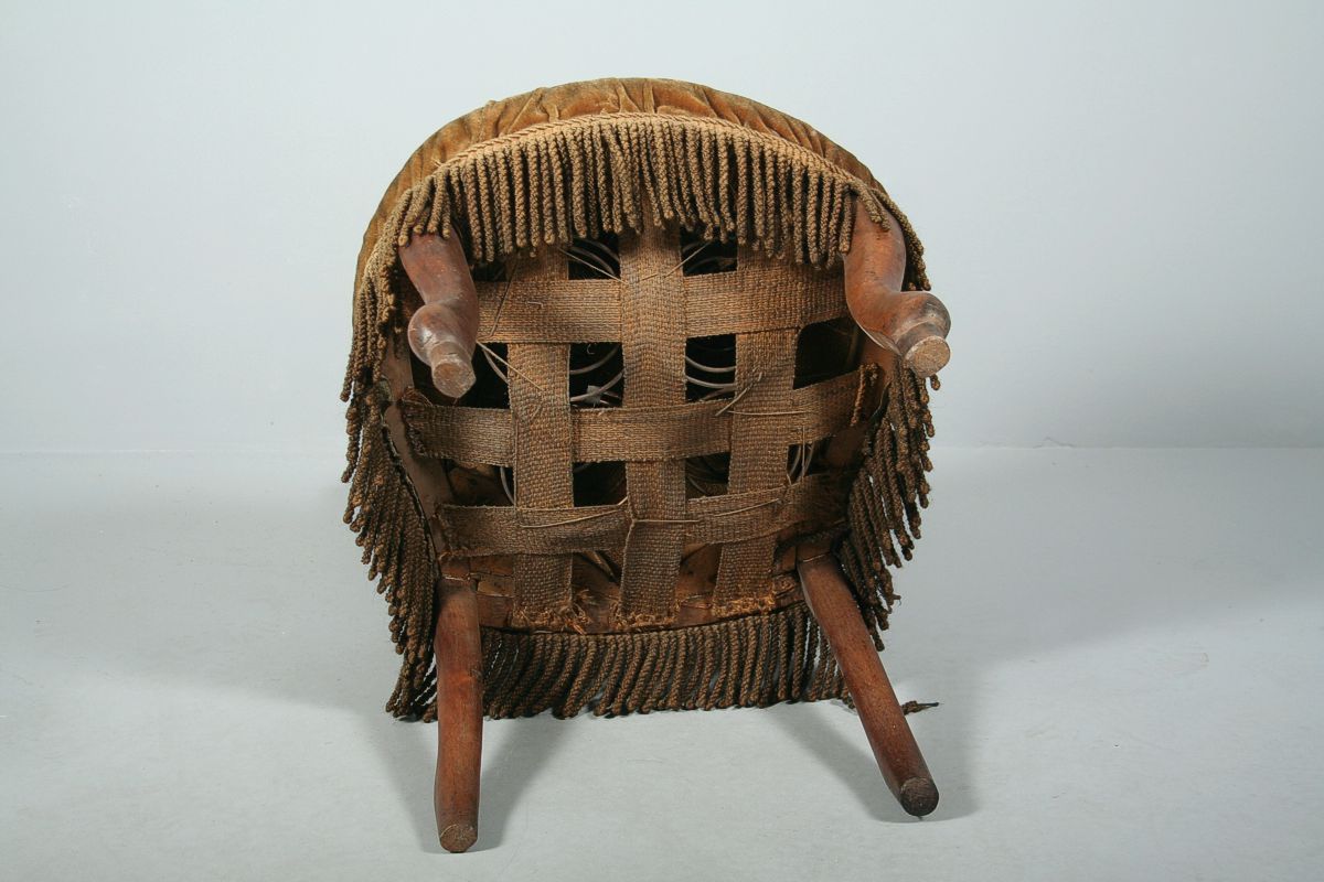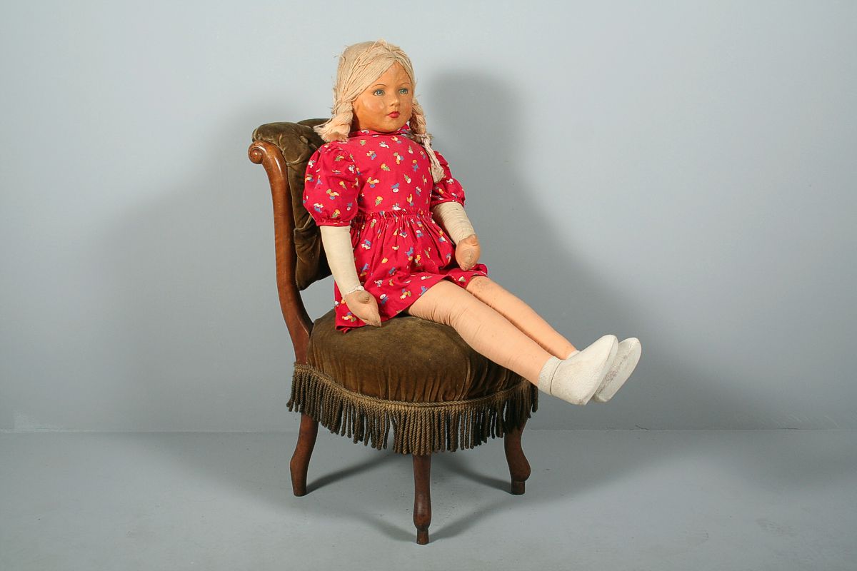 dětské polstrované zdobné křesílko s dřevěnou kostrou a pérováním, vše v původním stavu včetně ověsků, panenka 102 cm vysoká není součástí prodeje křesílka, 75 x 43 cm, výška sedáku 41 cm