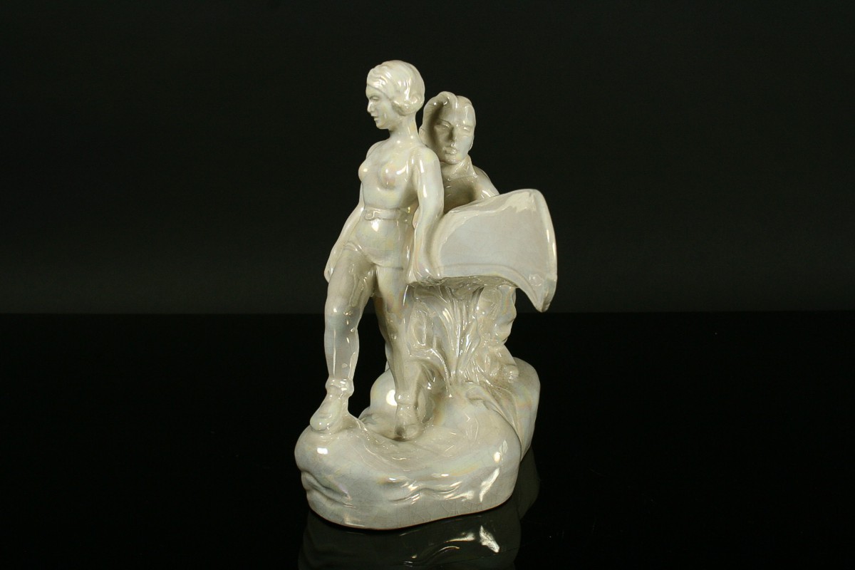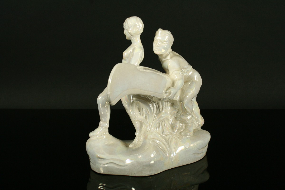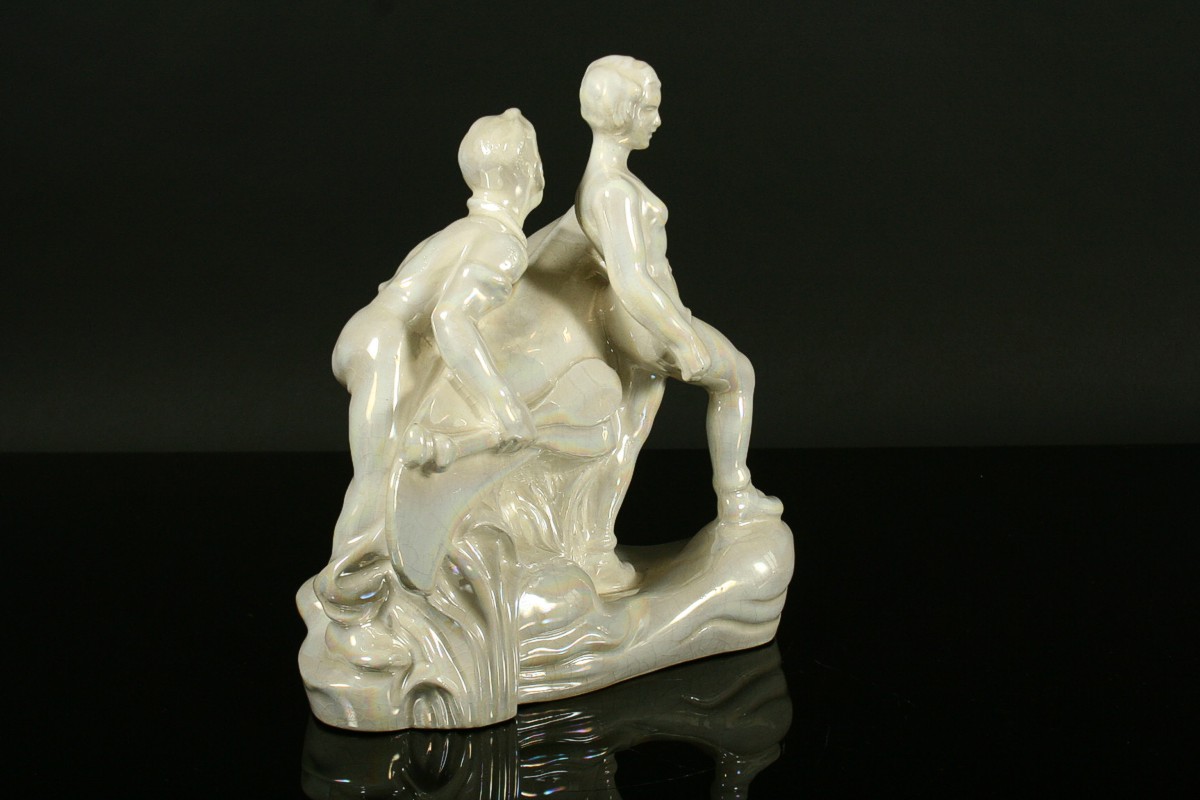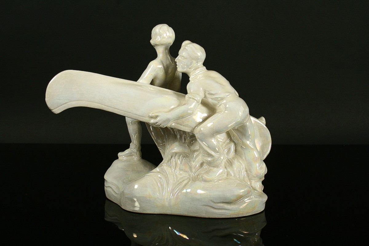 keramické sousoší vodáka a vodačky nesoucí kánoe s pádly, glazovaná keramika, neznačená, 21 x 27 cm
