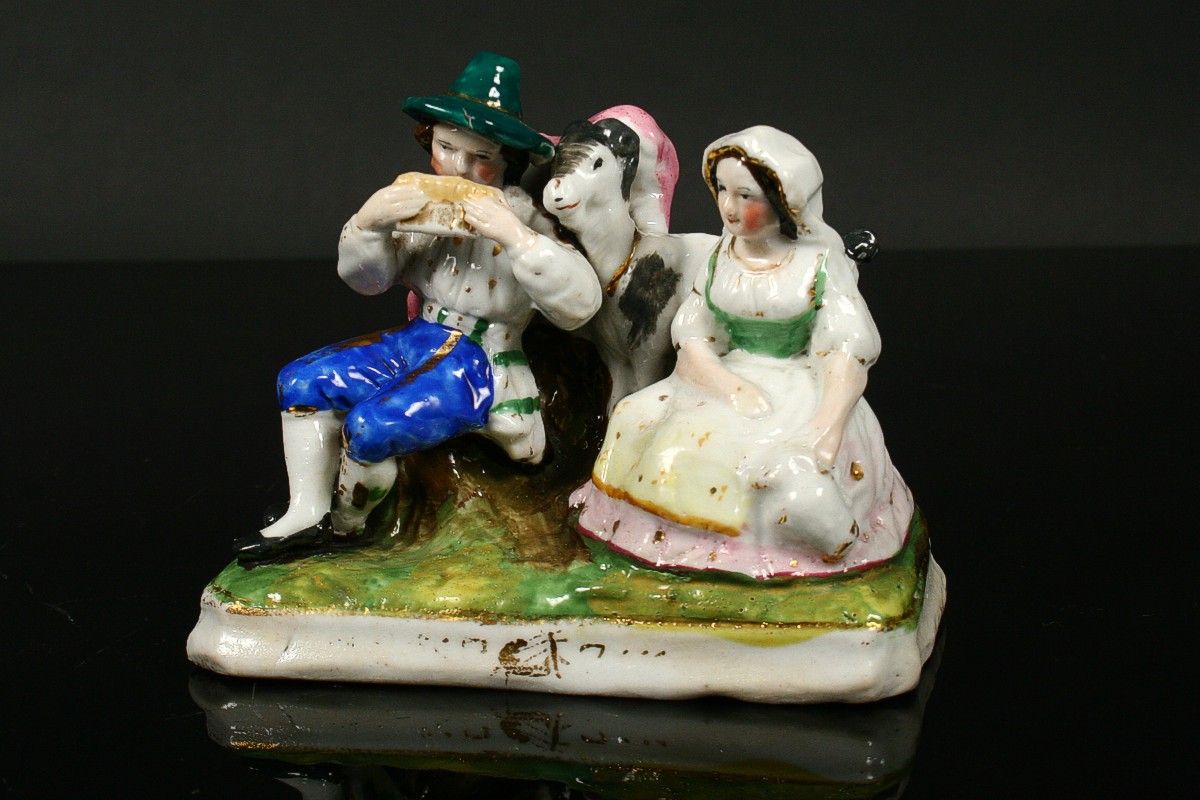 sousoší sedící pár pasoucí kozu, malovaný zlacený porcelán, neznačeno, 19. století, 9 x 10,5 x 6 cm