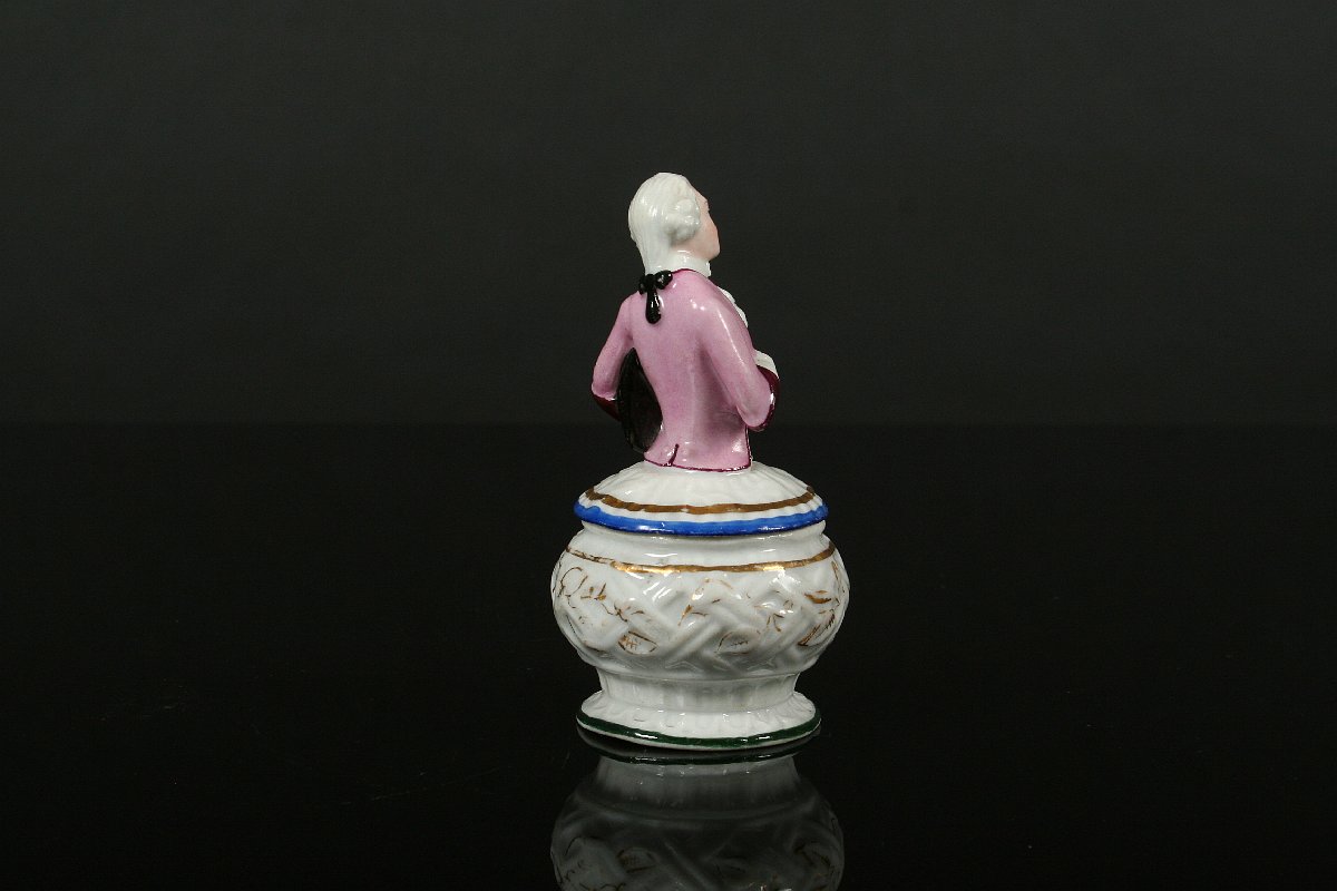 figurální dóza s víčkem, figura kavalíra držícího v ruce klobouk, bílý porcelán malovaný a zlacený, 19. století, značka nenalezena, 10 x 5,5 cm