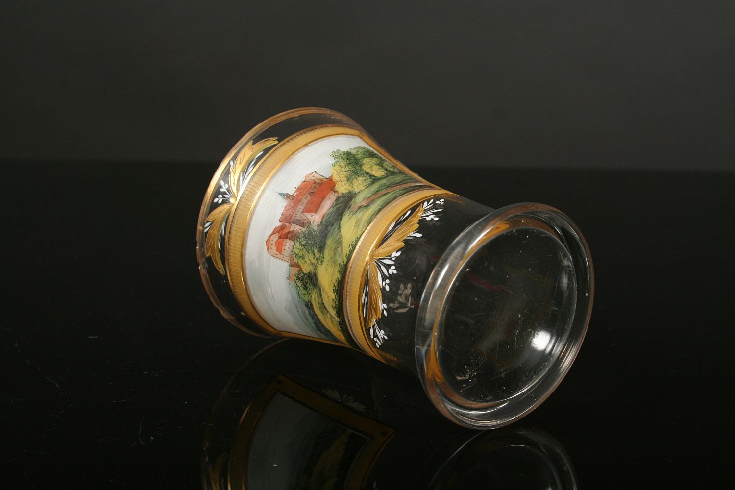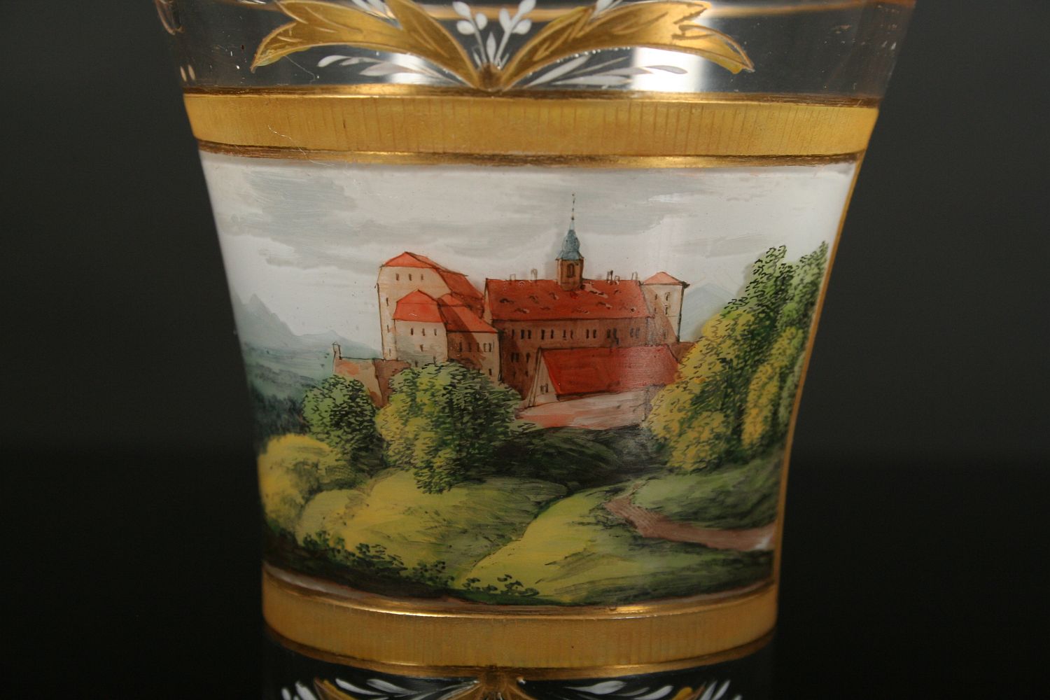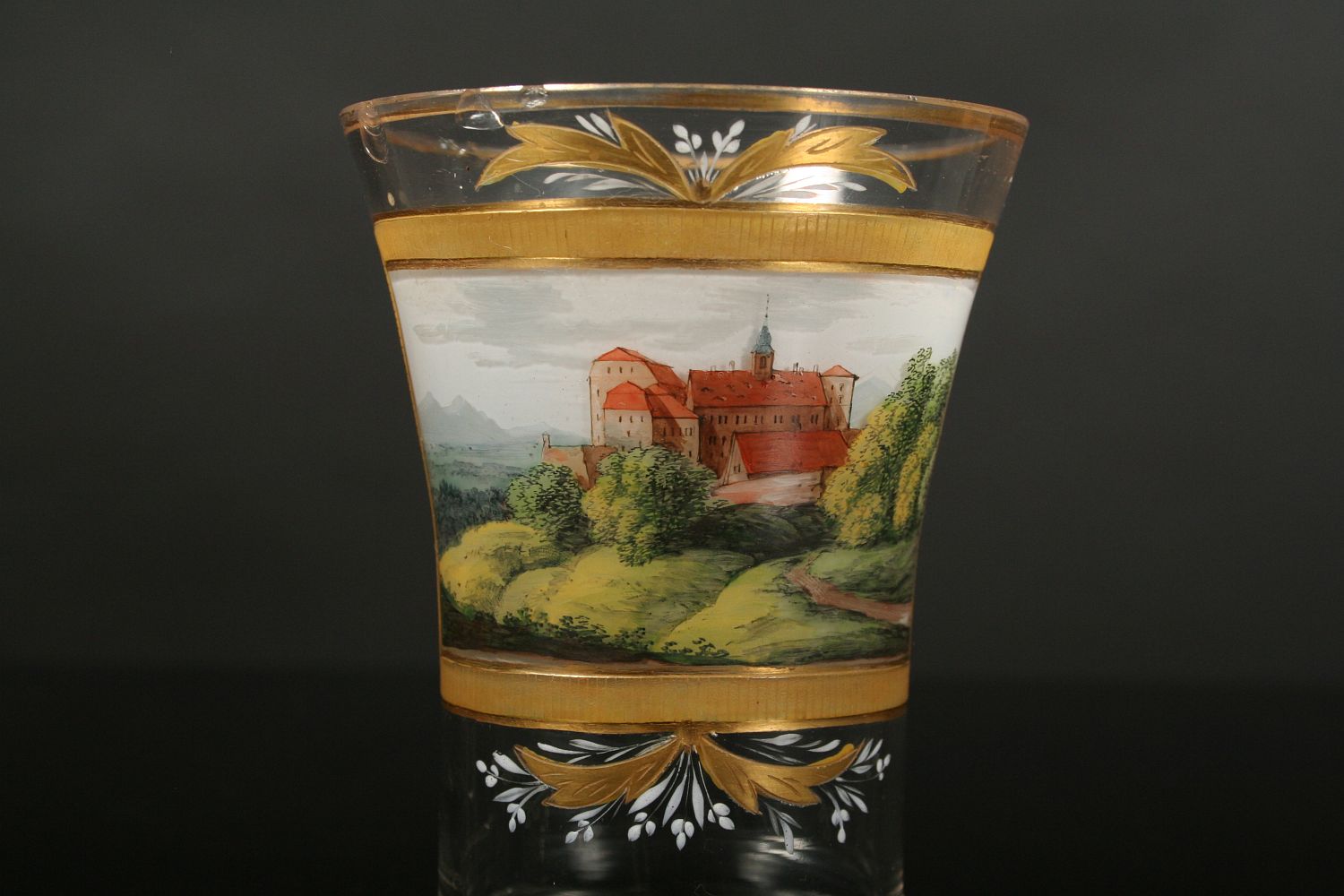 sklenice z čirého skla, dole oblá zespod broušená patka, nahoru rozvitá kupa s broušeným a zlaceným dekorem, v centrální části barevnými emaily malovaná veduta hradu nebo zámku v krajině, zcela původní stav z 1. poloviny 19. století, po obvodu oťuky, 11,5 cm