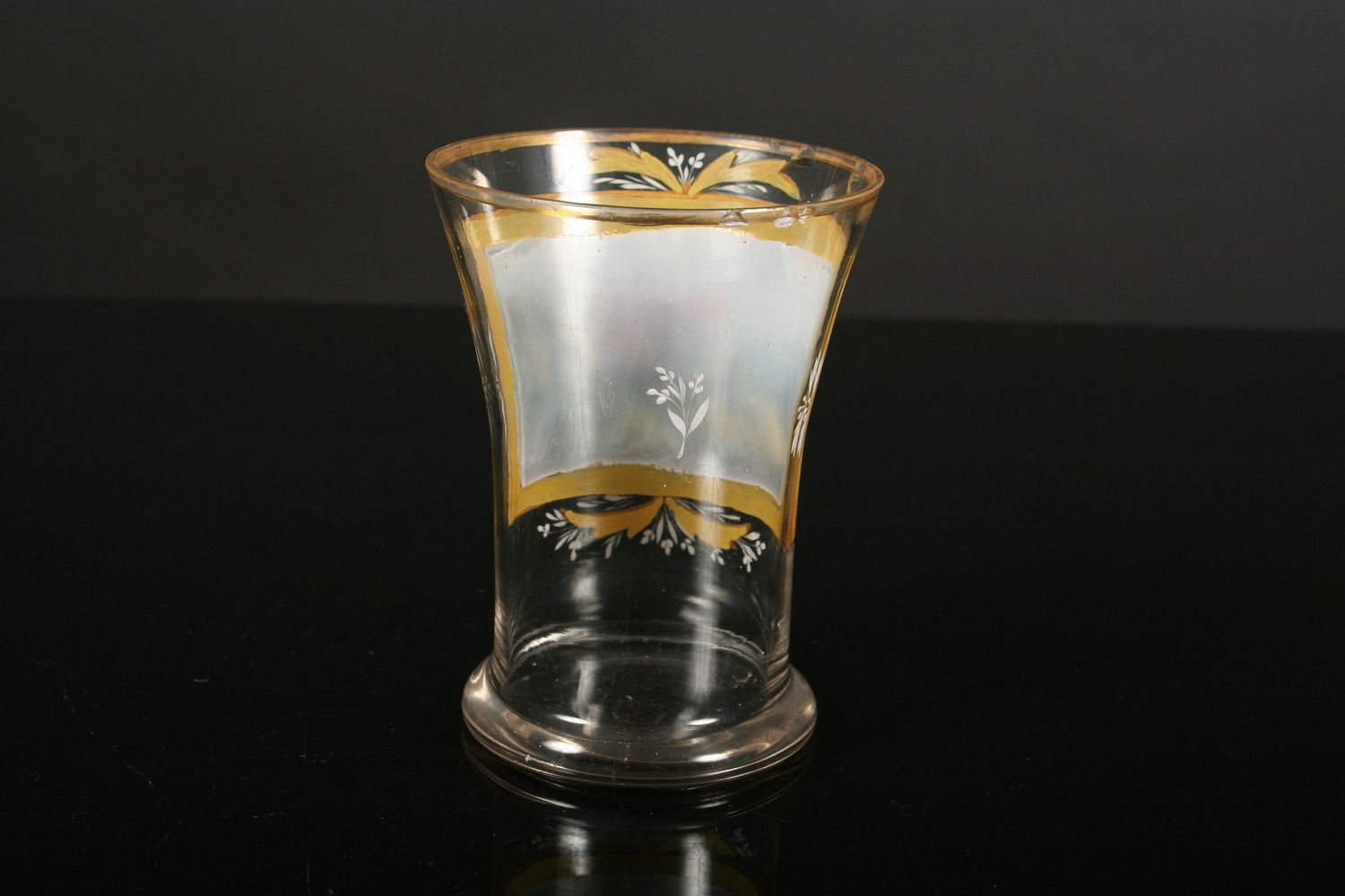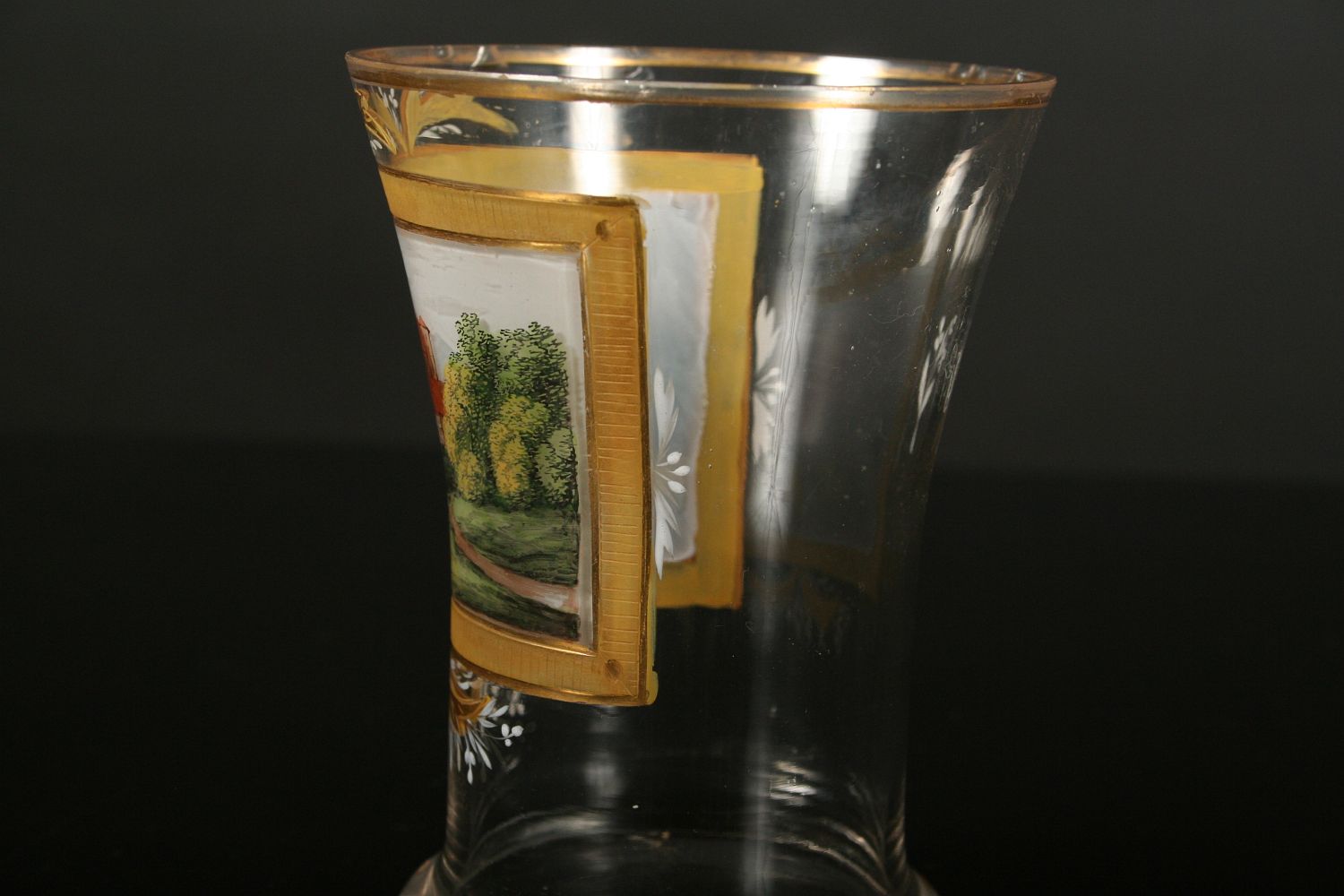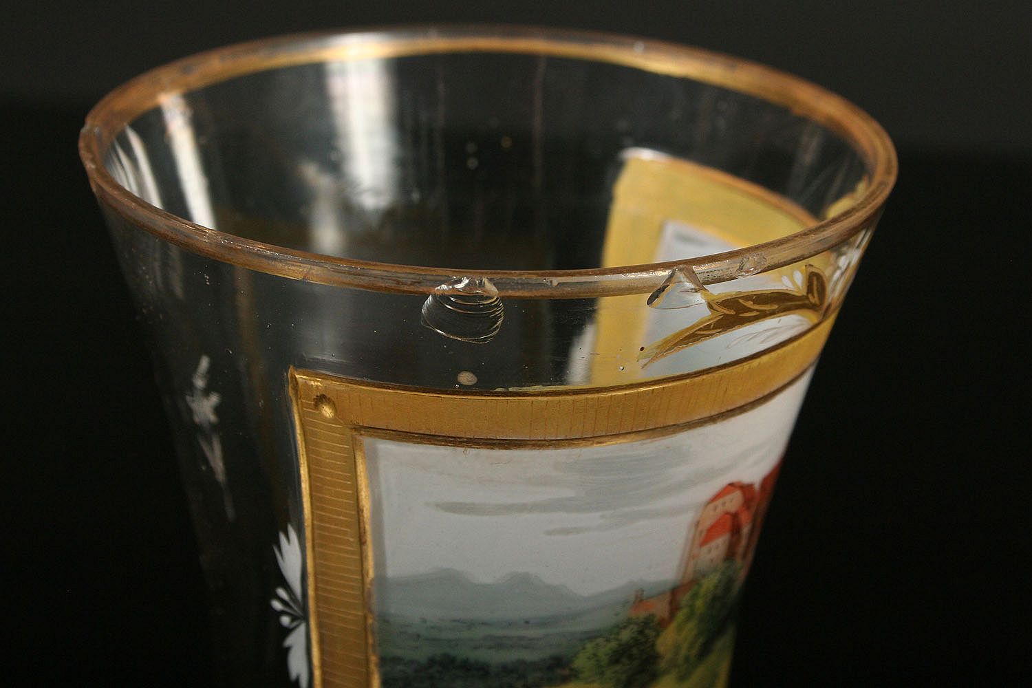 sklenice z čirého skla, dole oblá zespod broušená patka, nahoru rozvitá kupa s broušeným a zlaceným dekorem, v centrální části barevnými emaily malovaná veduta hradu nebo zámku v krajině, zcela původní stav z 1. poloviny 19. století, po obvodu oťuky, 11,5 cm