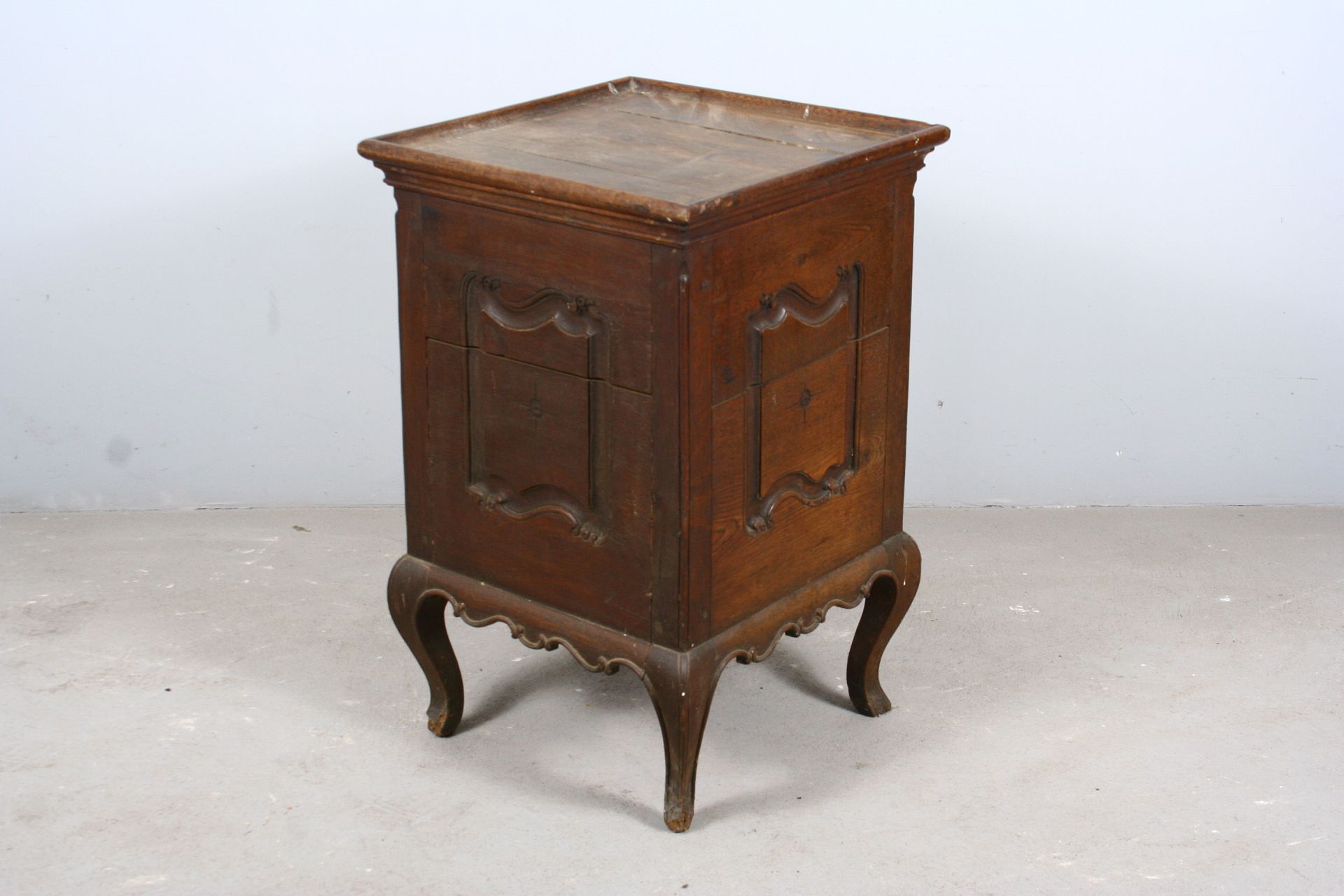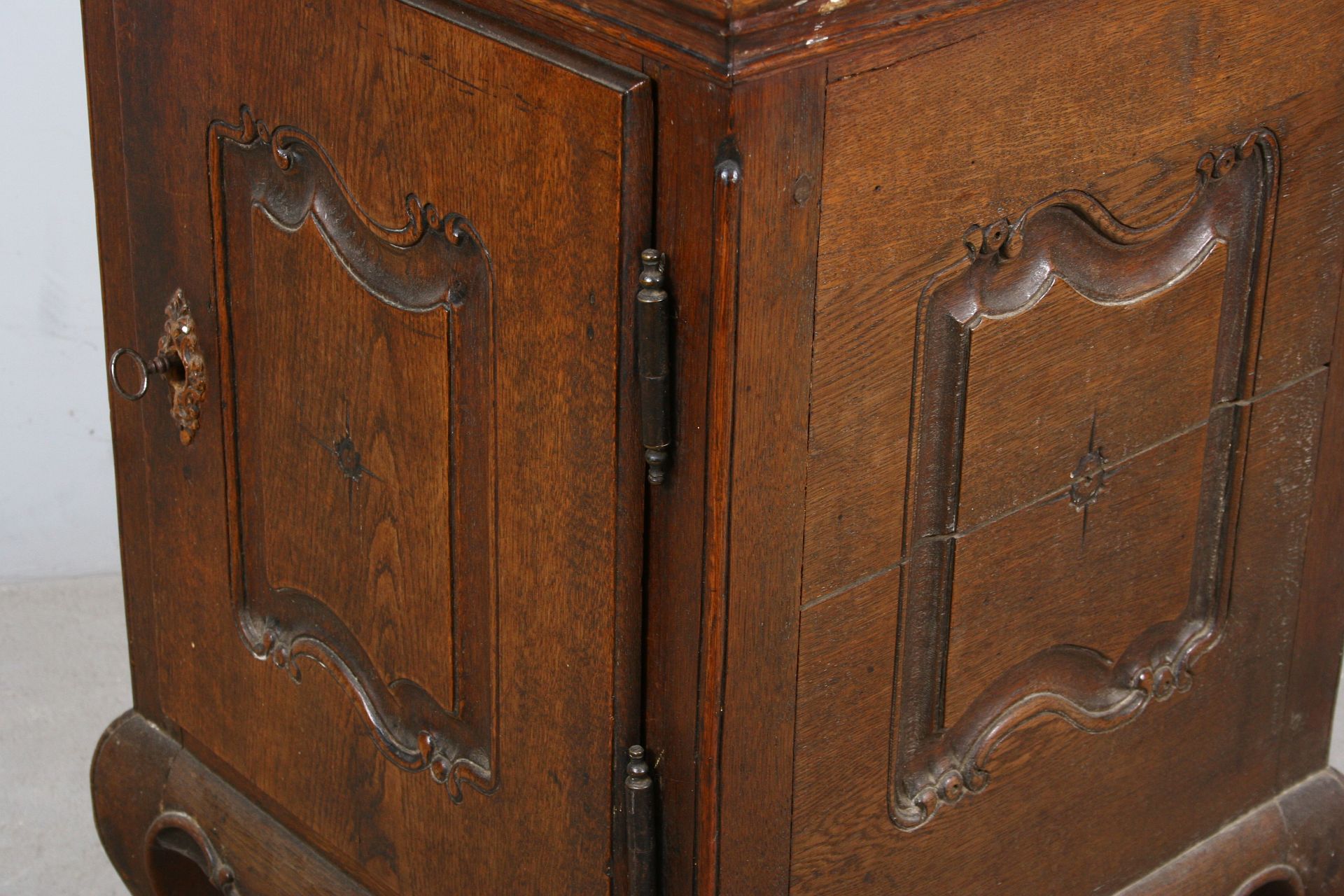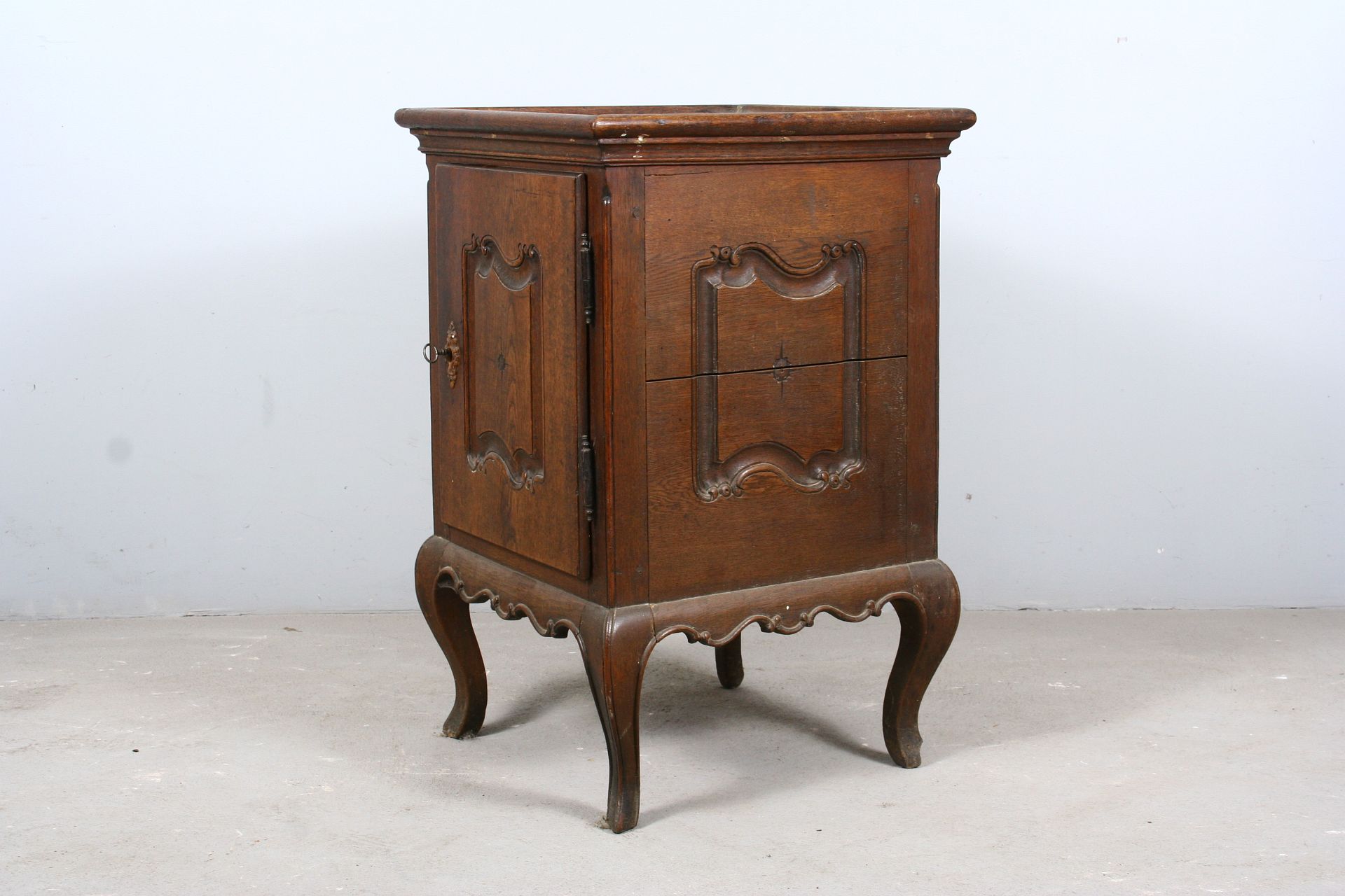 skříňka do prostoru z dubového masivu na čtyřech kozích nožkách, patrně určená pro umyvadlo v místnosti, zdobená ze všech čtyř stran řezanými kartušemi rokajovitých tvarů, staré jehlové panty, vše v původním stavu z přelomu 18. a 19. století, 78 x 50 x 50 cm