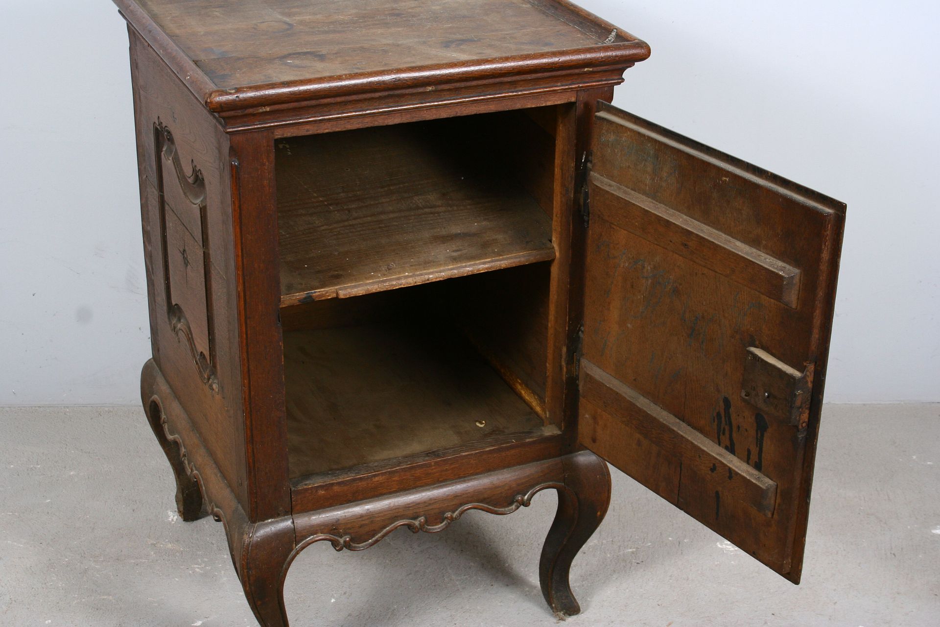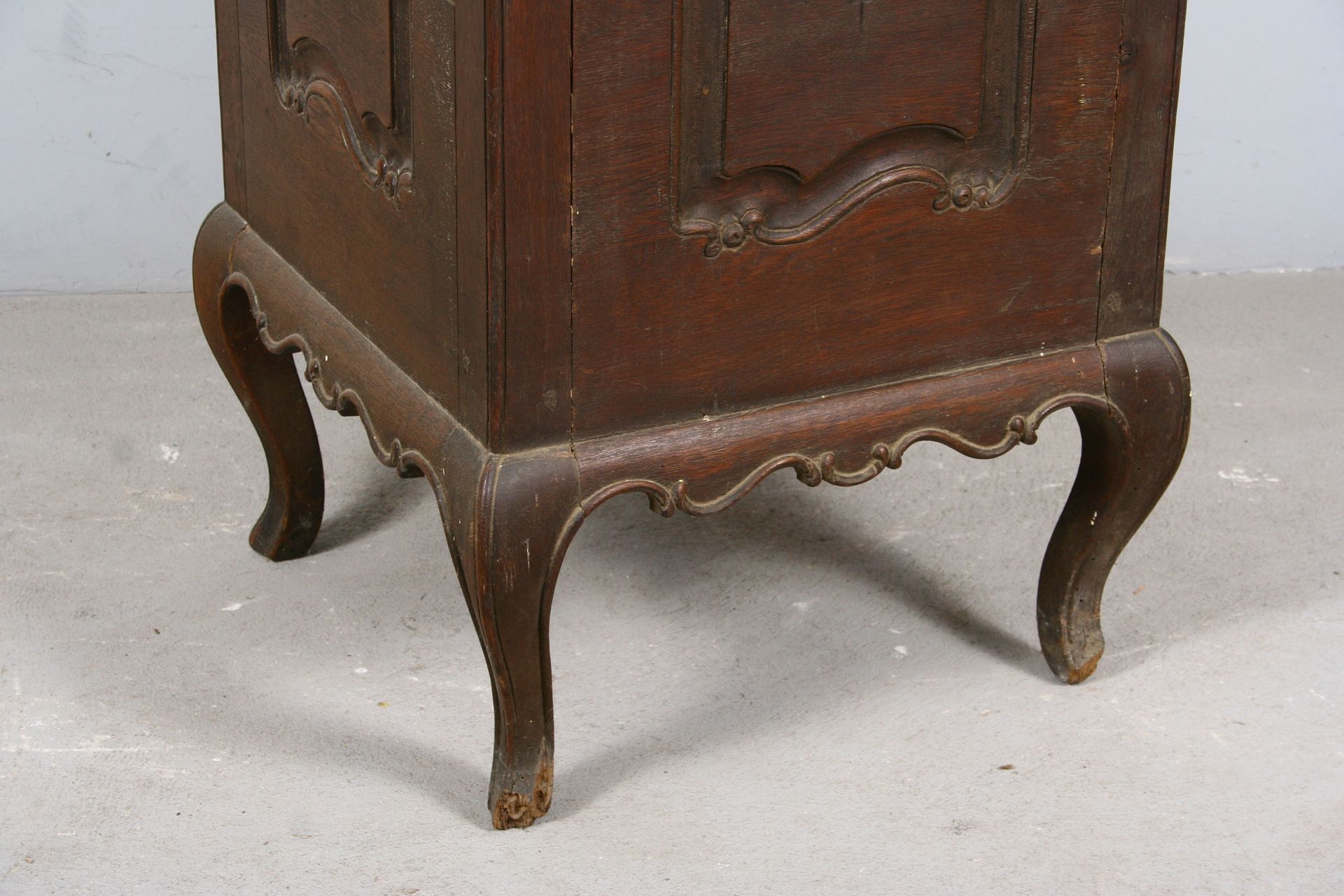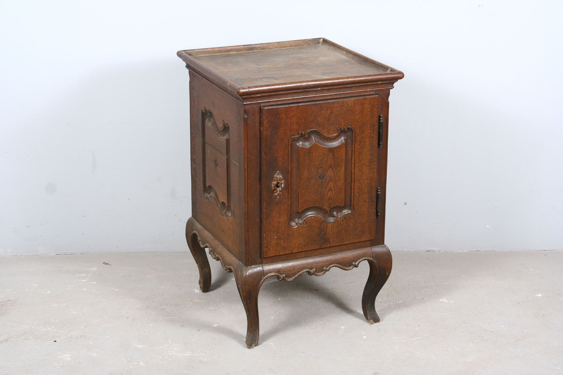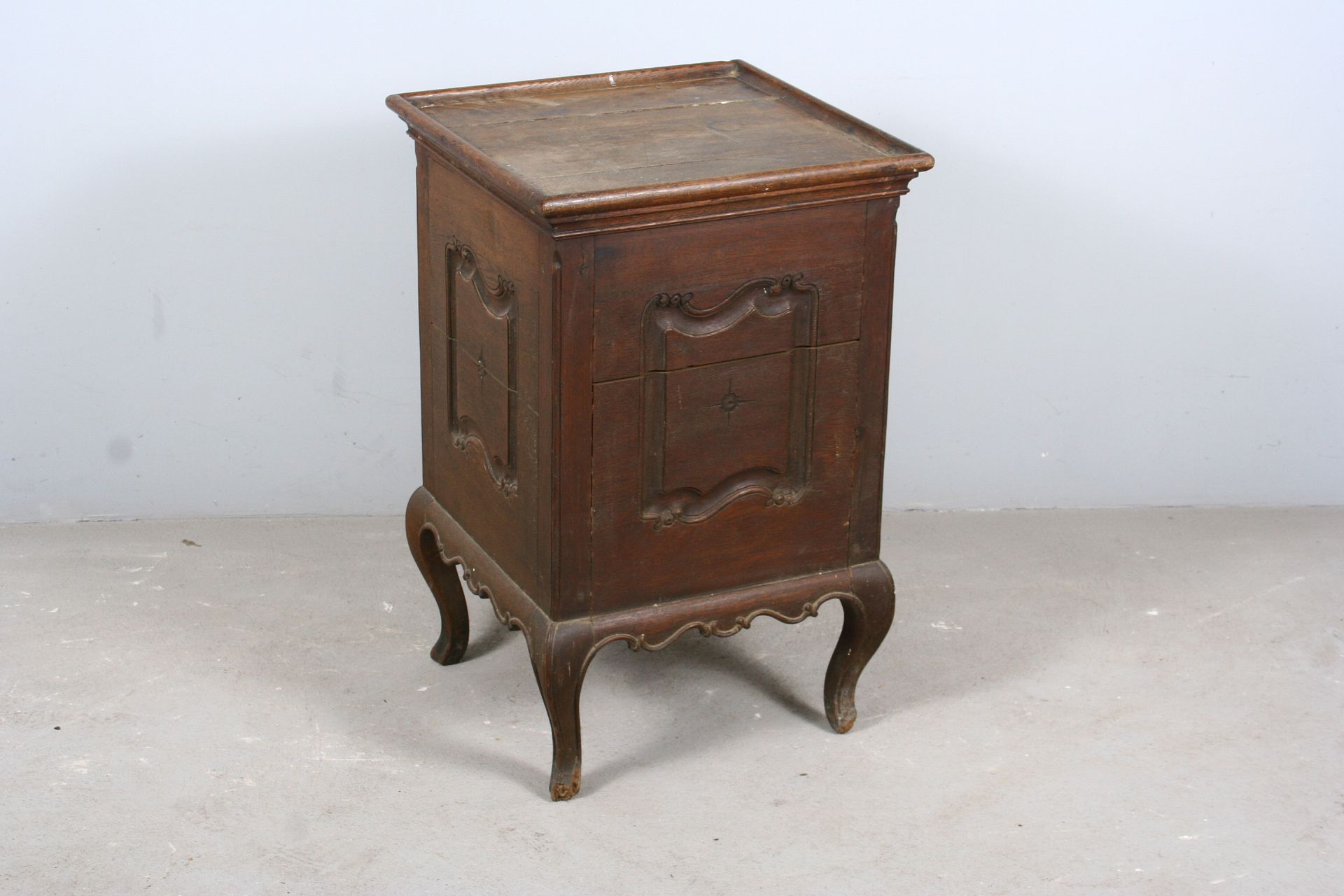 skříňka do prostoru z dubového masivu na čtyřech kozích nožkách, patrně určená pro umyvadlo v místnosti, zdobená ze všech čtyř stran řezanými kartušemi rokajovitých tvarů, staré jehlové panty, vše v původním stavu z přelomu 18. a 19. století, 78 x 50 x 50 cm