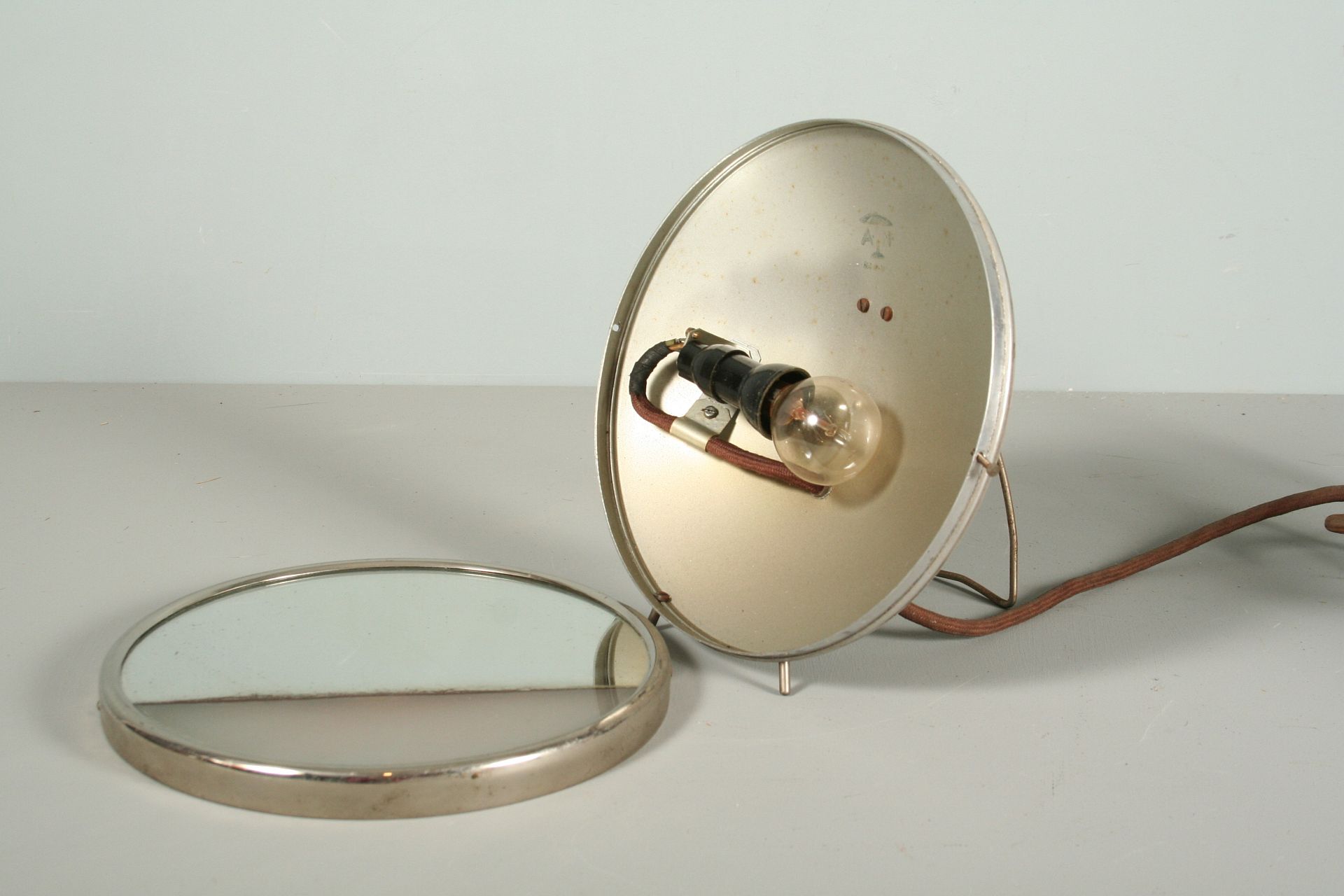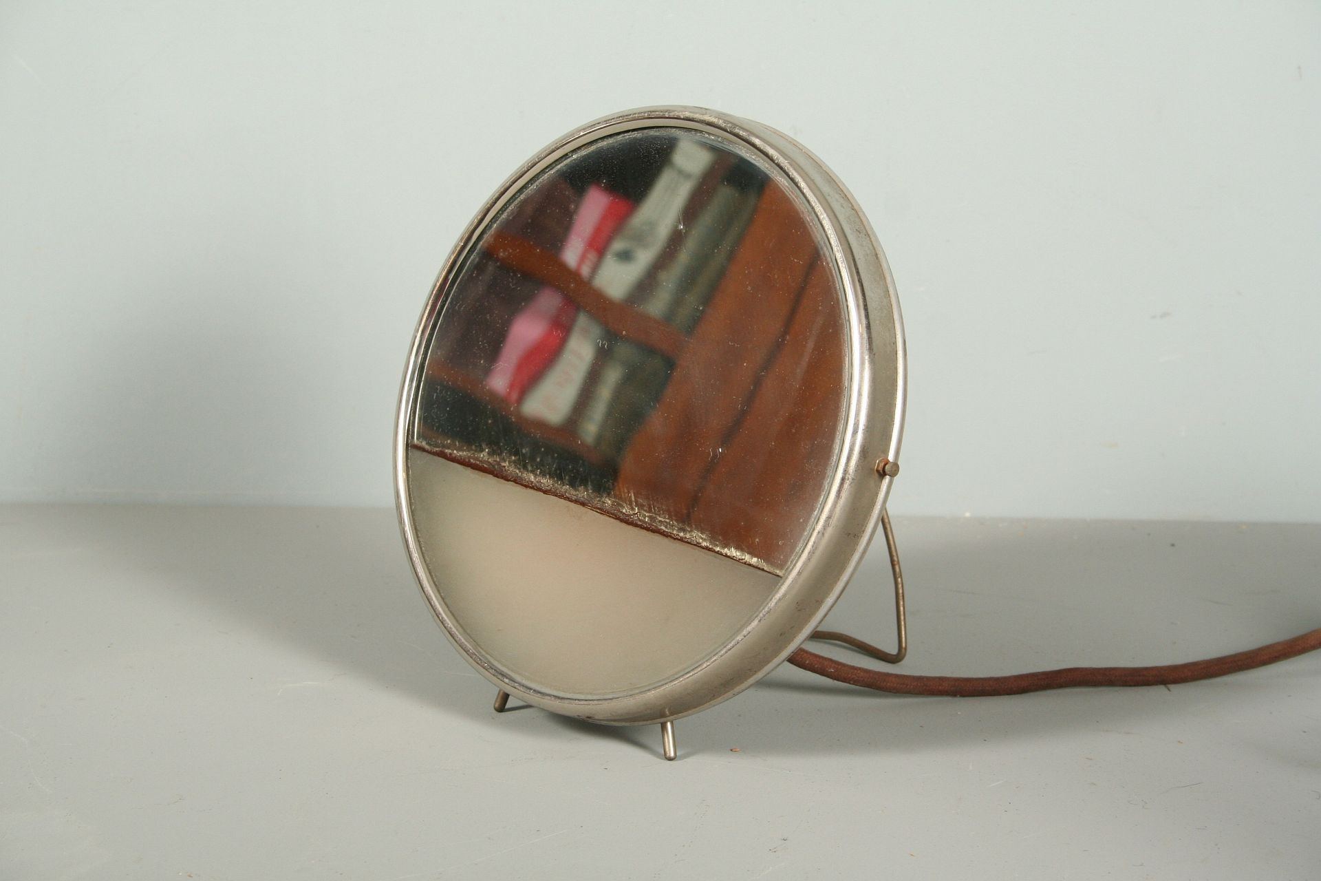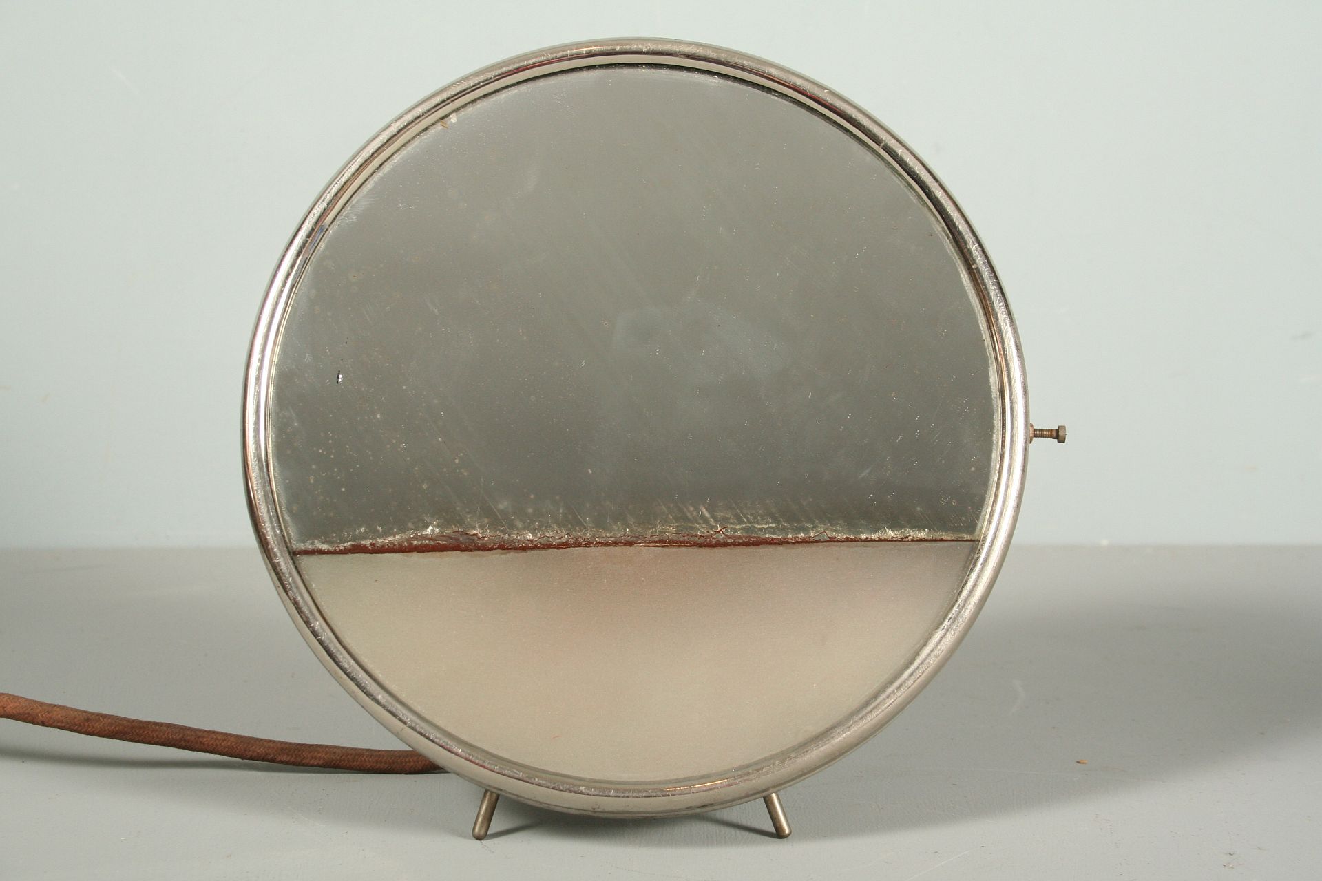 funkcionalistická kovová lampa se zrcadlem ve tvaru reflektoru z auta, nebo motorky, vrchní 2/3 zrcadlo a spodní třetina matně prosklená, chromovaný rámeček na nožkách, vzadu výkloný stojan s možností zavěšení, 23 cm, pochází z funkcionalistického interiéru 1. polovina 20. století, funkční zcela původní stav, nutná revize elektoinstalace