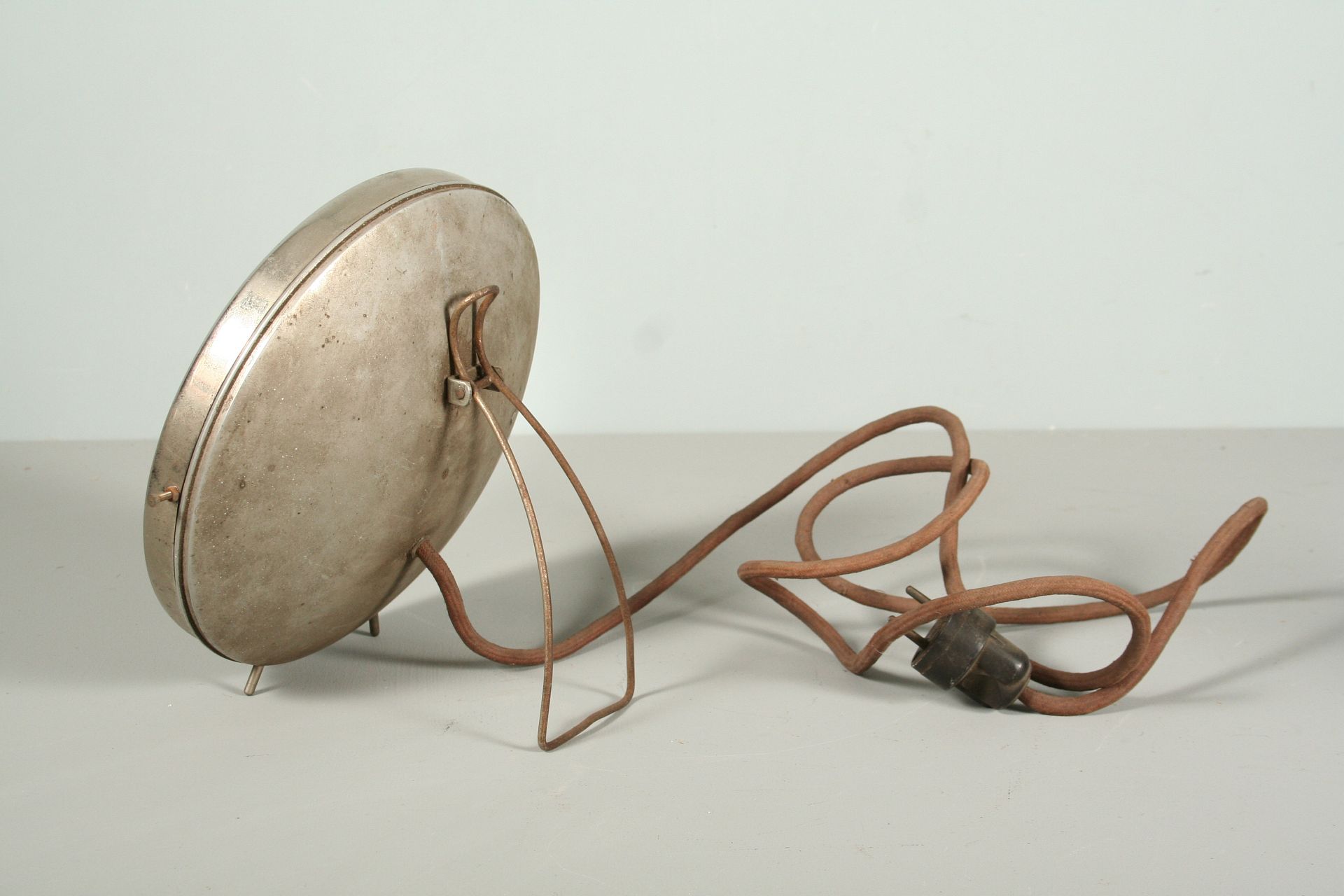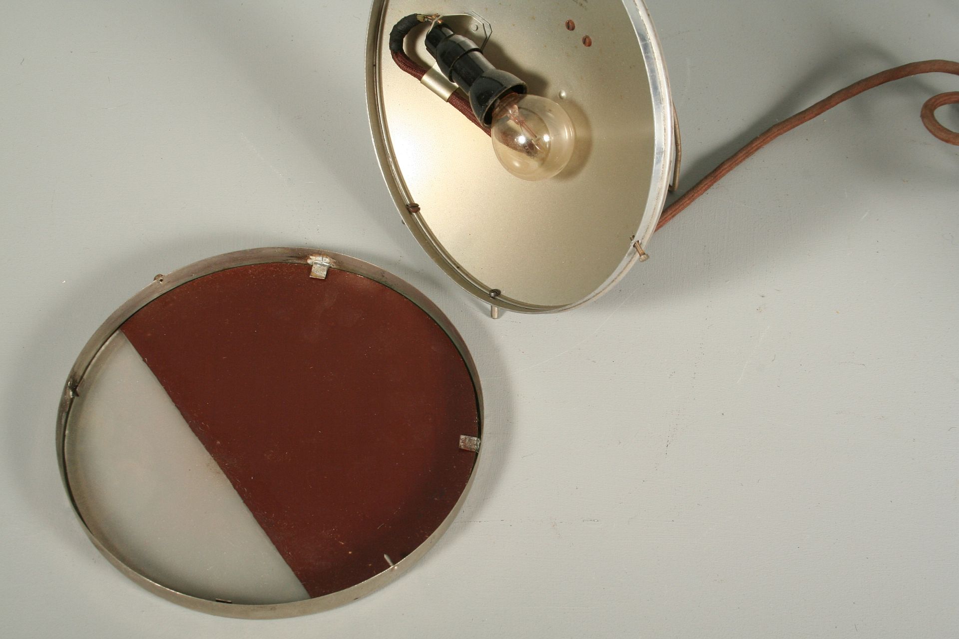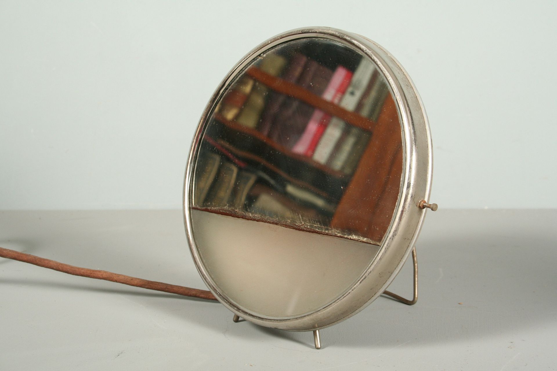 funkcionalistická kovová lampa se zrcadlem ve tvaru reflektoru z auta, nebo motorky, vrchní 2/3 zrcadlo a spodní třetina matně prosklená, chromovaný rámeček na nožkách, vzadu výkloný stojan s možností zavěšení, 23 cm, pochází z funkcionalistického interiéru 1. polovina 20. století, funkční zcela původní stav, nutná revize elektoinstalace