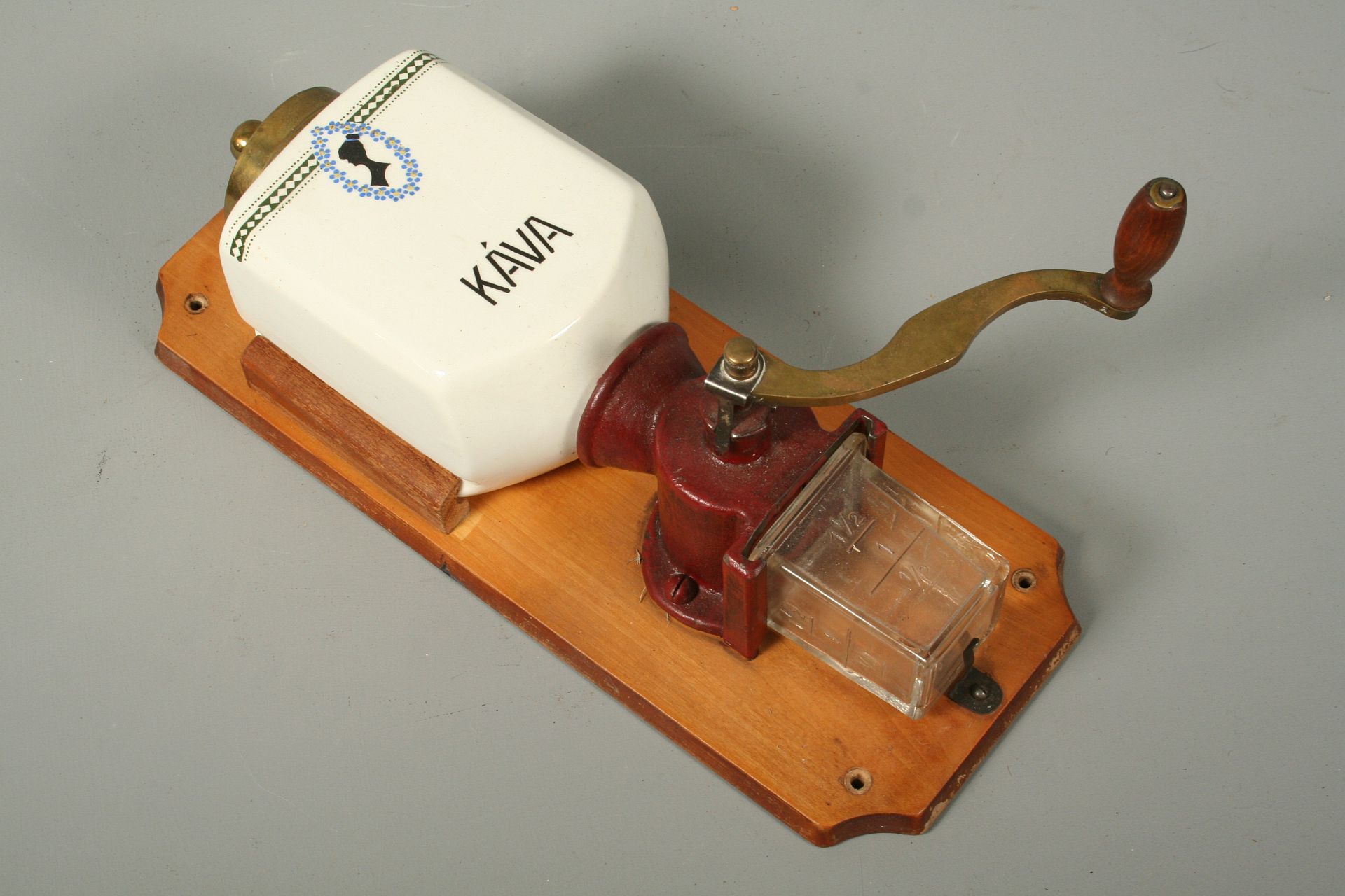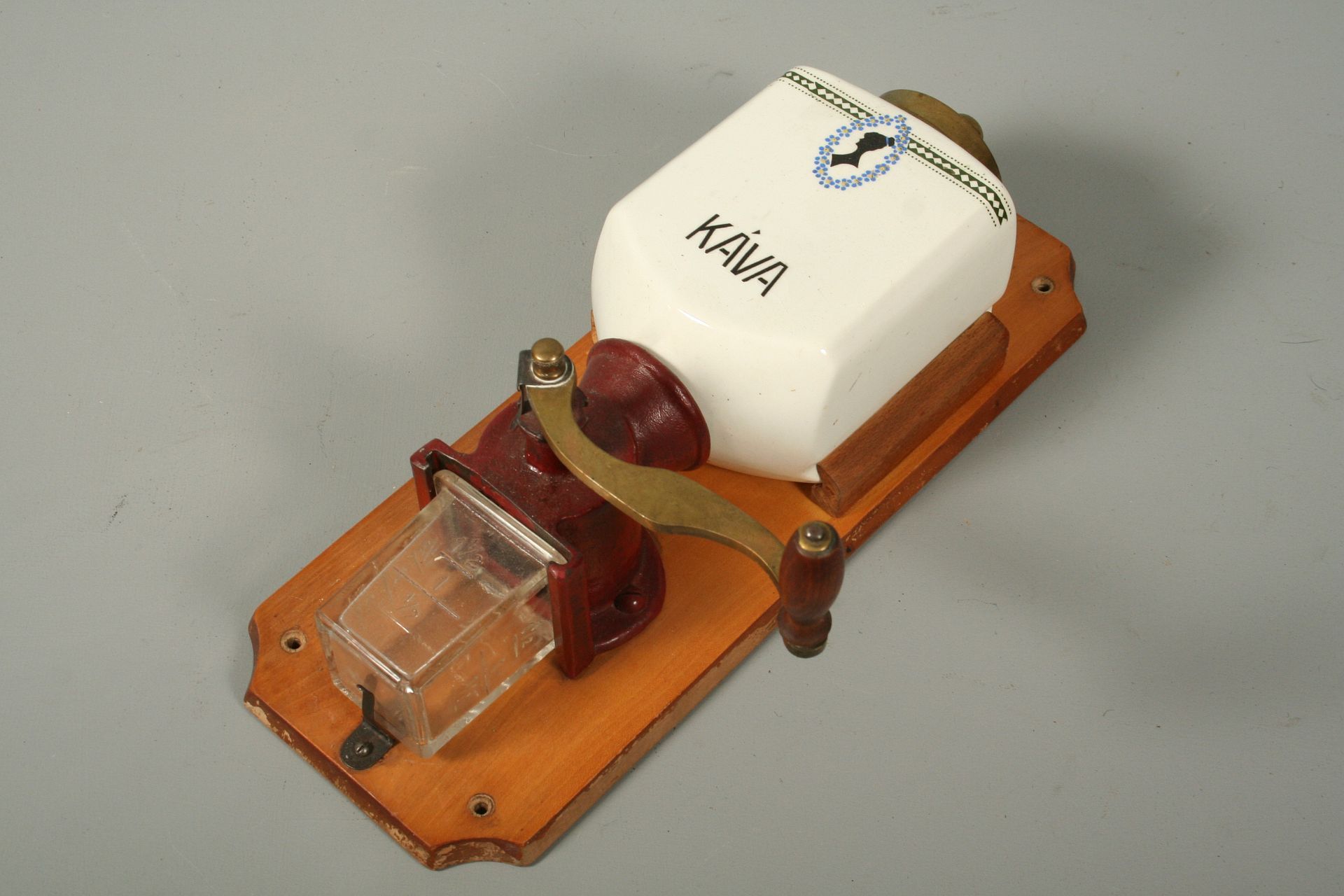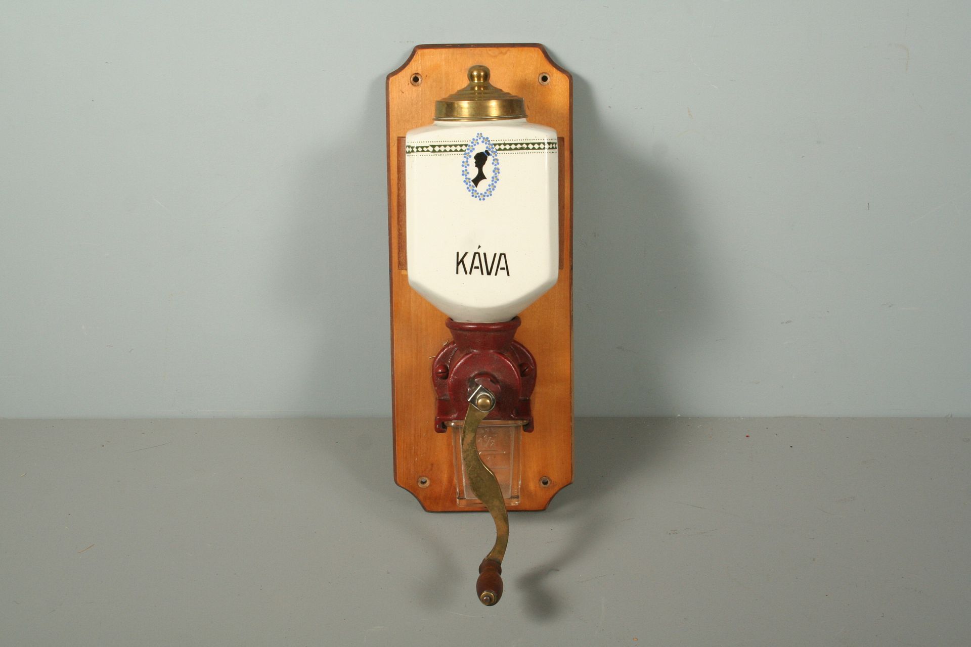 závěsný mlýnek na kávu s nápisem KÁVA a emailem malovaným dekorem, s porcelánovou a skleněnou násypkou, mosazné víčko, porcelán značený zelenou značkou Klenčí, vše v původním nepoškozeném stavu, 37 x 15 cm