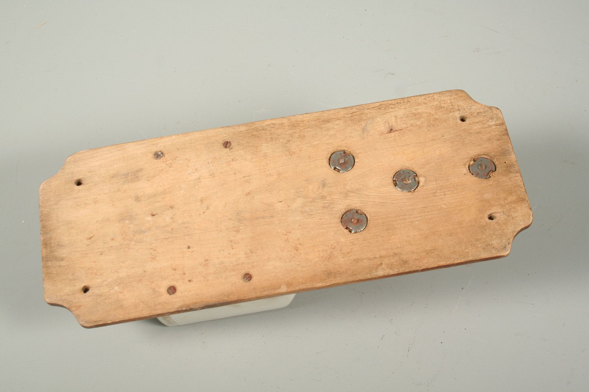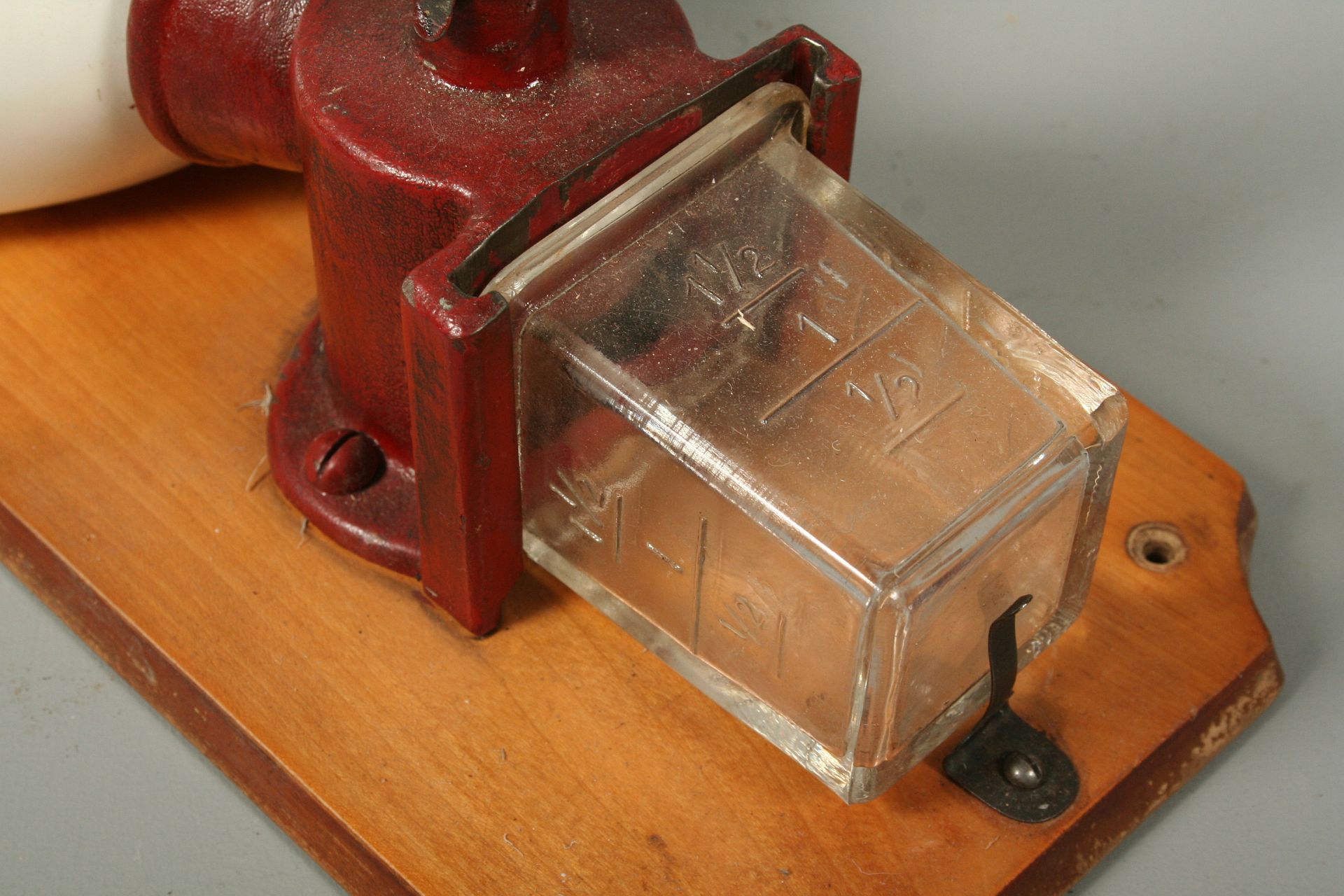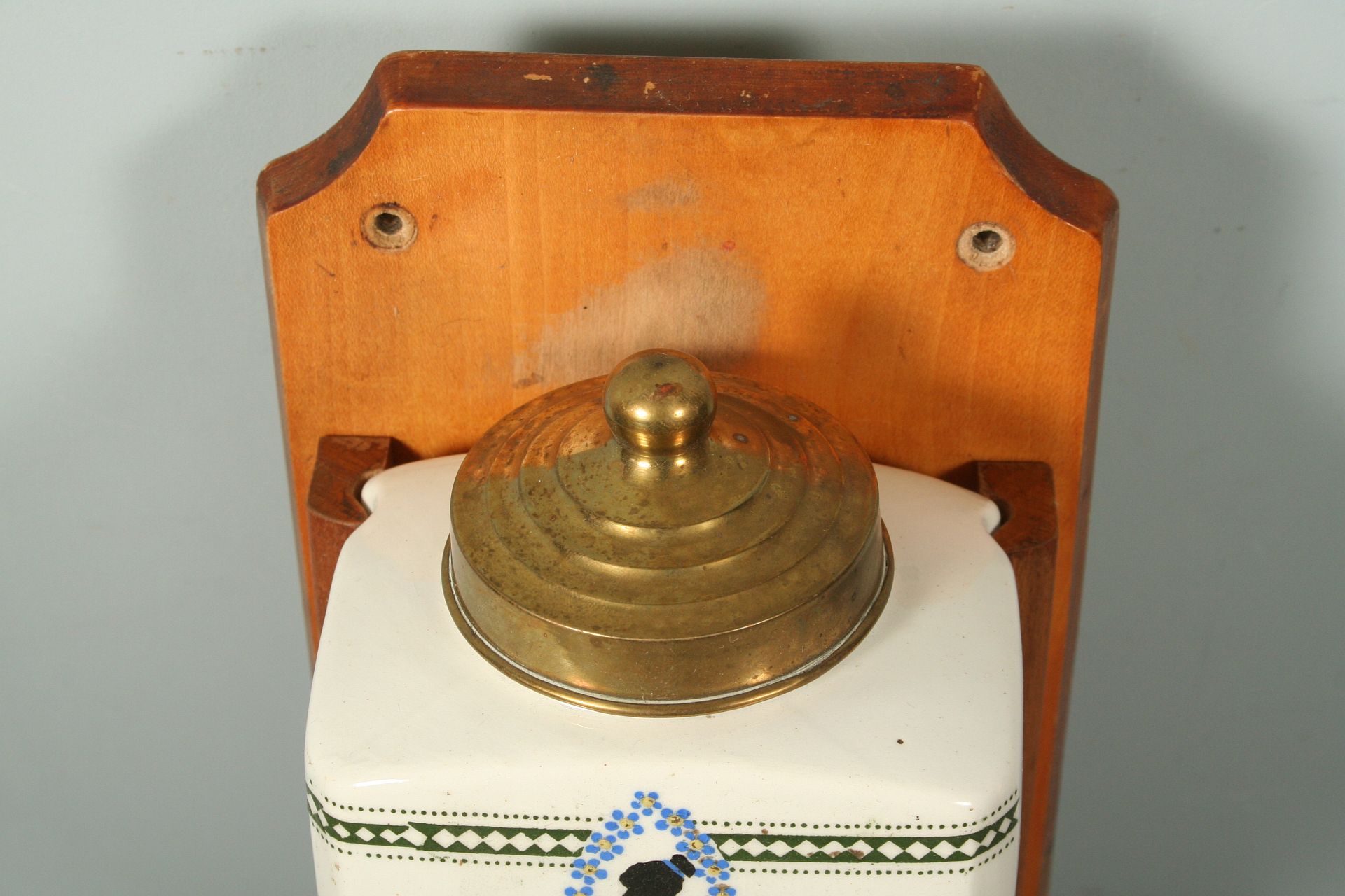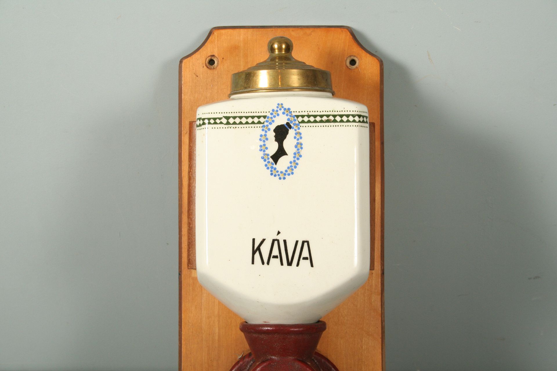 závěsný mlýnek na kávu s nápisem KÁVA a emailem malovaným dekorem, s porcelánovou a skleněnou násypkou, mosazné víčko, porcelán značený zelenou značkou Klenčí, vše v původním nepoškozeném stavu, 37 x 15 cm