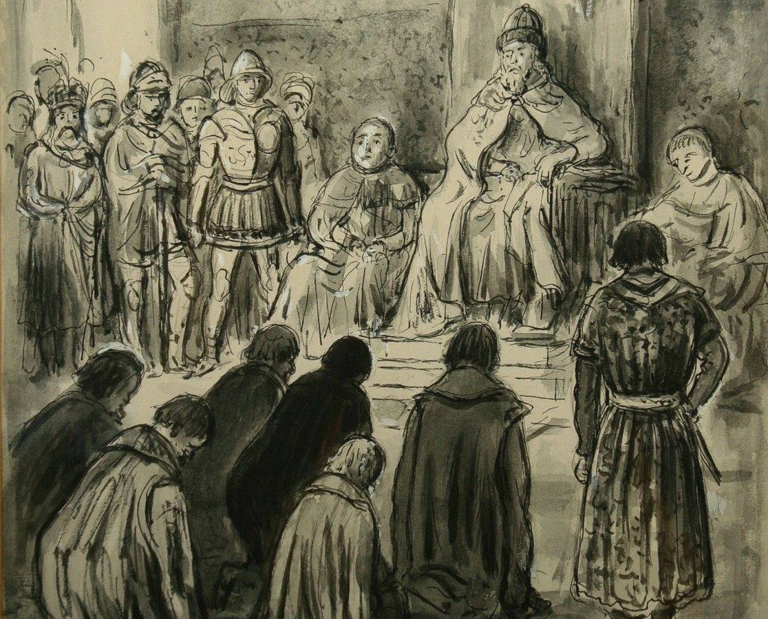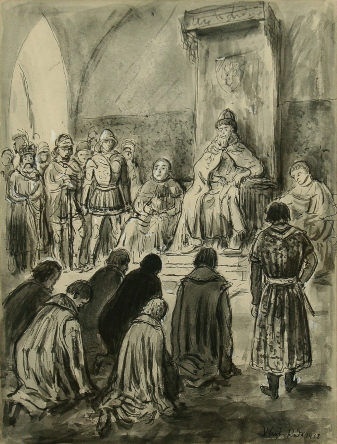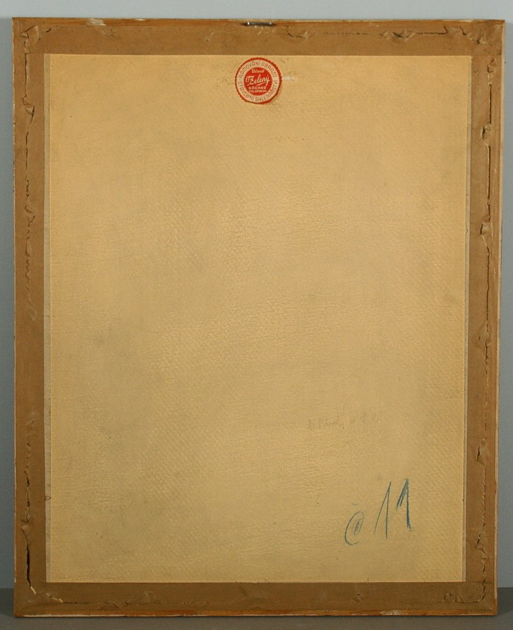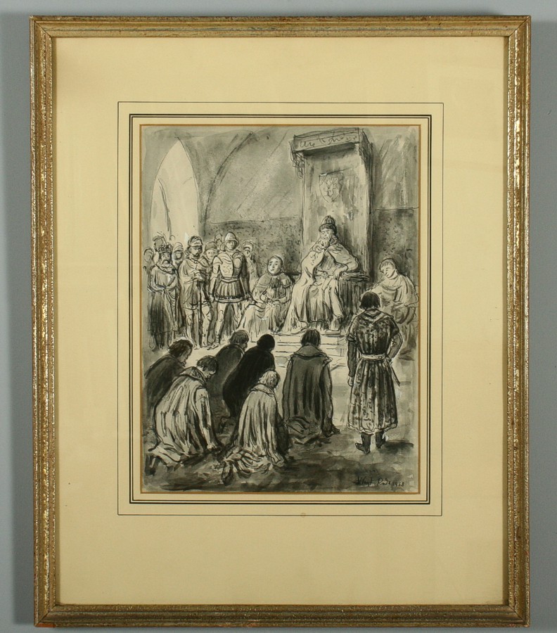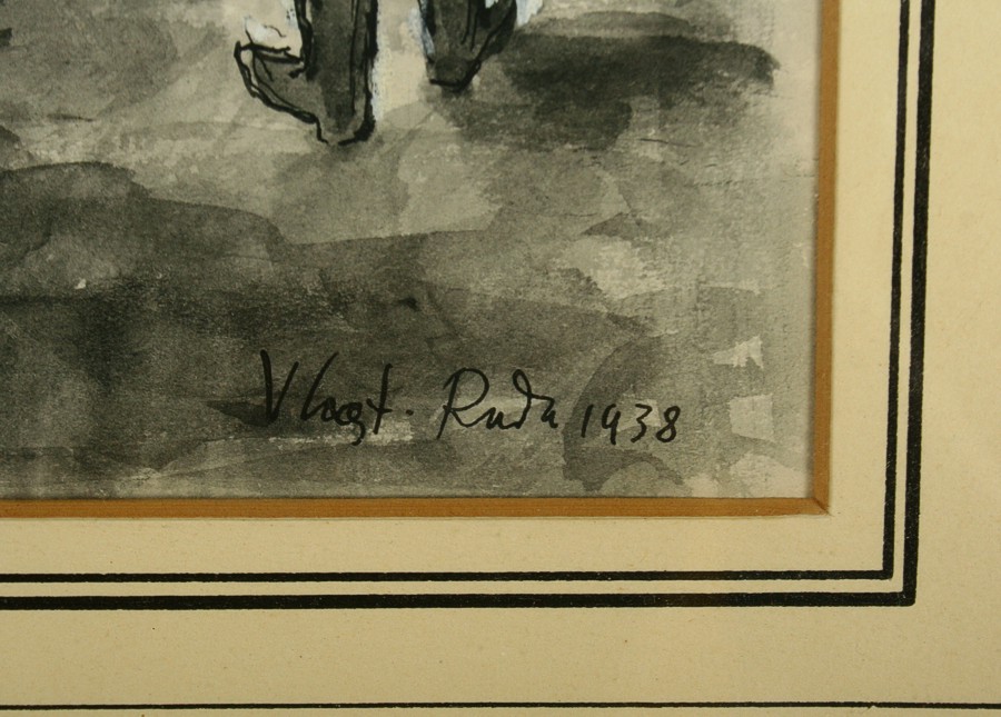 klanění, lavírovaná kresba tuší na papíře, ve výřezu 31,5 x 23,5 cm s rámem 53 x 43 cm, autor Vlastimil Rada, podepsáno vpravo dole tuší Vlast. Rada 1938, rámováno v původní paspartě a rámu pod sklem, vzadu původní štítek rámaře