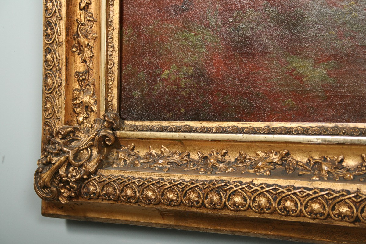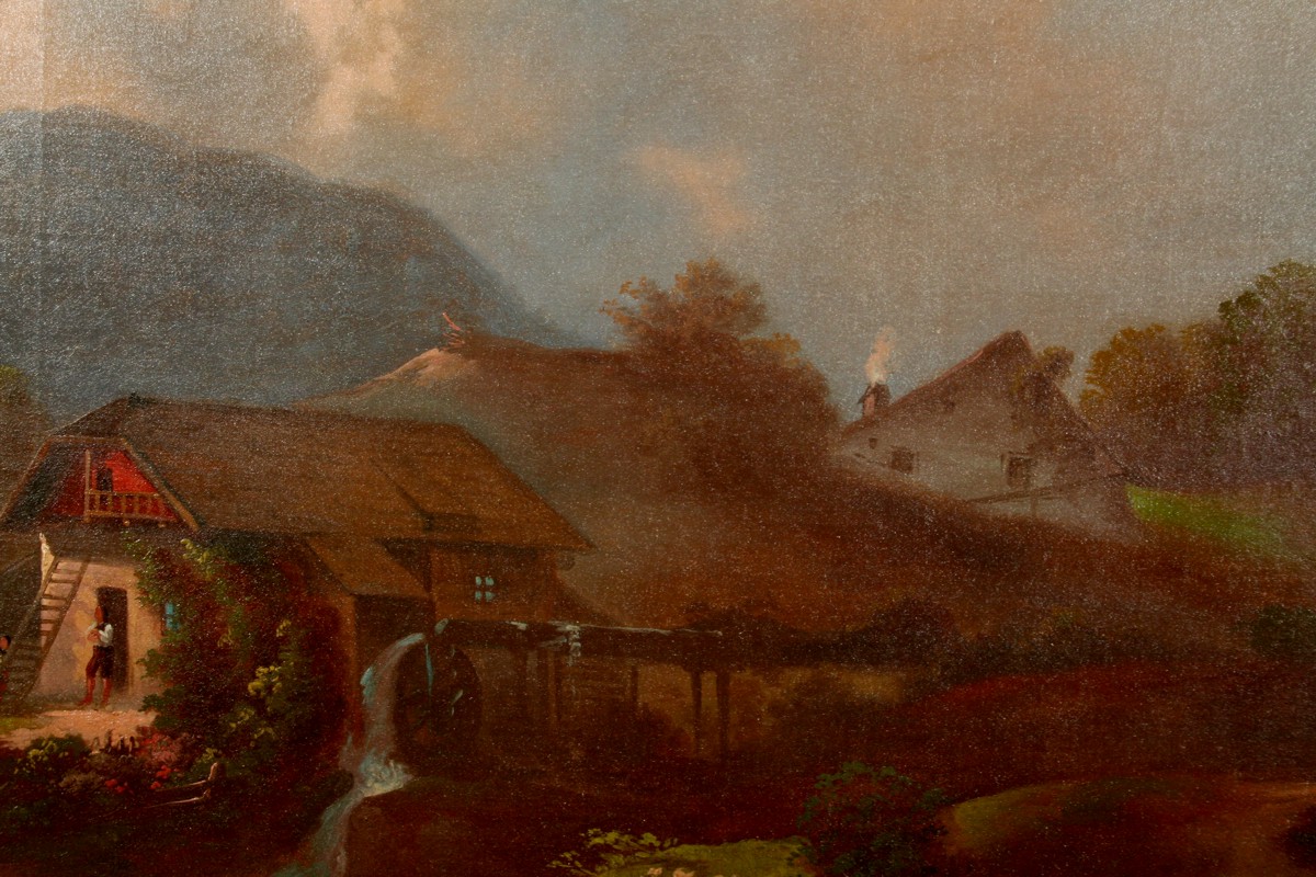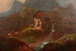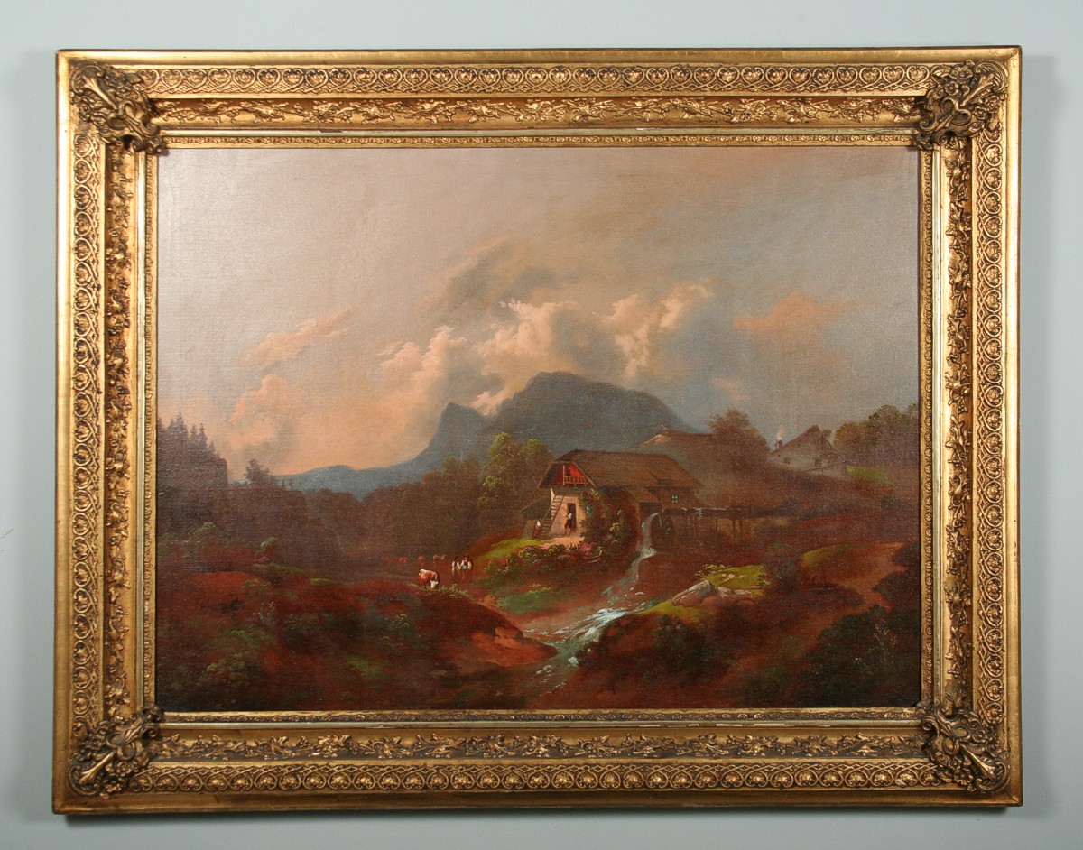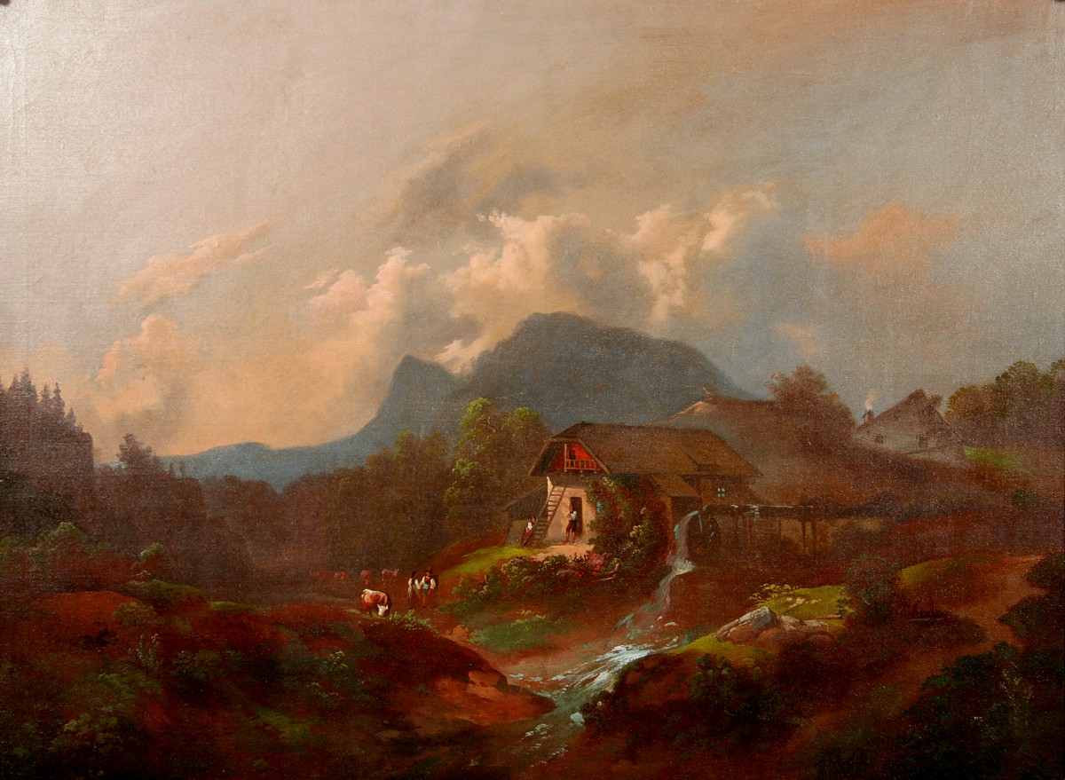 velký obraz romantické krajiny s vodním mlýnem a figurální stafáží datovaný 1862, olej na plátně 72 x 98, s rámem 98 x 122 cm, autor neznámý, podepsáno v pravé dolní části NB 62 nebo to může být N a němeské S, kvalitní malba z poloviny 19. století, obraz pochází ze šlechtické rodiny, rámováno v původním zdobeném a zlaceném rámu, obraz byl odborně a profesionálně restaurován, plátno původní po okrajích zpevněno novým, perfektní stav celého díla