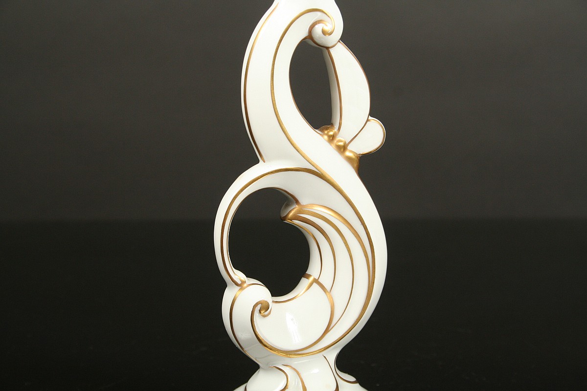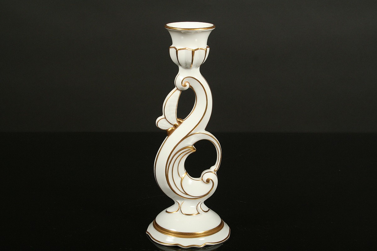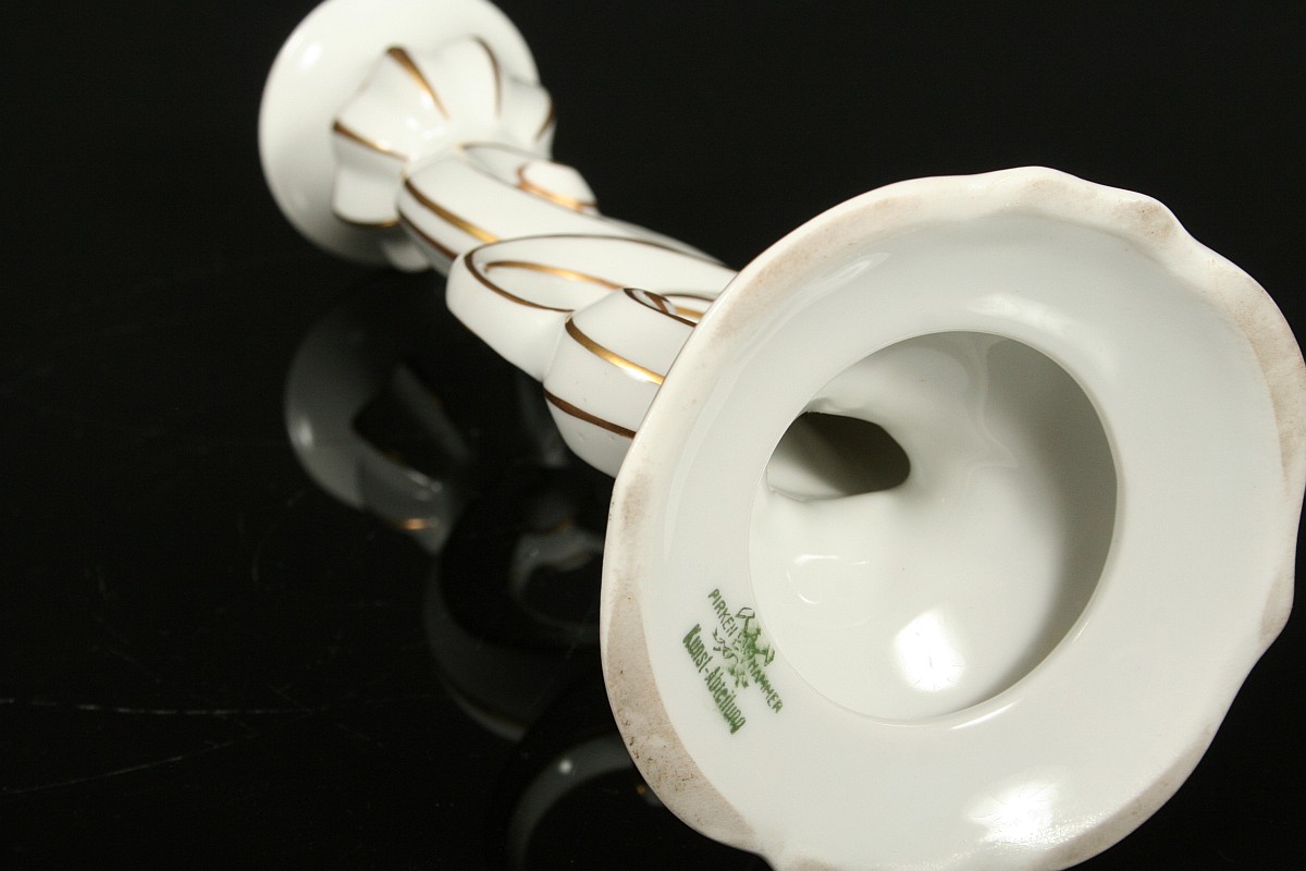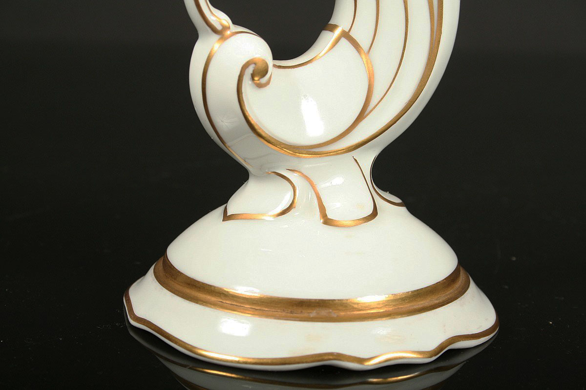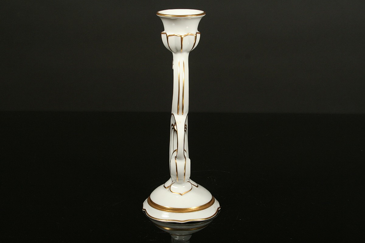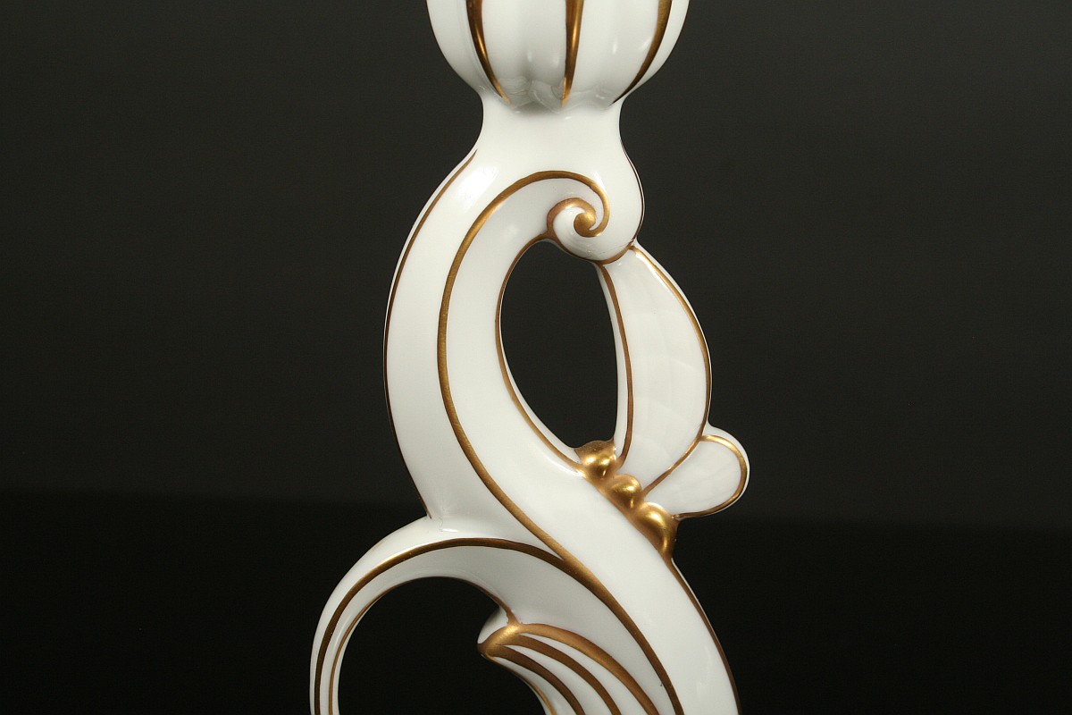 jednoplamenný porcelánový svícen ve stylu art deco, bílý glazovaný porcelán, zlacené detaily, značený tištěnou značkou Pirkenhammer umělecký návrh, 22 cm